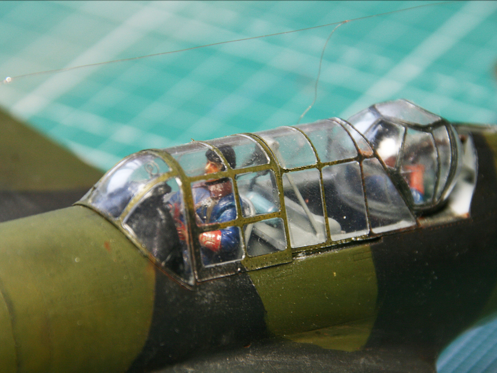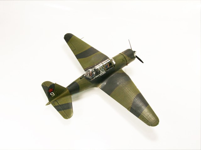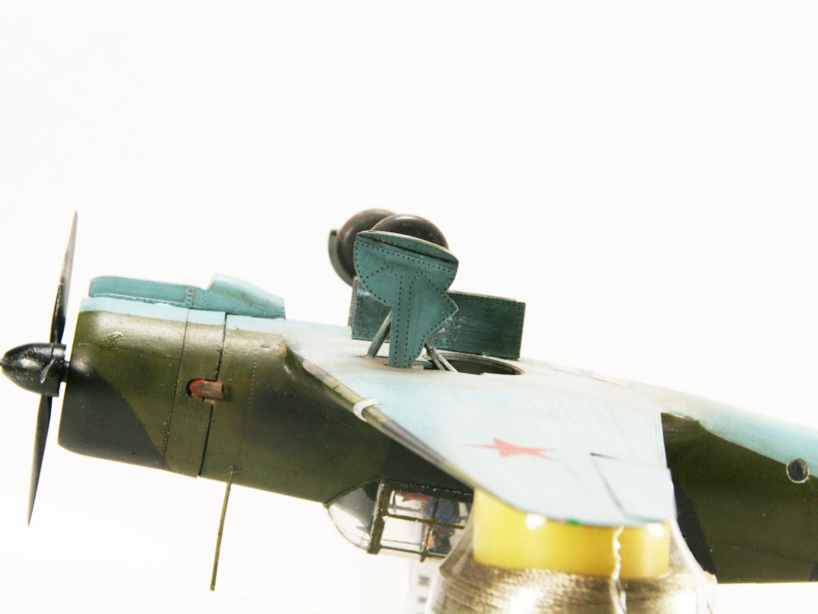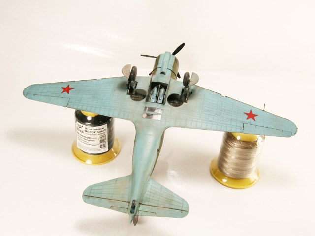 Модель собрана практически "изкаропка", добавлены БАНО (Elf), травление (Eduard), декали (Begemot), родная трубка ПИТО была сломана в процессе постройки и заменена на иглу, стойка антенны - игла, высверлены отверстия под пулеметы и тоже вставлены иглы, антенна - жилка провода из кабеля для наушников.