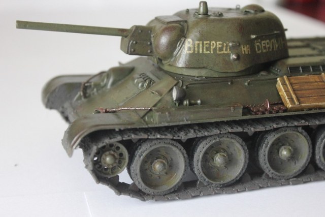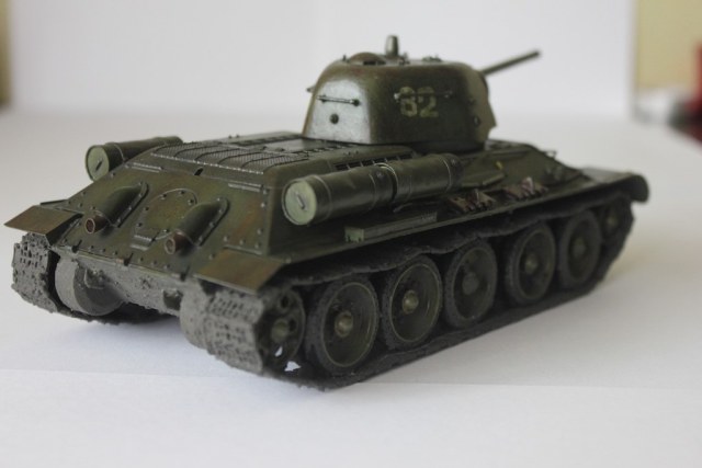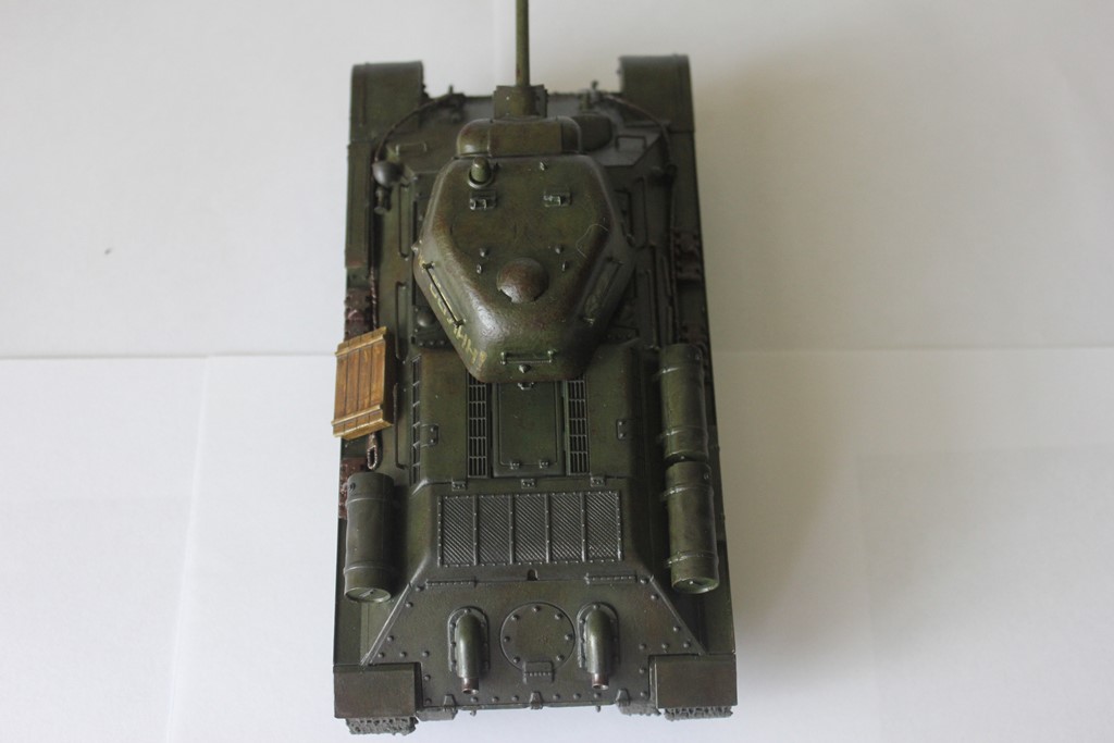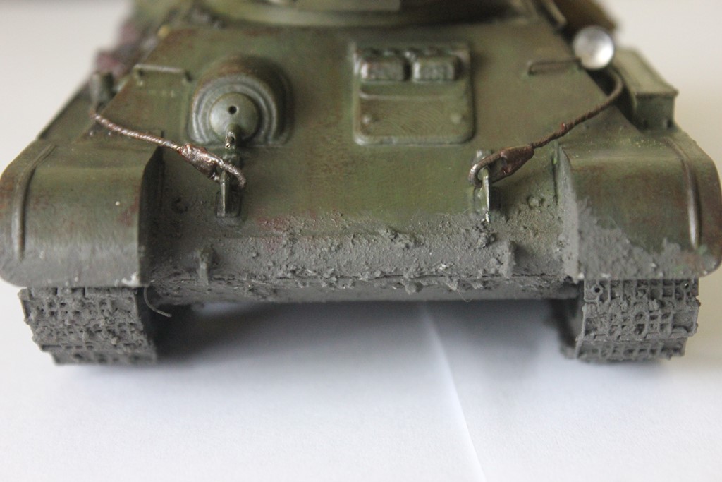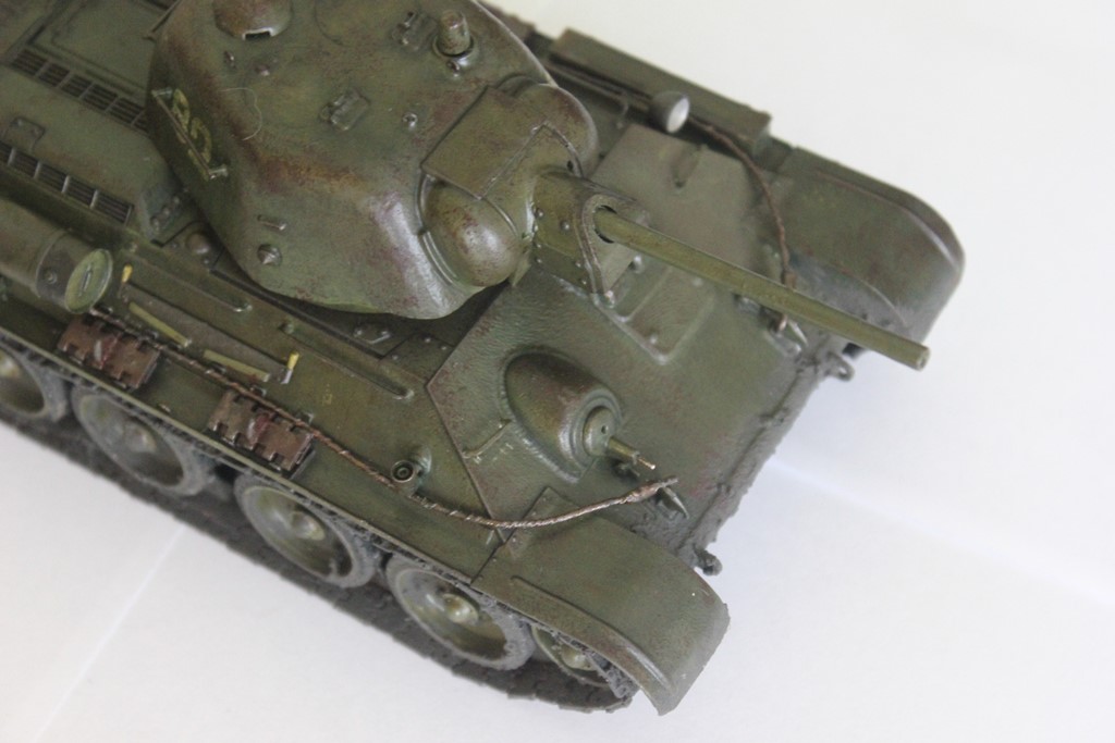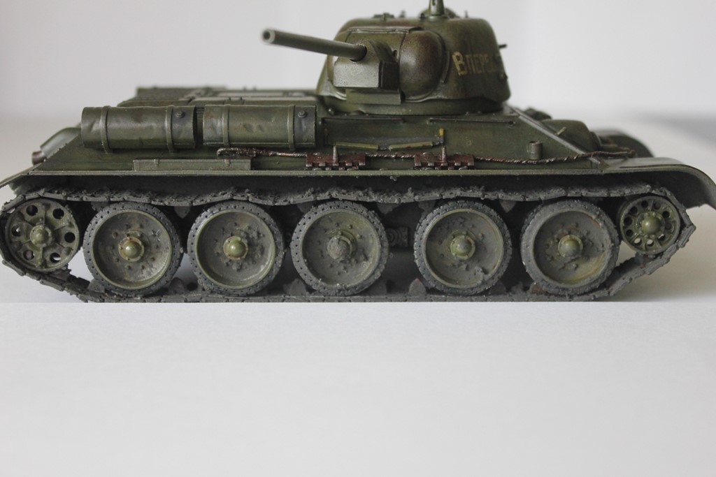 Очень глянцево получилось, нужен матовый лак в конце. Для первой модели можно было сделать минимальные косметические изменения - грязеотбойники на Т-34 в таком хорошем состоянии не находились долго и быстро мялись, вырывались, в общем приходили в негодность. Судя по слою грязи на катках и гусеницах её было много и она была жидкой, тогда грязь должна была набиться и на полки надгусеничные. Выхлопные патрубки ржавели быстро, а дизельный выхлоп черный и маслянистый оседал на броне. И как мне кажется нужна таки ручка на круглом трансмиссионном люке.
