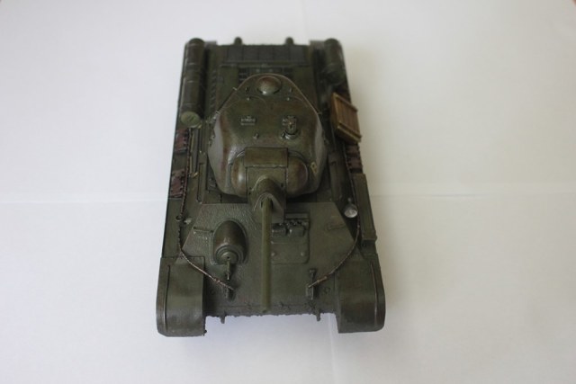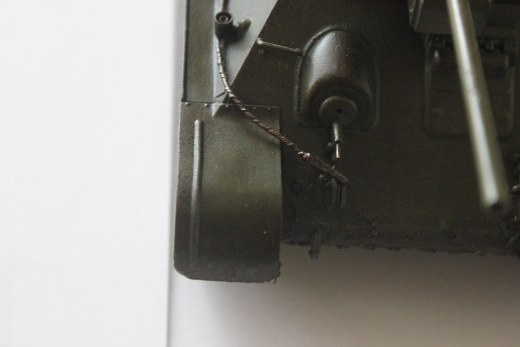По описанию работы Автором - матчасть не трогаю. Только про исполнение! Трос - или надо купить готовый, или плести как настоящий, а он состоит из трех прядей, каждую плести отдельно по часовой, а потом свить вместе - против. Все предметы снабжения, как зап. траки или ящик из под тушенки, крепились или спец. ремнями или прикручивались проволокой. Очень не хватает оптики - надо было открыть "реснички" мехвода и вклеить под них приборы наблюдения - например из CD-диска. Один из способов поиска танков разведывательной авиацией - блики оптики. Фото надо хотя бы первую - сделать с "высоты роста человека" - то-есть ось объектива должна быть не выше 45 мм. И ещё - копоть и нагар от выпускных труб, да и сами трубы у живых машин покрываются ржавчиной после первой поездки. Сетку над ТО менять на "настоящую" обязательно. Успехов с Т-34-85 от Звезды!