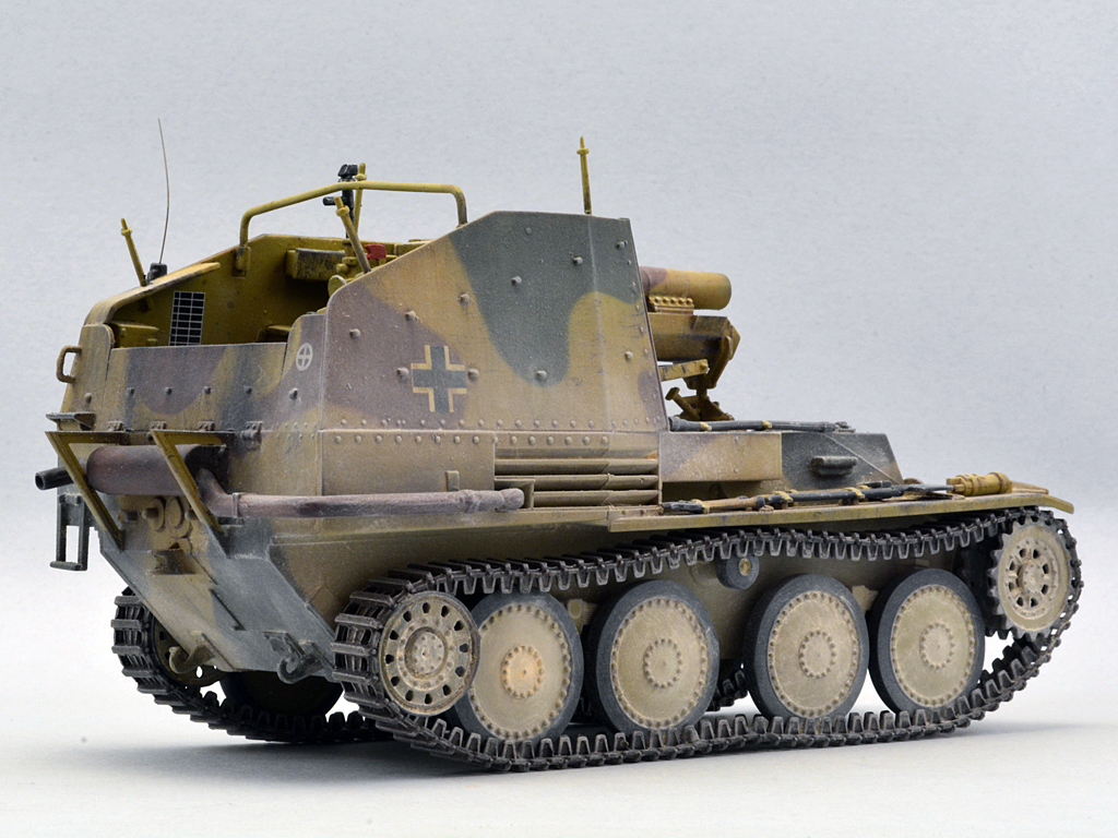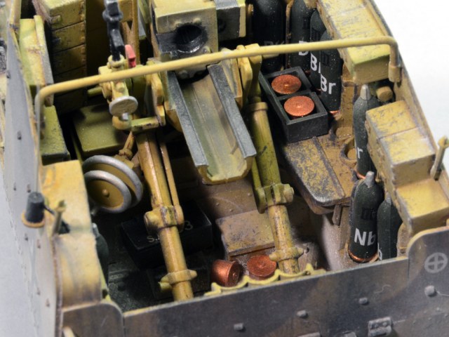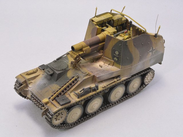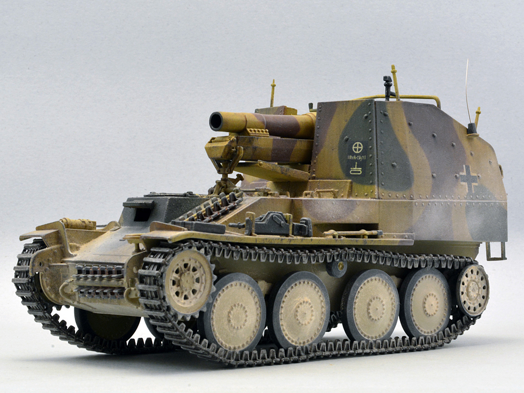 Красил акрилом Tamiya. База xf-60 (темно желтый). Камуфляж xf-64 (красно-коричневый) и xf-58(оливково-зеленый). Маски делал из патафикса. Далее фильтр - Р242 от MIG. Масляные точки - Сонет. Смывка - Tamiya. Сколы - 70.822 (черно-коричневый) от Vallejo + слегка xf-56 (серый металлик) и xf-16 (алюминий) от Tamiya. Пигменты от Wilder (дорожная пыль, черный) и Мастер Пигмент (ржавчина).