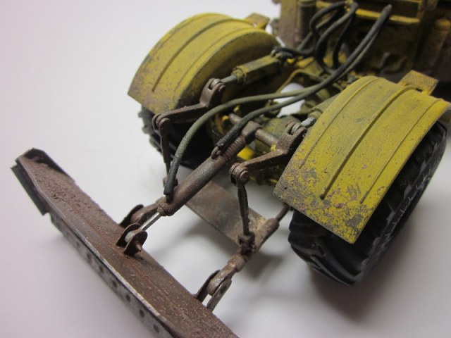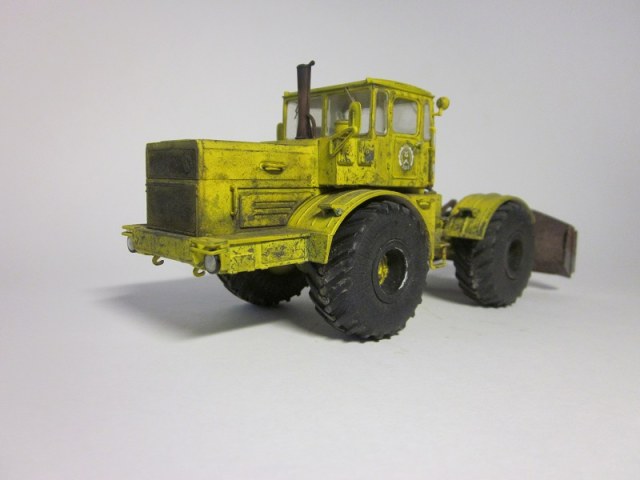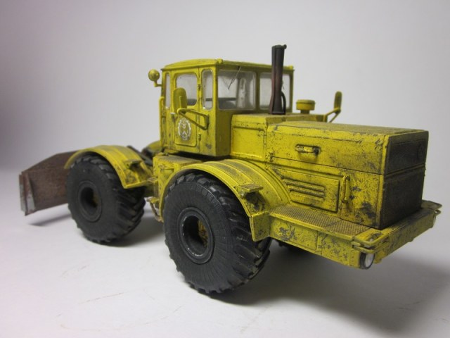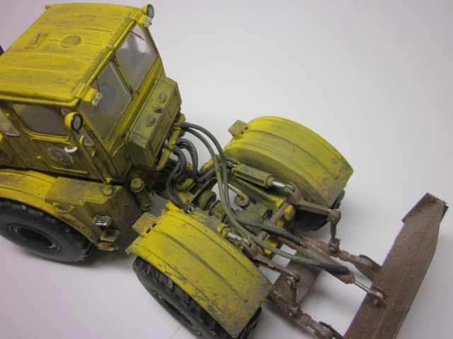 Здравствуйте. Представляю вниманию модель трактора К 701 Кировец с бульдозерным отвалом. Трактор дополнил гидравлическими шлангами, добавил тормозной трубопровод к пневмо-камерам заднего моста. Сделал гидроцилиндр перекоса отвала. Элементы отвала были изготовлены из толстой жести и спаянны между собой. Красил акриловыми красками фирмы Tamiya, использовал пигменты от А-model.