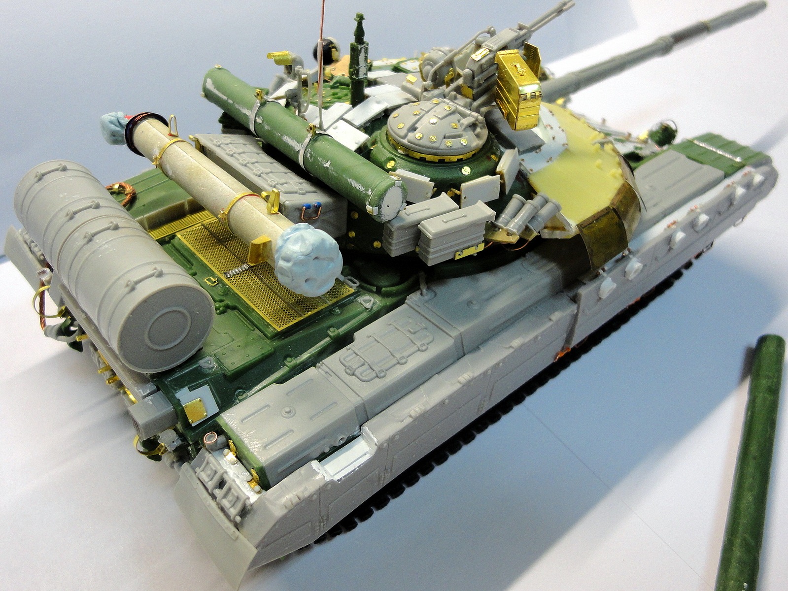 Доработки: список делать не стал всего и не упомню уже просто приложу фото до покраса. Применял пластик от Доширака, травление из запасов Вояджер и всякие запчасти от трумповской 64-ки, оптика из конфити как на прошлой модели, антенна игла, трос трумп покупался давненько и отдельно, одна фара Эльф, траки Мастер клаб обзор на них я делал.