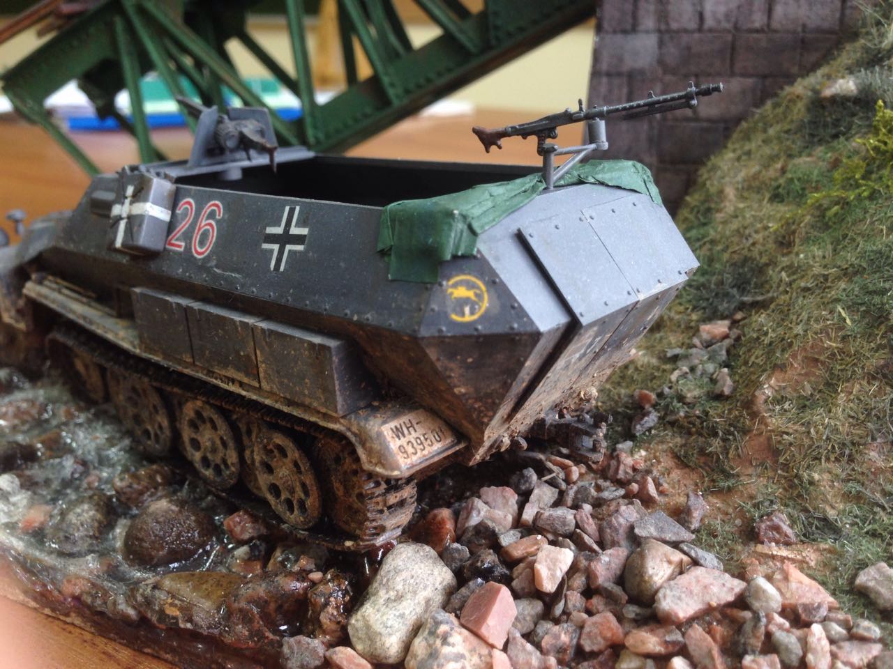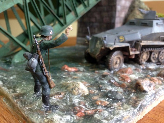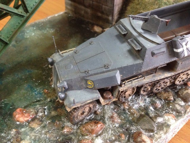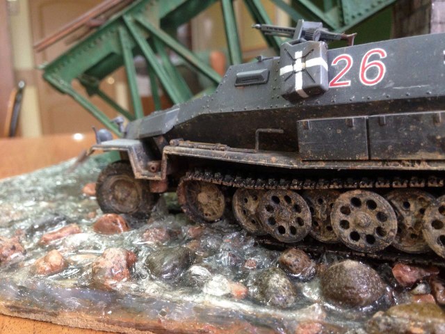 Здесь больше есть на что посмотреть... Вода, камушки, травка - понравилось. Всё остальное тоже есть ещё над чем поработать. Ханомаг очень непростая модель и для начинающего моделиста сложновата, хотя делать и тренироваться надо. Удачи!
