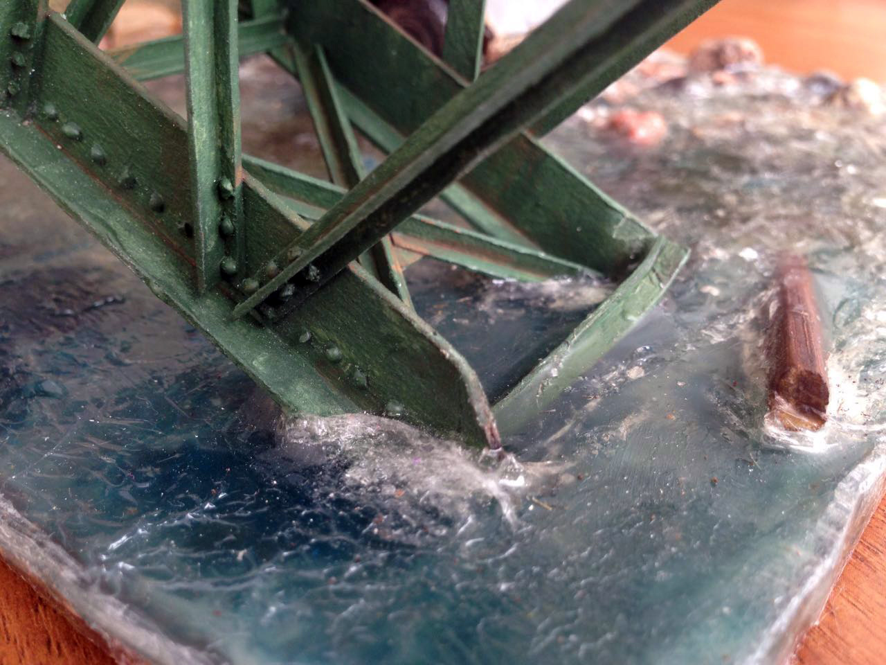 То есть, подытоживаем: вода, камни, берег - на отлично! Мост и рельсы - интересно, трудоёмко, но... незачёт. Во-первых, имхо некрашенные элементы не допустимы. Ну сделайте прям то же самое, только дуньте поверх всей этой темы "дарк айроном" от тамии хотя-бы. Если кому-то тут жалко "ганомаг", который вынужден красться черех поток из-за взорванного моста - не парьтесь, я бы по такому мосту даже на тепловозе не поехал, а на sd.kfz.251 сорвался бы и разбился нафиг насмерть. Старпом всё верно про шпалы написал, да и вообще.