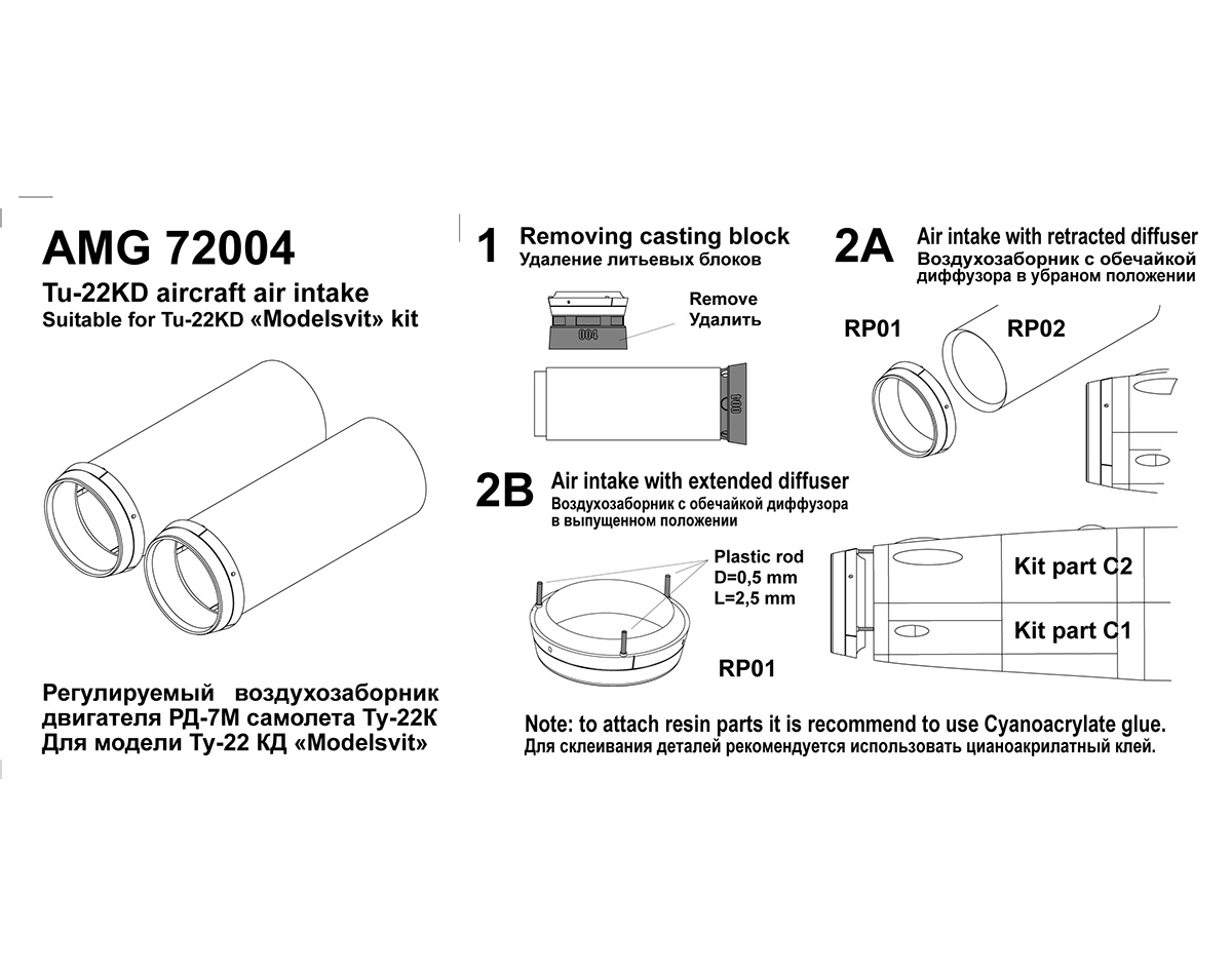Многие давно ждали, и вот, в продажу поступили наборы движков для Моделсвитовского Ту-22КД. Я не оговорился, когда сказал наборы. Дело в том, что производитель поделил двигатель на два набора: Регулируемый воздухозаборник - AMG 72004 и Сопла - AMG 72005.