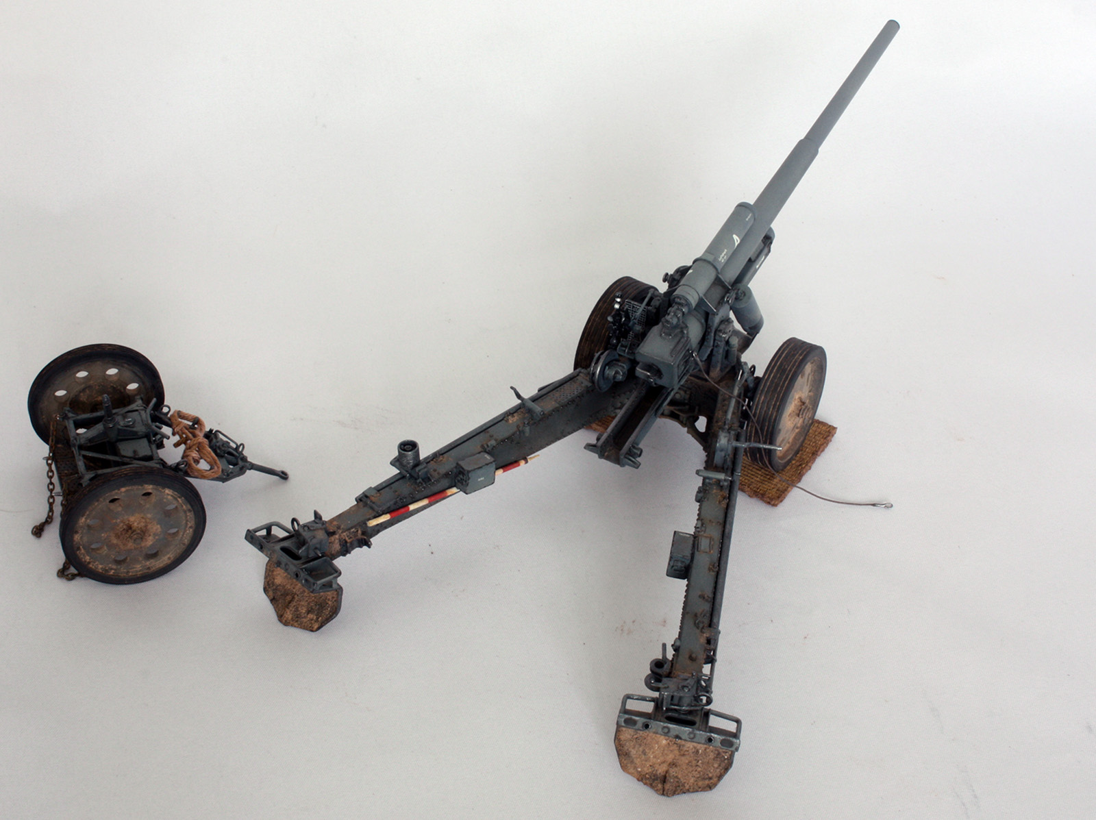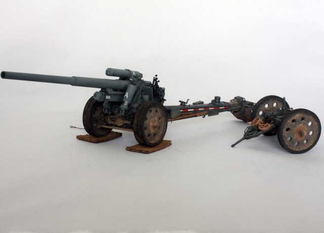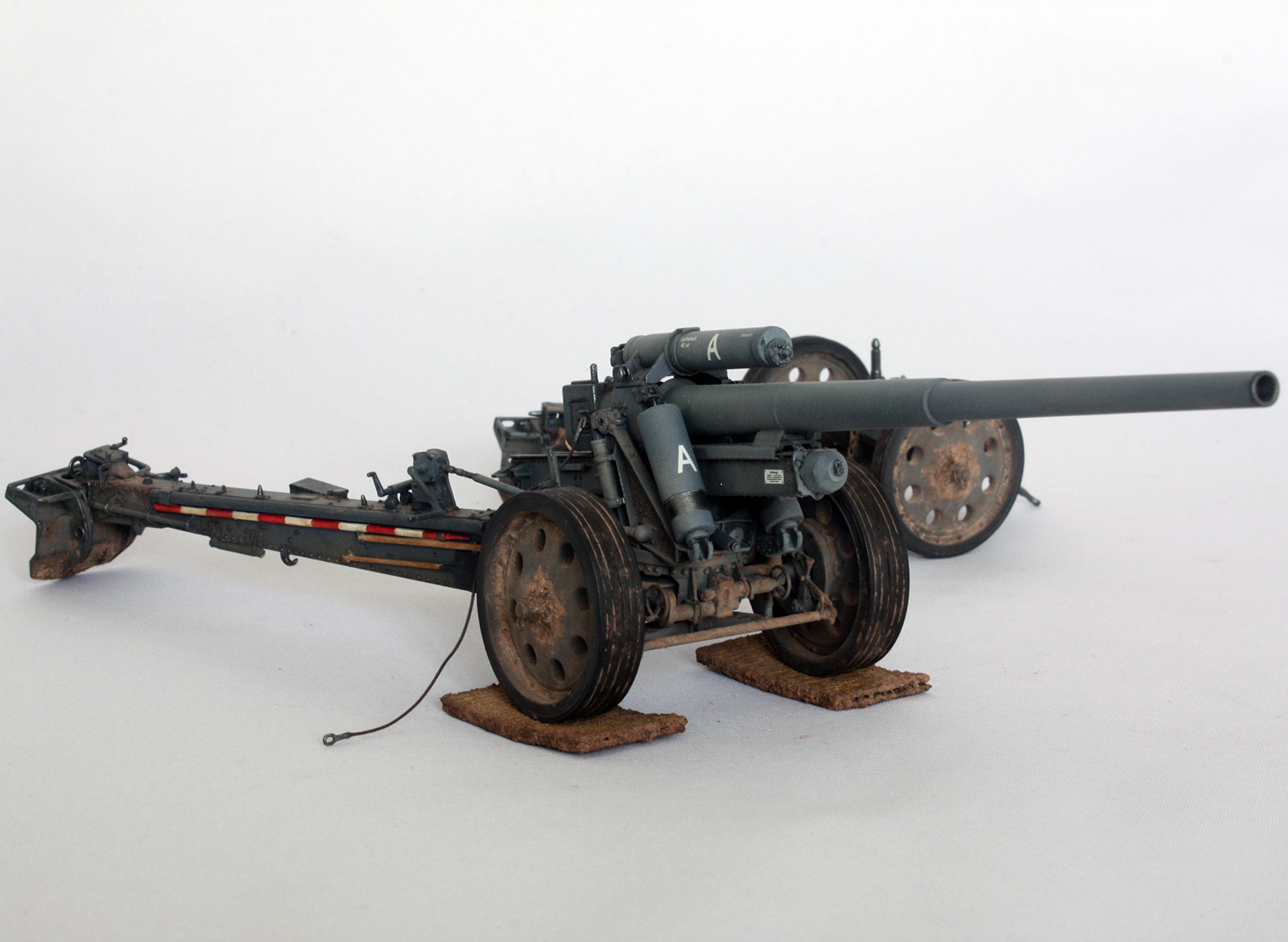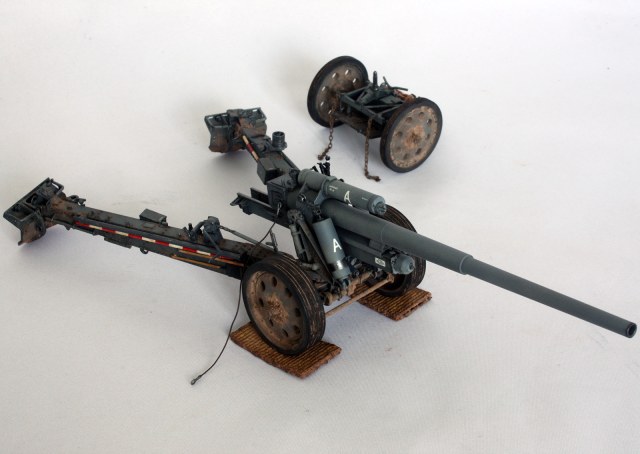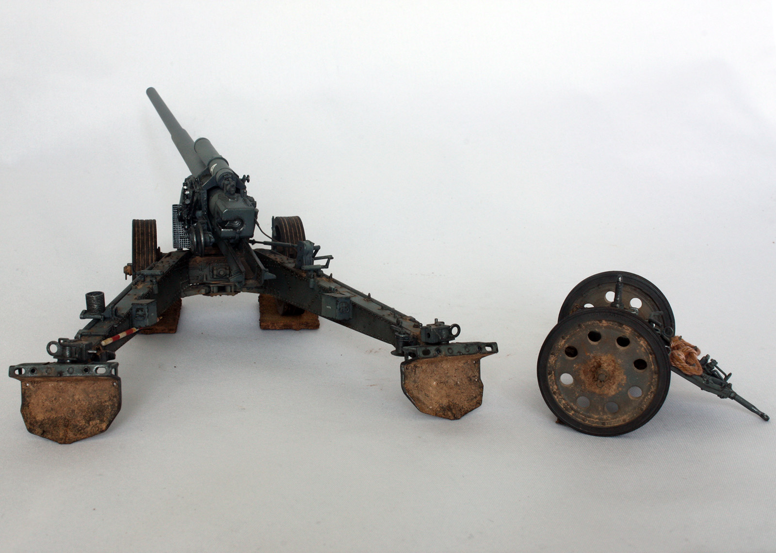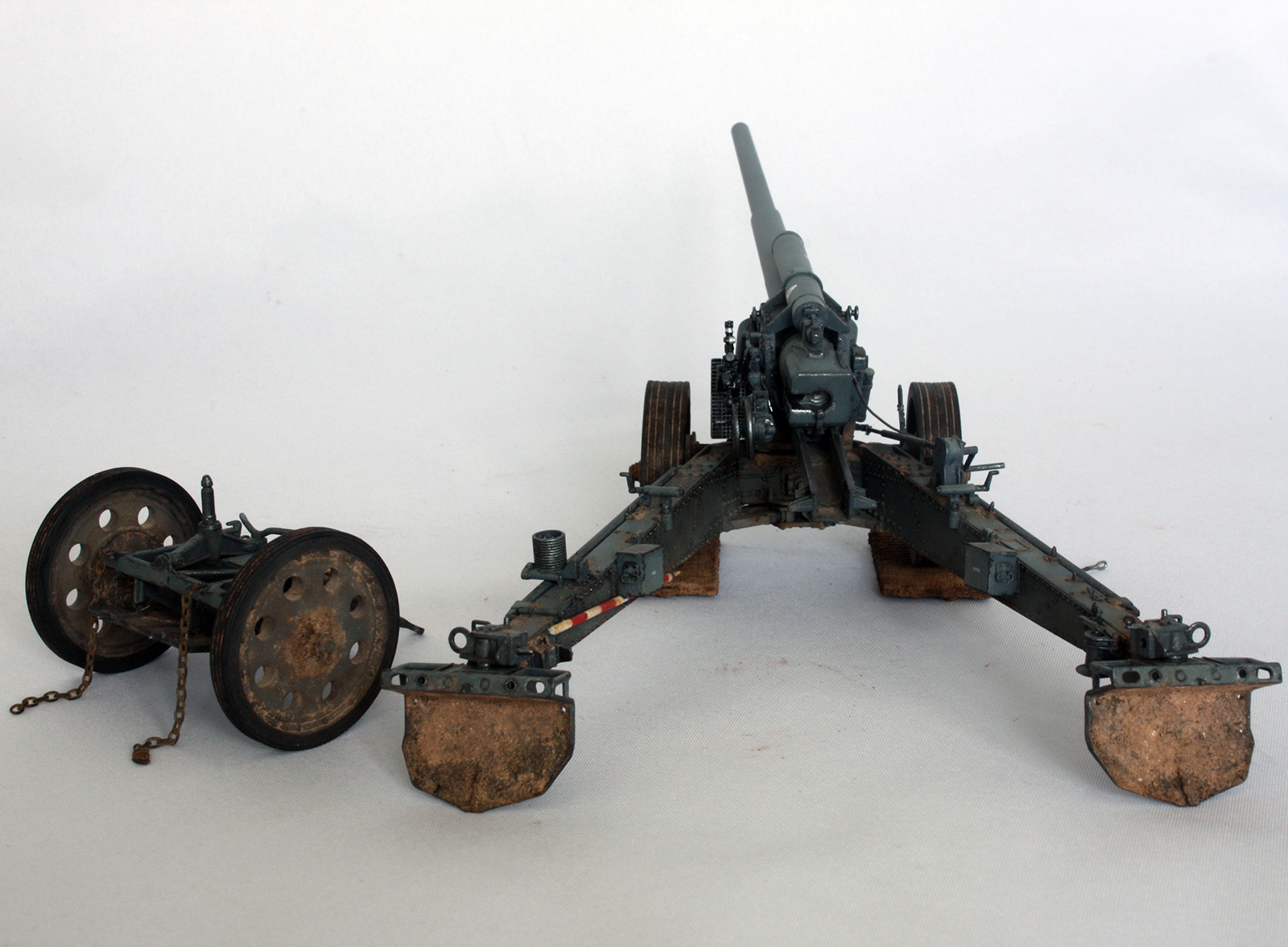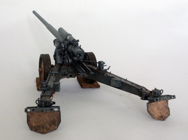Модель строилась «из коробки» с минимальными доработками, дабы в принципе понять особенности работы с набором для дальнейшей постройки модели гаубицы sFH 150, уже дополненной большим набором фототравления. Основной задачей я поставил себе возможность перевода орудия из боевого положения в походное и изменения горизонтального и вертикального углов наводки, причём с 2 целями: 1 – просто интересно, 2 – я не был уверен, какова будет дальнейшая судьба орудия – в боевом положении на арт.позиции или на прицепе у тягача.