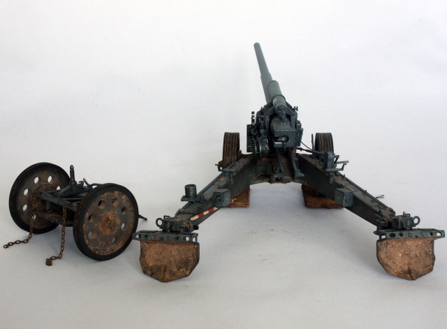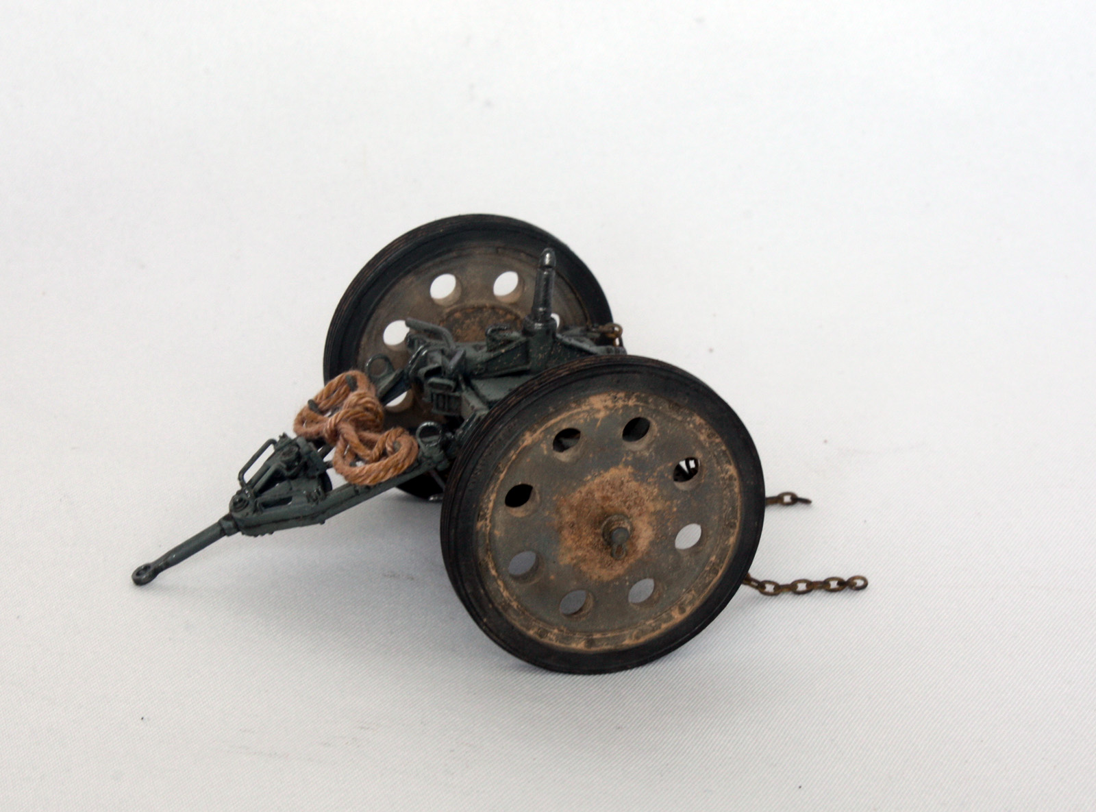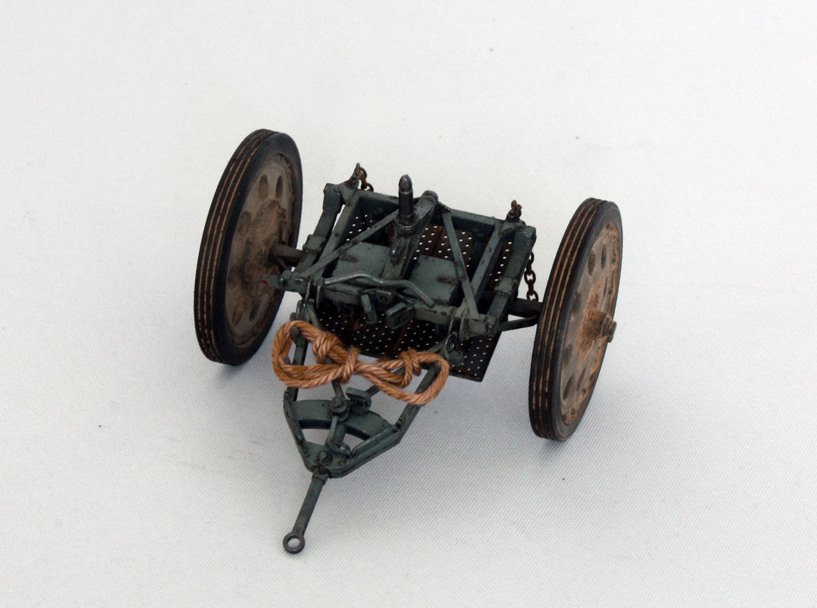 Нет никакой возможности продемонстрировать это орудие в положении «по-походному» с установленными сошниками: станины не лягут на передок. Обратите сразу внимание: у моего набора к примеру, по не понятным причинам, не были отлиты штыри на одной из станин, причём у sFHтакой проблемы нет. Проверьте, чтобы сошники фиксировались на них, с учётом того, что будет ещё краска и грунтовка.