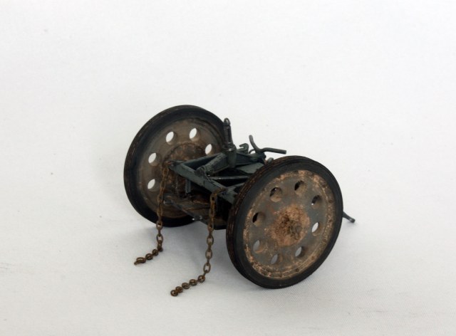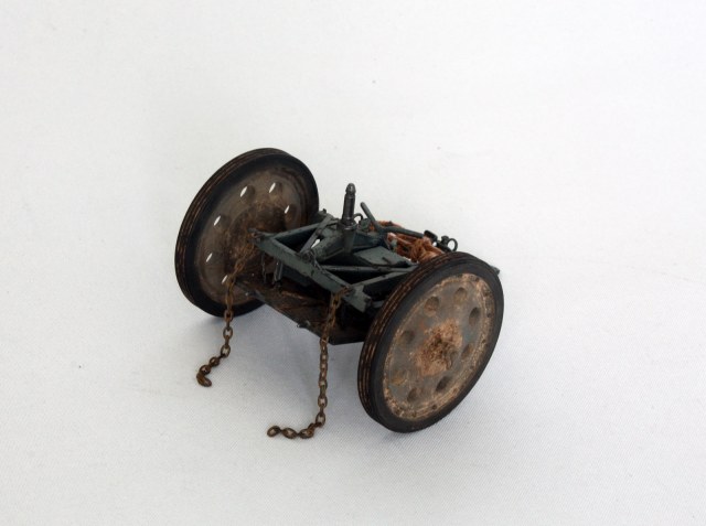 3.Кроме того, что сведённые сошники соединяются друг с другом а отверстие на правом обжимает посадочный штырь на передке двумя ручками с полукруглыми фиксаторами через пазы, чтобы собственно станины не соскочили с передка, дополнительно этой же примперно цели служит пара цепей, которые как-бы не дают передку «выкатываться» из-под станин при движении. Они крепятся с большим допуском, позволяющим передку поворачивать при движении. Две цепи взял опять же из вышеуказанного набора с цепями, уже заржавленные. Судя по фото – реально они были немного тоньше. Но, смотрится в общем не страшно, как по мне;