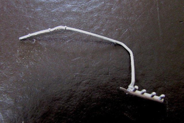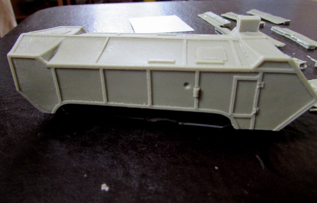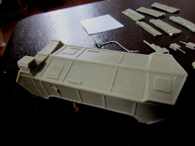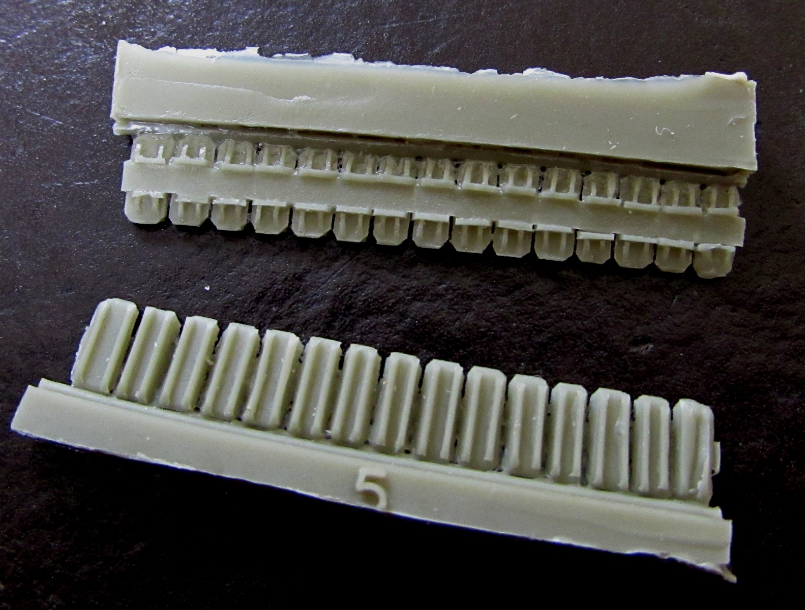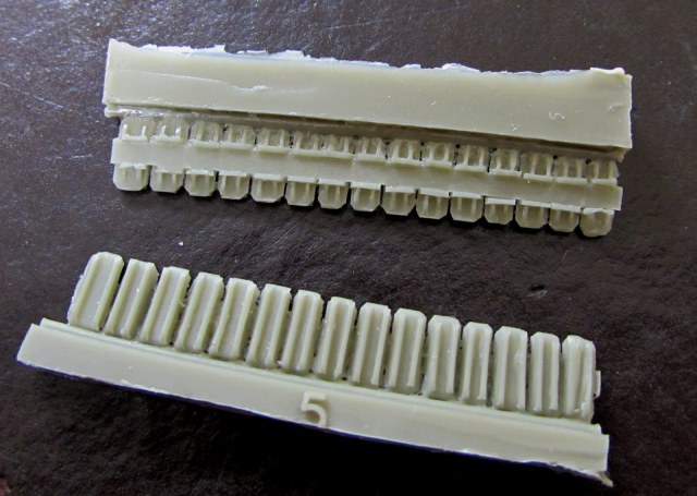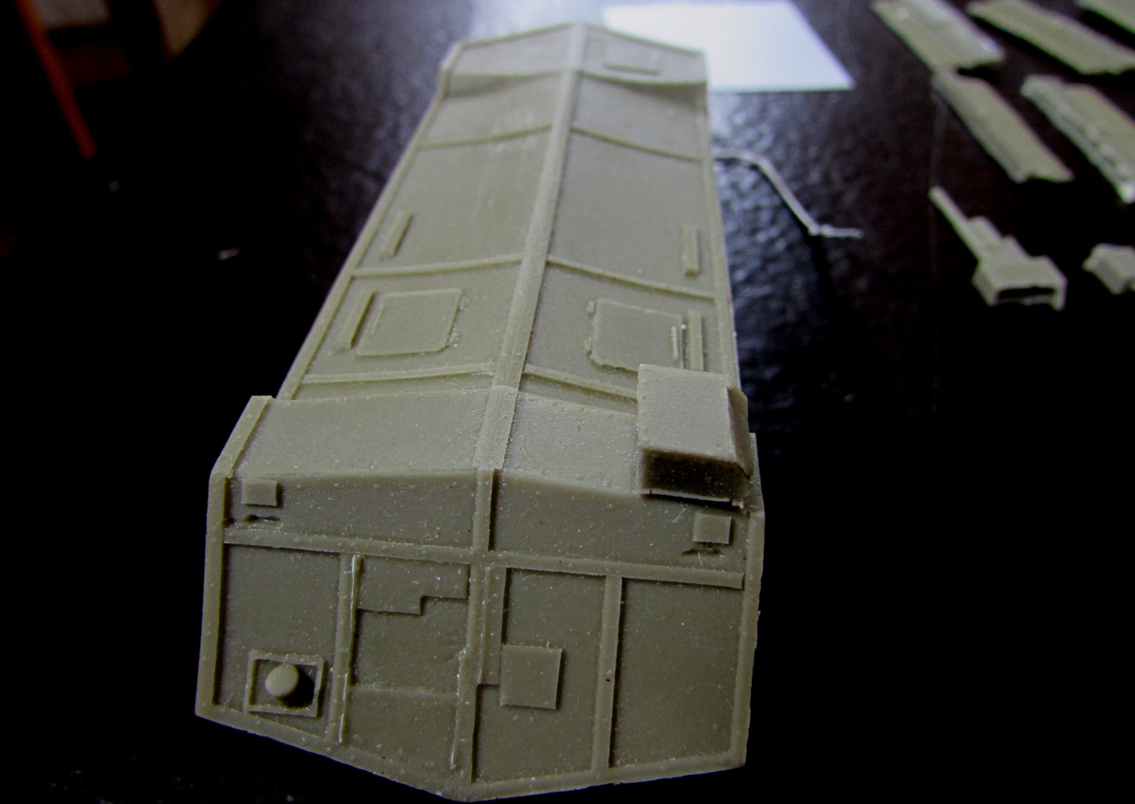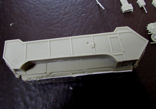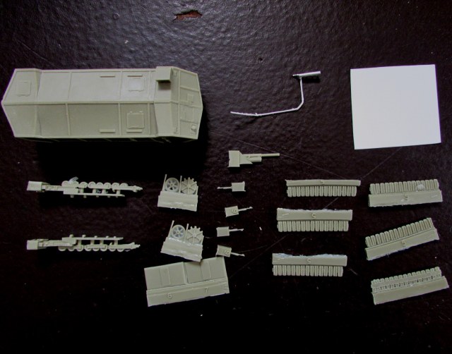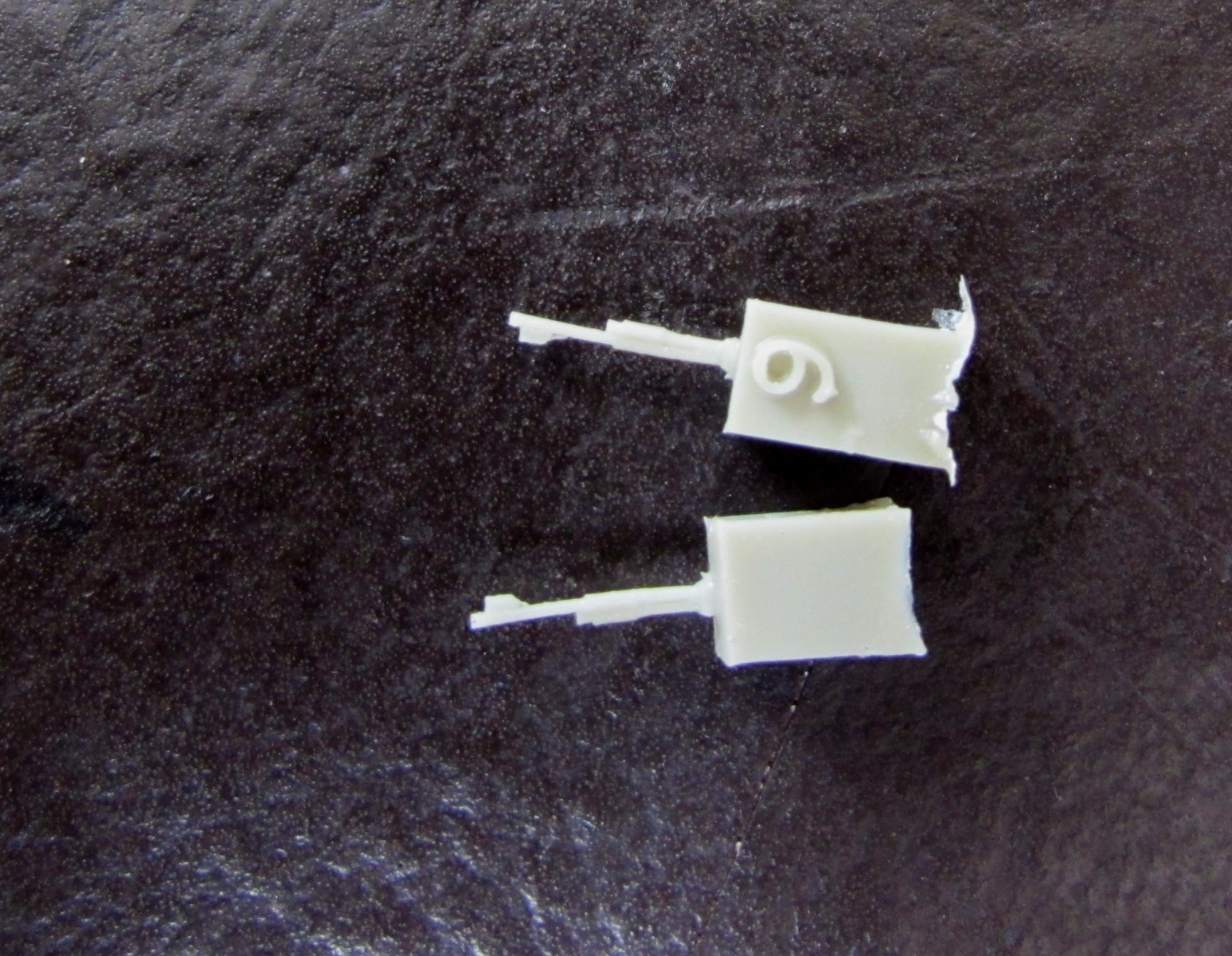 Деталей мало, качество их на уровне хорошего Моделкряка - неплохое, но пошкурить придется. Корпус отлит на смоляной площадочке, которую надо сточить (занятие не для слабонервных). Клепки практически нет - чуть-чуть спереди и сзади. Смола среднего качества, при обработке издает стандартный неприятный запах. По качеству напоминает слегка ухудшенный Моделтранс.