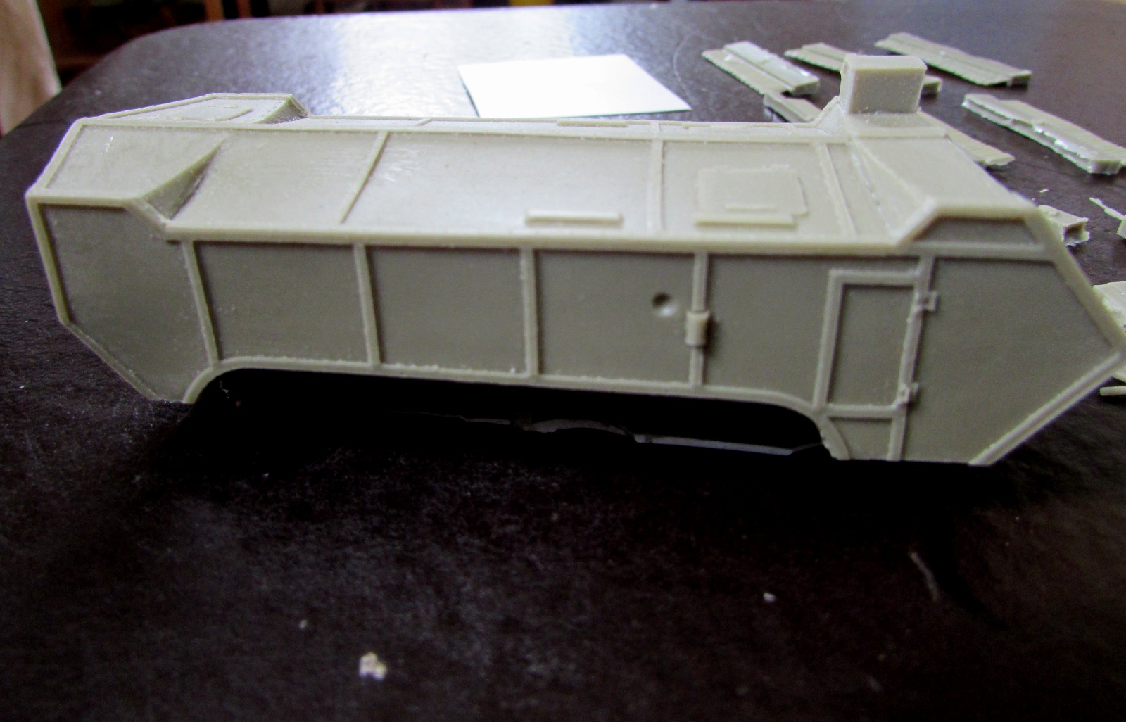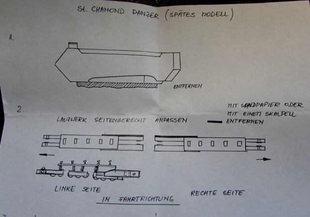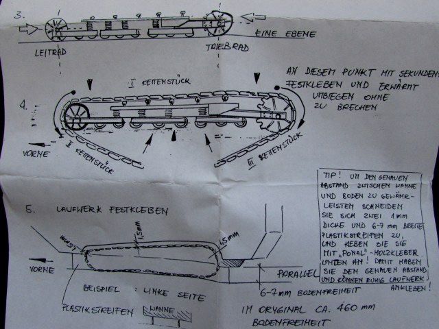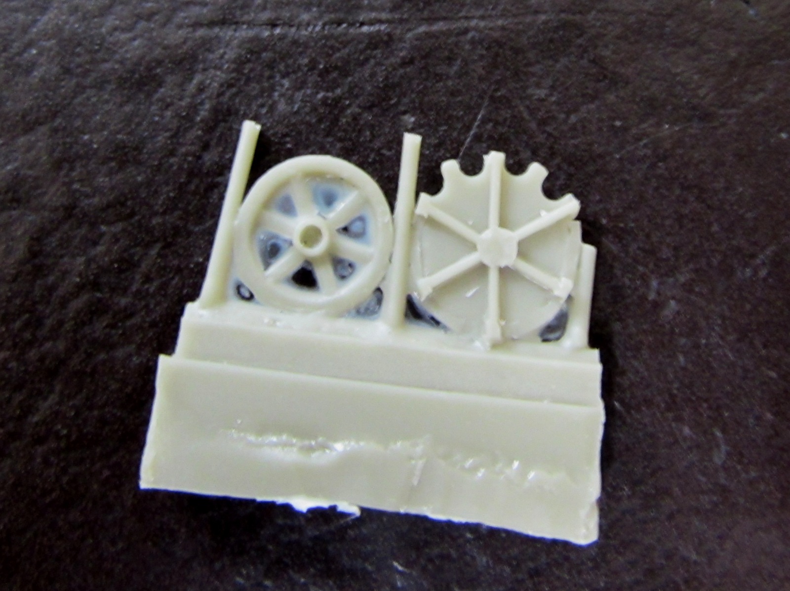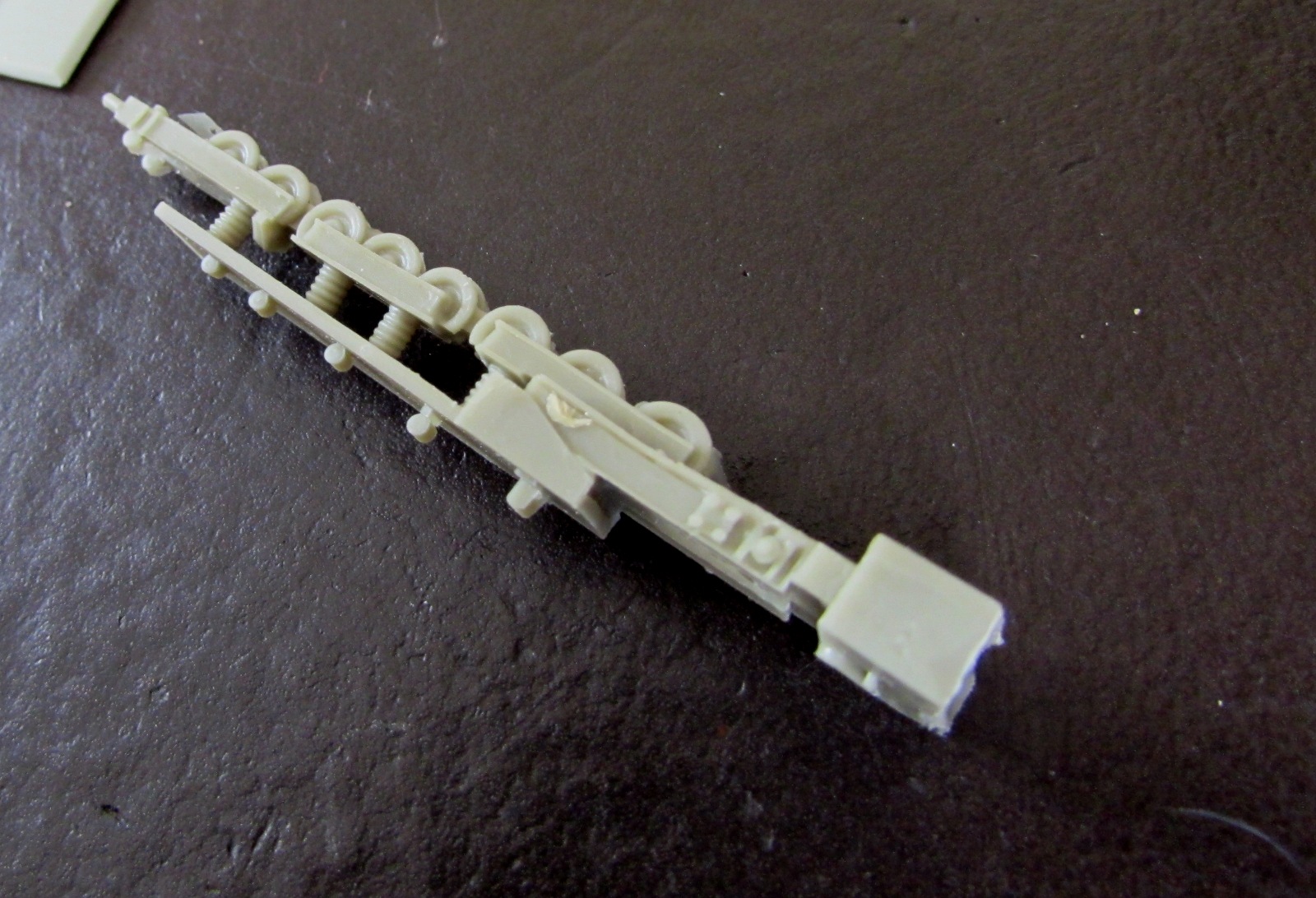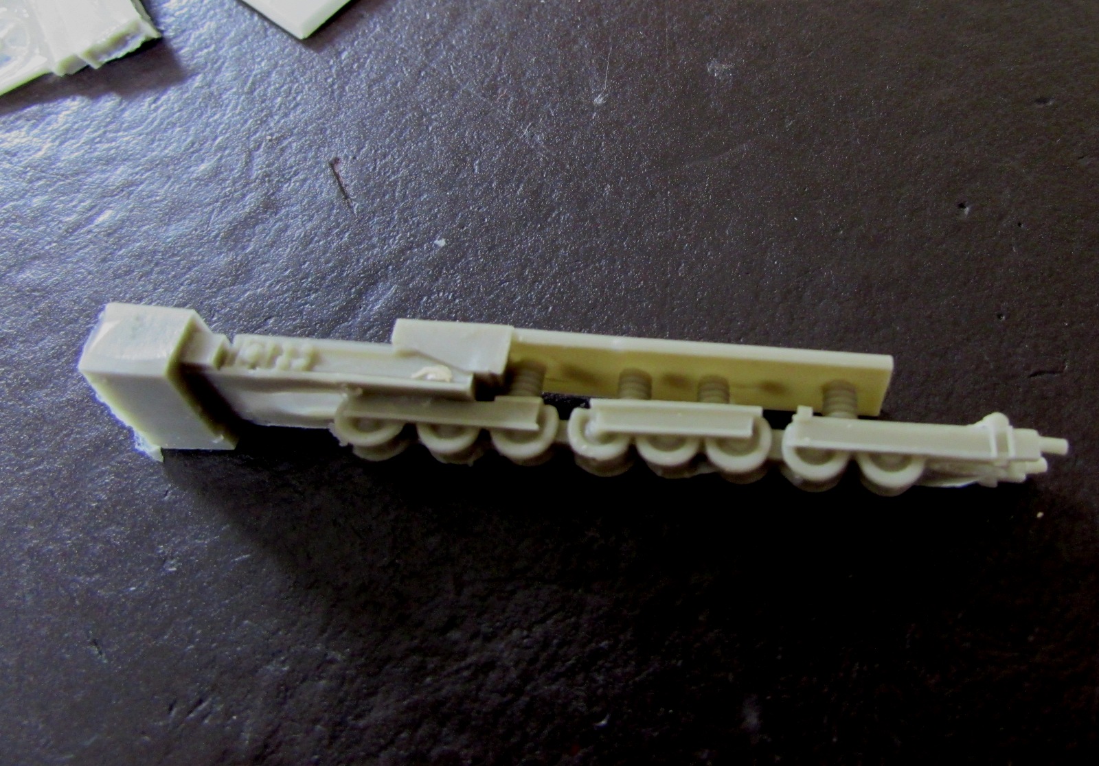 Ходовая часть отлита неплохо - но убого, даны лишь сами тележки, ведущие, ленивцы и гусеница. Характерных для данной машины подкосов и расчалок на днище нет.