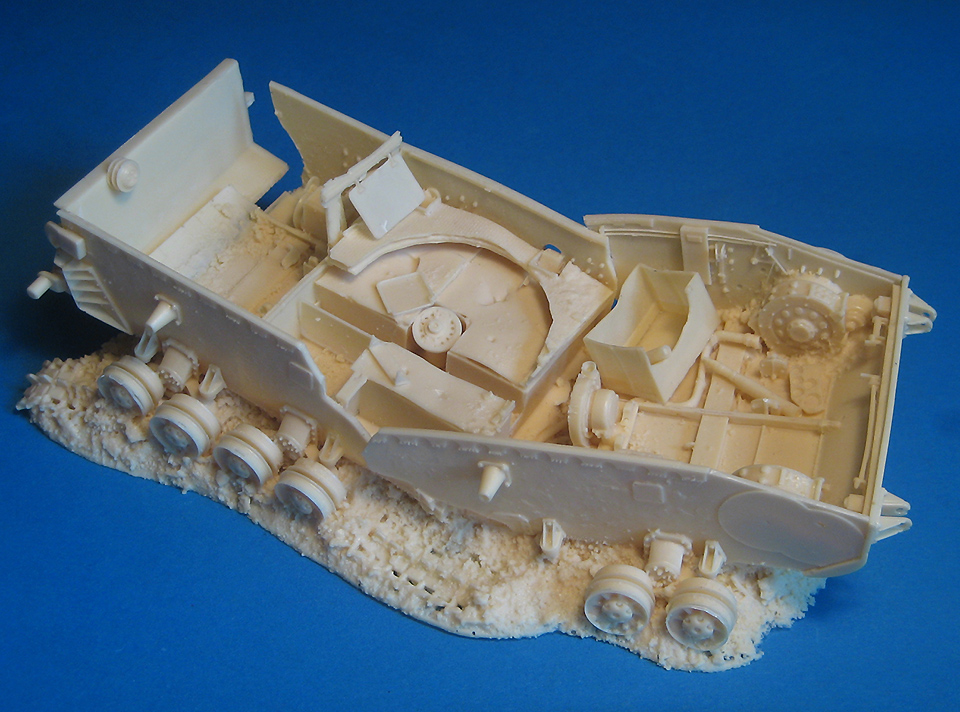 В первую очередь, поднял фотоархив битых четверок, в очередной раз убедился, что модель является очень сильно собирательным образом чего-то а-ля Pzkpfw IV ausf.F. Учитывая, что башни в наборе нет, то циферку 1 или 2 за буквой F каждый может поставить сам. Кстати, отсутствие башни может быть оправдано, учитывая характер повреждений (а здесь явно не обошлось без детонации собственного боекомплекта), ее могло отнести довольно далеко от корпуса. Так как большую диораму под эту модель делать я не планировал, решил считать, что башня лежит где-то там за кадром. Кстати, чисто теоретически, конечно, четверку вполне могло так разнести внутренним взрывом. На фотографиях встречаются не менее развороченные экземпляры. Но все-же, довольно много моментов в плане достоверности резали глаз, в частности у модели не хватает кое-какой мелочевки и надгусеничных полок, кое-где просятся детали на замену на более точные или ажурные. Решил закрыть на это глаза, чтобы не погрязнуть в доработках. Хотелось уже наконец-то закончить этот проект. Придумал такую легенду, что фендеры и недостающую мелочевку ободрали проходящие мимо представители ремонтных подразделений.