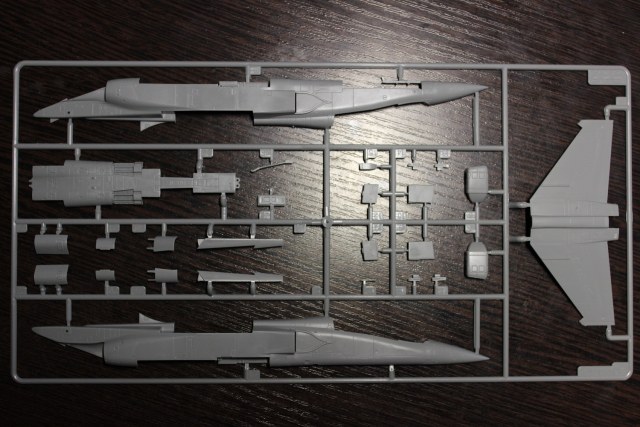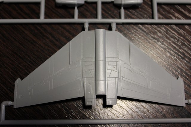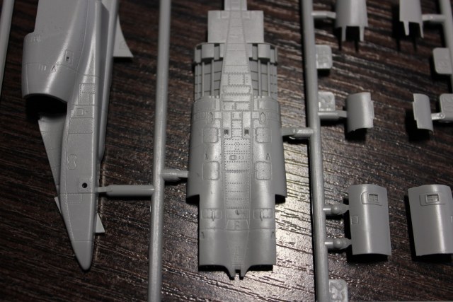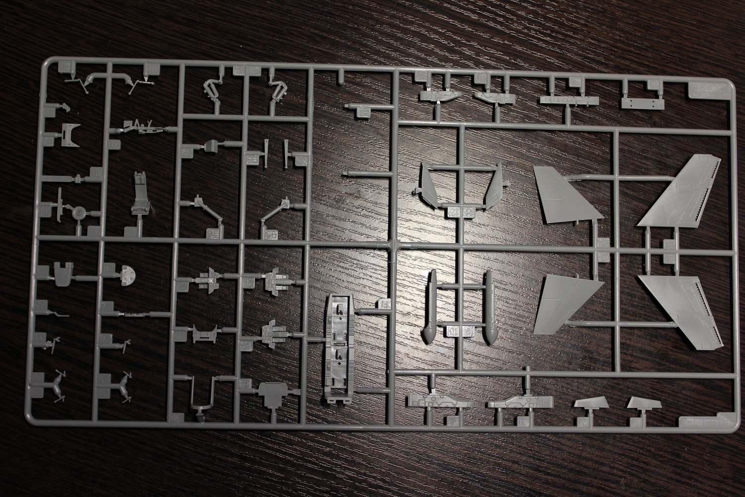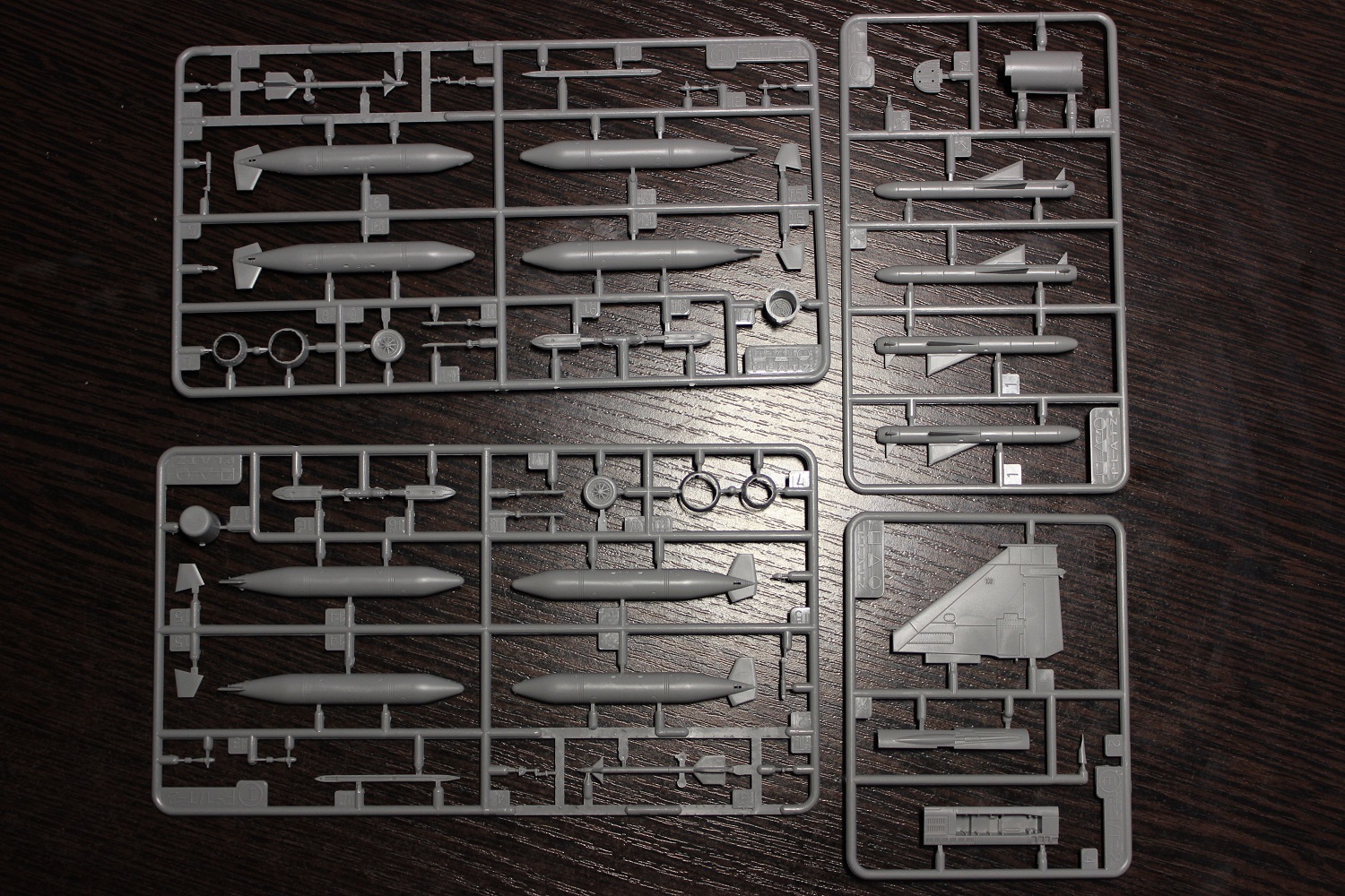Качество отливок на высоте. Конечно, в некоторых местах я заметил утяжины (на ракете, некоторых пилонах), но в целом, повторюсь, все замечательно! аккуратная тонкая внутренняя расшивка, присутствует имитация заклепок, причем в меру, благодаря чему это не сильно бросается в глаза в данном масштабе. Детализация на очень высоком уровне. Показаны малейшие лючки, отдельными деталями даются предкрылки. Неплохо даны ниши шасси...