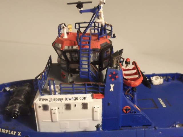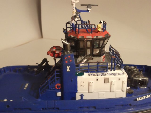 Буксир хорош,но недочёты есть. Плохие поверхности. Нужна шпаклёвка. Нужен брусок со шкуркой. И старание. Но самое главное(это моё мнение) ты не угадал с красками.Даже учитывая не очень удачные фото. Мрачный он у тебя. Например,такой синий не применяют. Он скорее голубой.Я имею в виду на палубе. Саму палубу можно попытаться было другим светом чтобы добавить контраста. Борт я бы покрасил серым,а защитную штуку на форштевне-чёрным. И он бы заиграл. Но это моё мнение,мастер здесь ты. И ещё-учись паять.Когда сумеешь заменить "дубовые" леера и трапы паянными ты не пожалеешь .