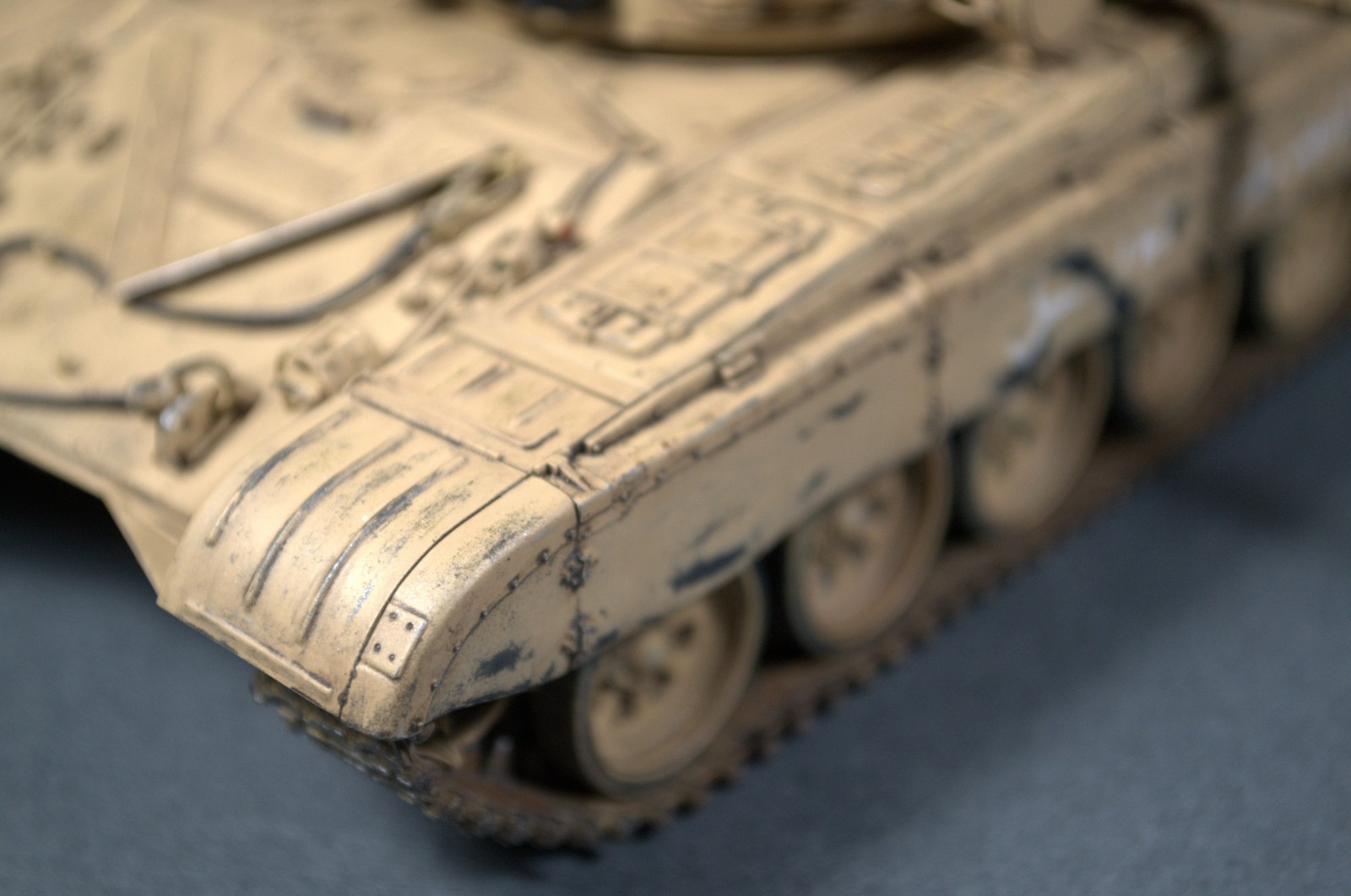 От себя добавил: проводку к "тучам", "луне", задней башенной фаре, остекление из ДВД-дисков, ручки на башню, антенну из иглы от шприца и литника, крепления забашенных ящиков, крепления тросов, заклепки какие-то, еще какую то мелочь из литников и пластика. Погнул и прорезал резиновые экраны. В общем, сильно не перетрудился. "Тучи", пожалуй, вышли хуже всего. Металлизировать до естественного вида резиновые гусенички пока не получается, не хватает навыка...