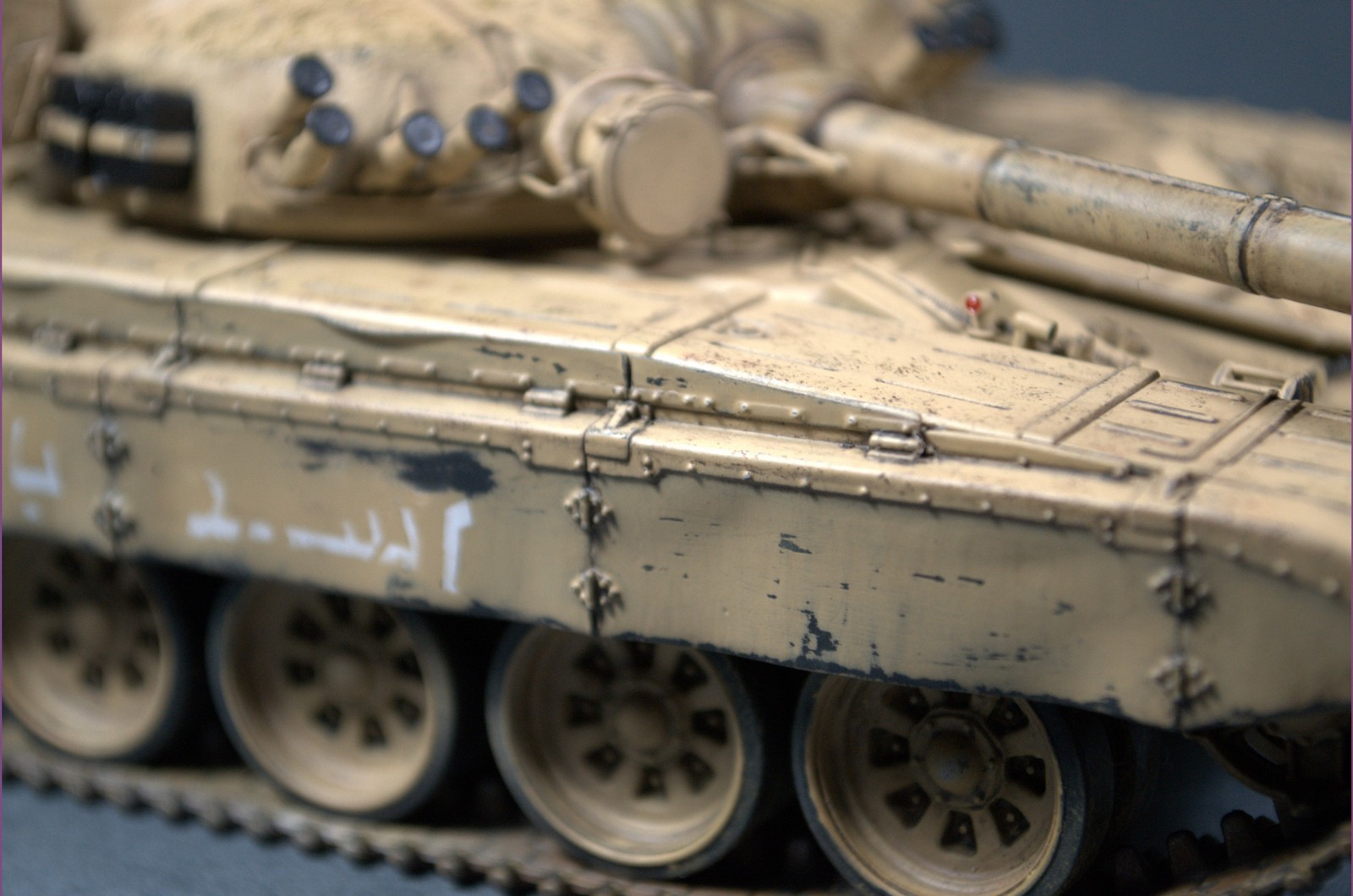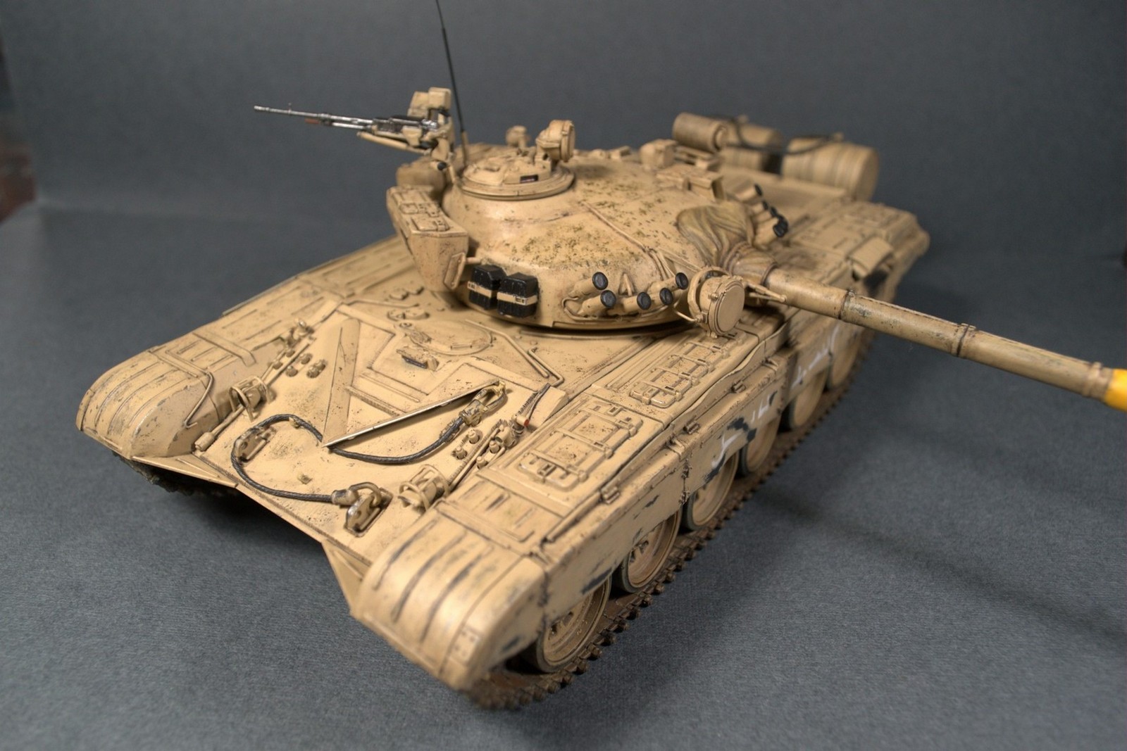За исторический прототип взят Т72М вооруженных сил Ирака, 2-го полка 12-й танковой бригады 3-й дивизии "Саладин", Кувейт, 1991 год. Машины, вероятно, польского производства. Ориентировался на фото трофейных машин, захваченных США, разве, чуть больше чем нужно наносил обдиринг. Что удивило - наличие на этих машинах шноркеля, почти на всех фотографиях (и зачем он им в пустыне?).