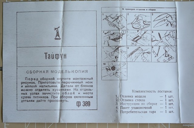 Упаковка – Добротный (году в 2000м я бы сказал Шикарный!) лепесток НОВОЭкспорта. Я так понимаю, это какая то «дочка» НОВО для поставок в Соц.страны. Эту тему может прояснить уважаемый Саурон, если захочет. На лепестке имеются рекламно-маркетинговые заманухи-завлекухи. Типа – Аутентичный вид, вращающиеся винт и колеса, ракеты и пушки… Вся та ерунда, которой производители заполняют печатные площади. Именно лепесток – самая ценная часть этой модели, как мне кажется. В пост советские времена, когда Союз уже развалили, но Украина еще окончательно не свихнулась и не разграбила все и вся, Донецкая фабрика игрушек переименовалась в Завод (ДЗИ) и очень недолгое время выпускался Тайфун в очень красивой авторской коробке с очень красивыми декалями. (Нашел в интернете).