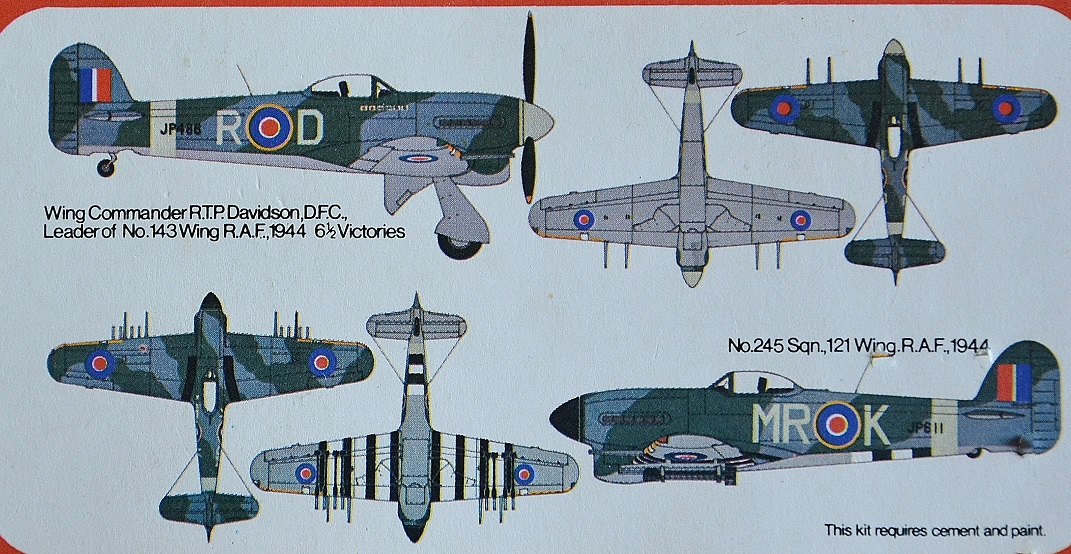 Классика ФРОГа из поросших мхом и ягелем 50х годов прошлого века. Тайфун сделан в том же минималистическом стиле, в той же серии что и Спитфайр 1/5. Но все таки какой то прогресс уже наблюдается. Крылья склеиваются из двух половин и имеют адекватный профиль. Так что при маниакальном желании проще вырезать ниши шасси. Вполне приличный винт и кок, которые и сегодня можно использовать для какой ни будь модельки. Кабина – такое же зияющее пустотою дупло накрытое прозрачным колпачком. (Это не фонарь, это какой то… Плафон). Чертовски изящно и как то даже удивительно отлиты РСы с их направляющими. Сами ракеты наверное даже слишком тонкие, и имеют лишь горизонтальные, микроскопические стабилизаторы. Ракеты можно отрезать и использовать для изготовления каких ни будь весовых компенсаторов и балансиров (Например на Ил-2). А вот пусковые направляющие можно успешно применить по назначению, на каком ни будь английском ракетоносном истребителе. (На том же Темпесте НОВОвском отвратительные «рельсы» но отличные ракеты). Вот пожалуй и все хорошее, что можно сказать про этот набор пластических масс.