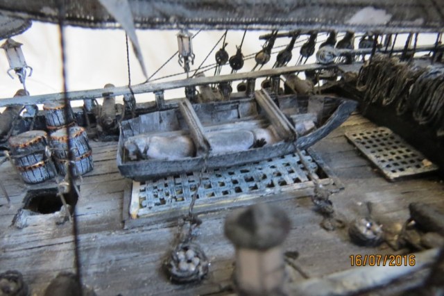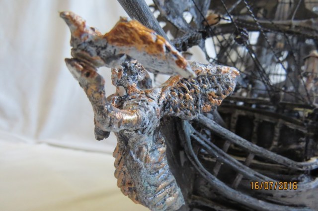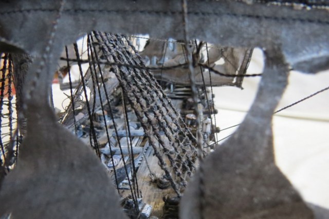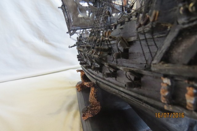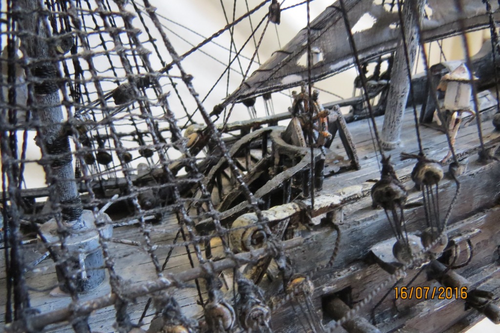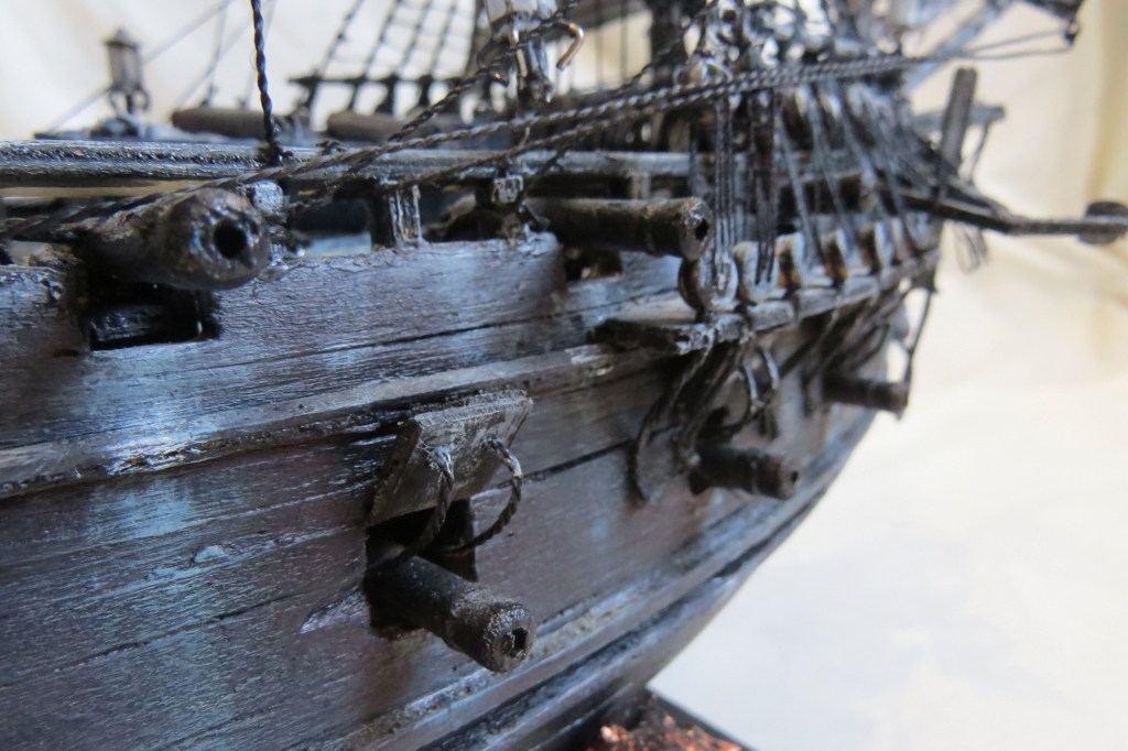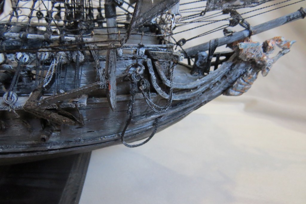 очень-очень-очень грубо сделано. Обычно, если модель первая, то сложные детали делаются 2-3 раза, прежде чем нормально вышедшую деталь можно было бы поставить на модель. Тут - как сделалось так и поставилось. Покраска живая, но тоже не аккуратная. И как, как такие дырявые тряпки-паруса могут НАДУТЬСЯ? Они должны висеть соплями на реях. Если какой-то декор не выходит сделать вручную на должном уровне - лучше его не делать совсем.