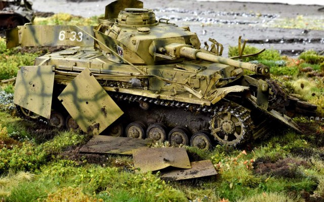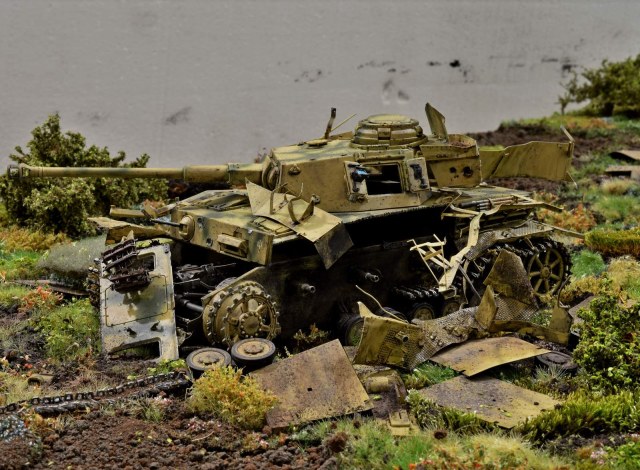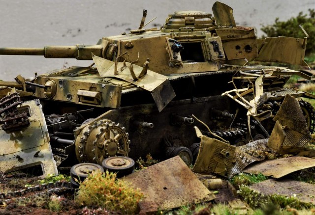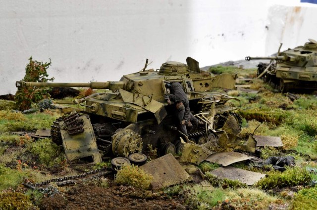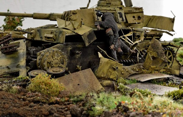 Прекрасная работа, впечатляет и всё в меру. Воспринимается не как модель, а уже как художественное произведение. Не нужен тут реализм, реальные фото сгоревших танков с экипажем, это не то на, что хочется долго смотреть, скажем прямо.