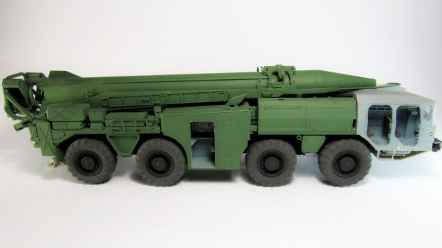 Продолжаю ликвидацию "долгостроев". Эта модель досталась мне в подарок от друга в почти собранном виде (последнее фото). Так как я просто "дособрать" не могу, кое что добавил и переделал. Изначально модель строилась под "Эльбрус" и в камуфляжной окраске. Я решил сделать "Скад" в иракском варианте. В матчасть особо не лез - так, кое-что переделал: