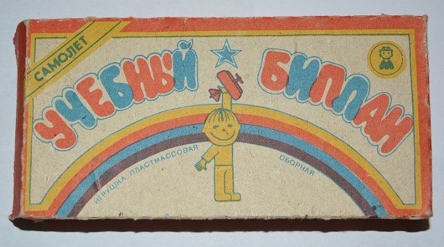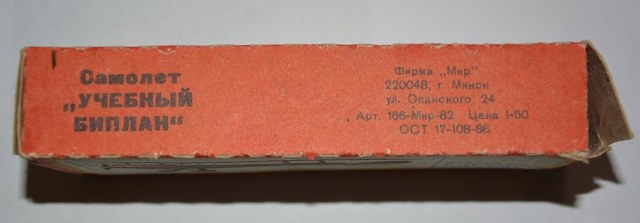 Коробочка этой совсем не редкой и многим знакомой модельки от Минской фабрики игрушек «Мир» была, пожалуй, самой позитивной и жизнерадостной из всего того квази-упаковочного материала, в котором НОВОвские модели попадали в ручонки Советской Пионерии. На лицевой стороне дерьмокартона выработанного из макулатуры и отходов порохового производства - аляповатая мазня по мотивам оригинального бокс-арта НОВОвского лепестка. А вот на обороте… Это просто праздник какой то! Веселый карапуз запускает свой «учебный биплан» выше радуги!