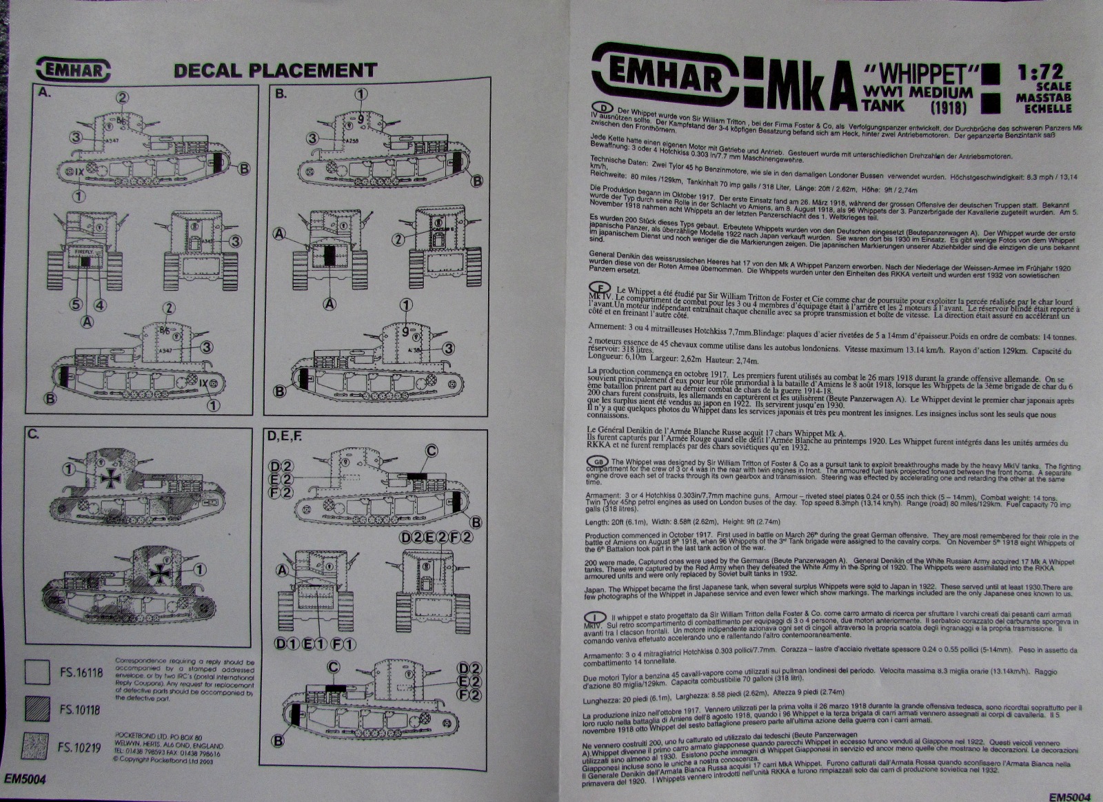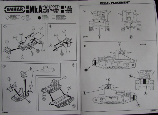 Декаль очень богатая, лучше, чем в 1/35 - на несколько стран; есть даже японцы и Добровольческая армия Деникина. Кстати, для любителей техники белогвардейцев: у вас есть отличная возможность сделать уникальную историчную машину, поставив в лобовой амбразуре 37-мм морскую пушку Гочкиса, или Максим (подробнее см. "Танки в Гражданской войне" М. Коломийца).