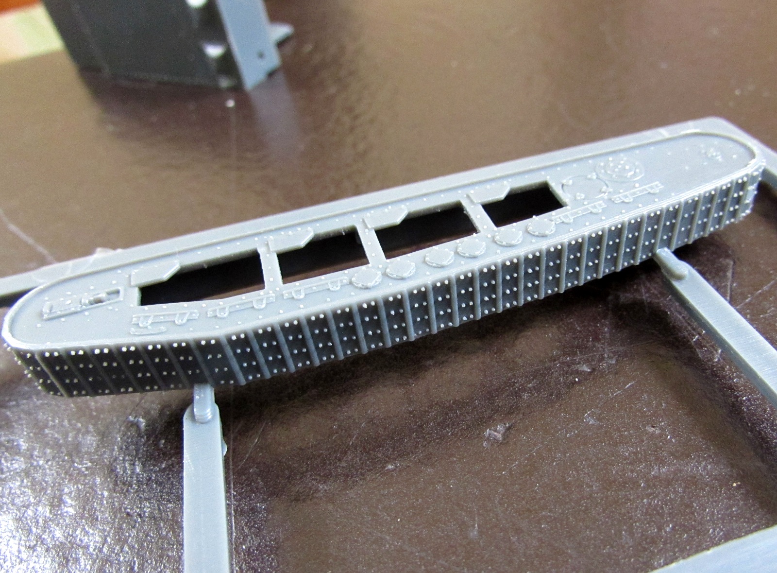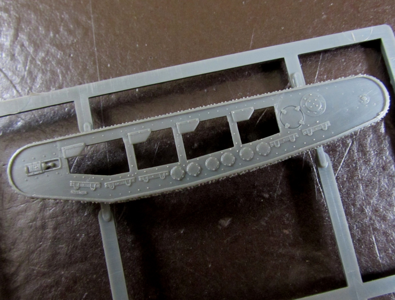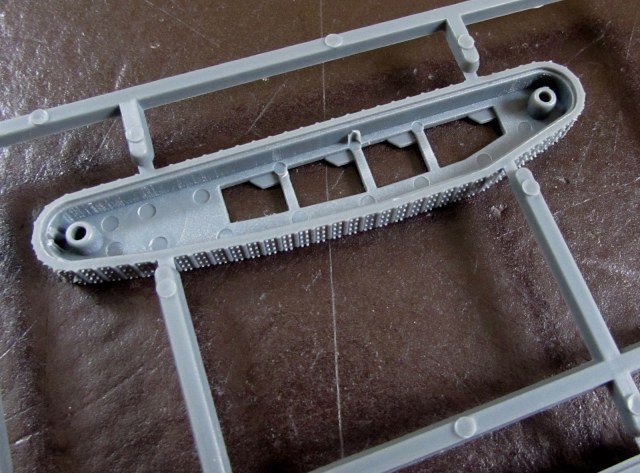 Гусеницы отлиты вместе с внешней частью ходовой, и отлиты отлично. Сама ходовая часть - из двух половинок, причем красить их внутри надо до стыковки и склейки.