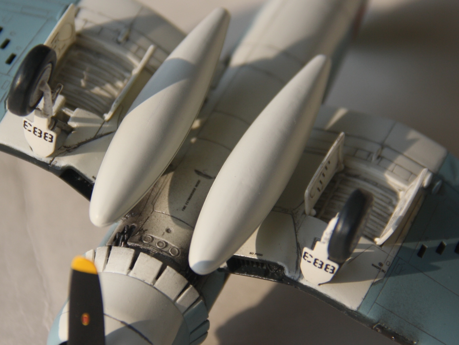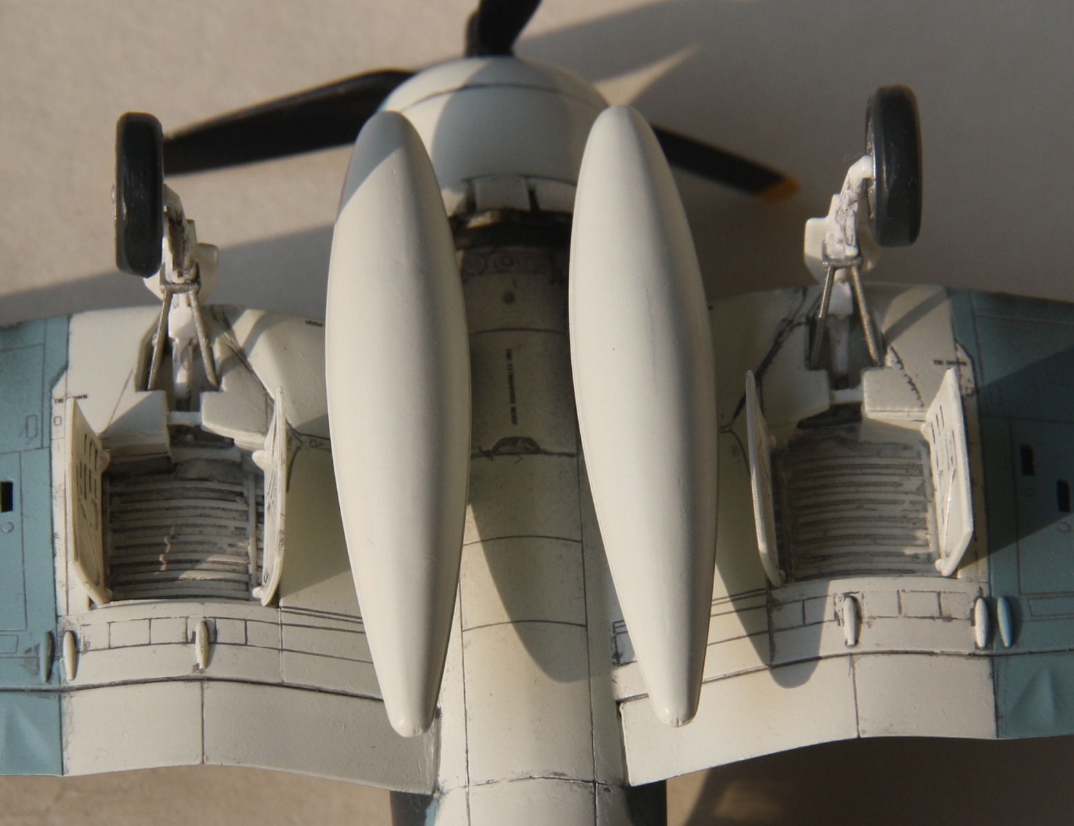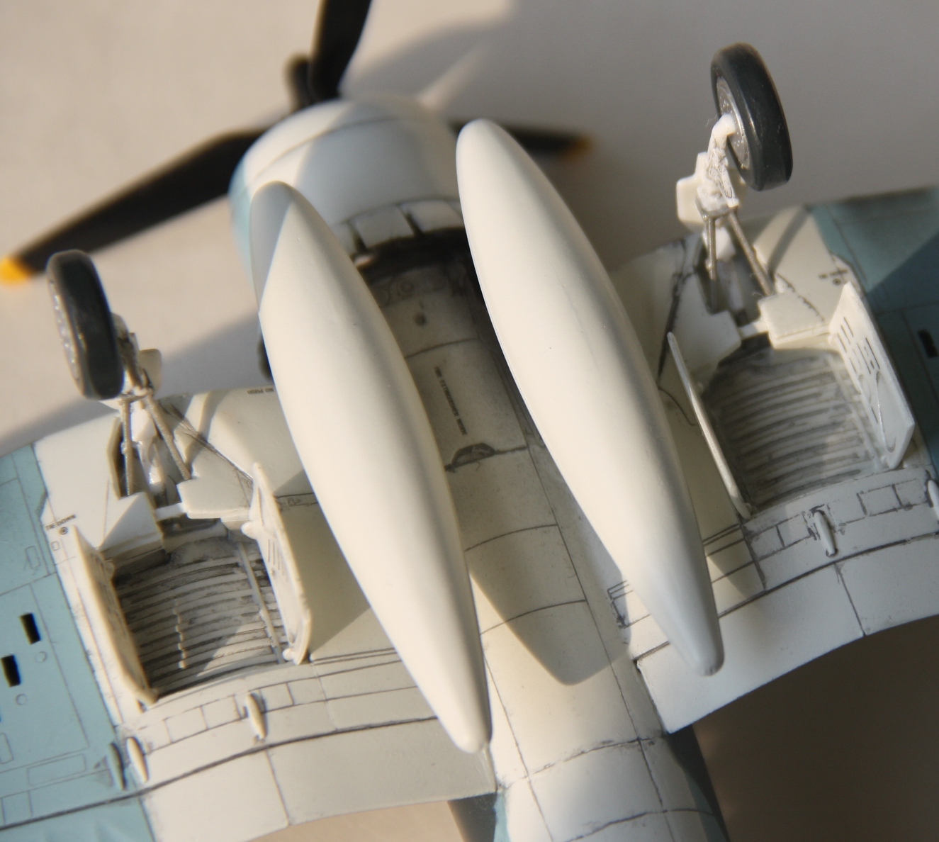 Revellовский набор произвел неоднозначное впечатление, хорошая деталировка, аккуратная расшивка, удобное членение деталей, сочетаются с весьма средней стыкуемостью. Шпатлевать пришлось почти все стыки, хотя и по чуть-чуть. Так же не порадовал белый пластик, на котором очень сложно заметить дефекты. Из-за чего пропустил «двойной шов» на пузе, заметил уже после покраски.