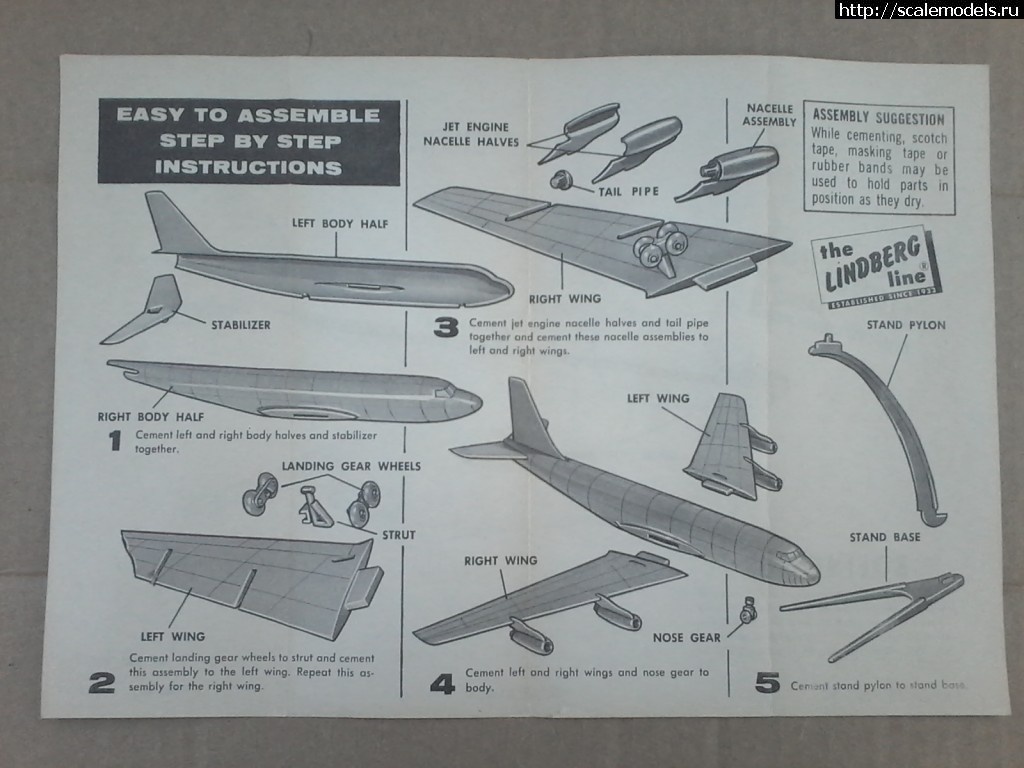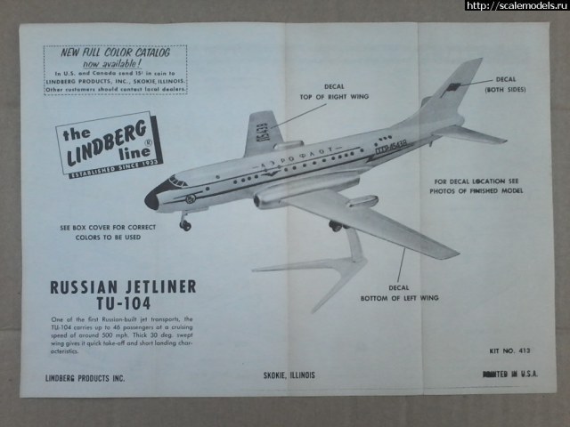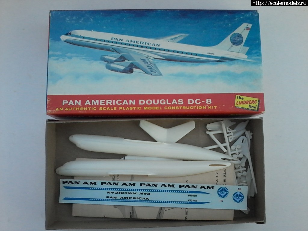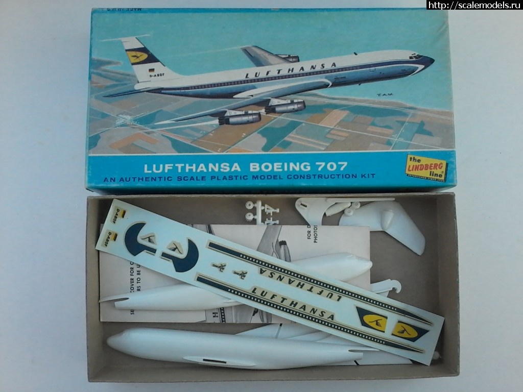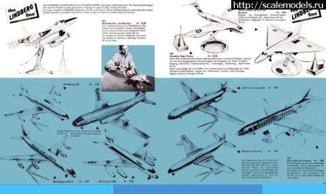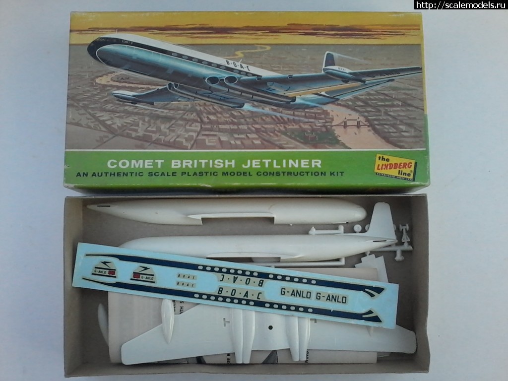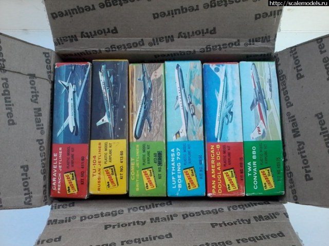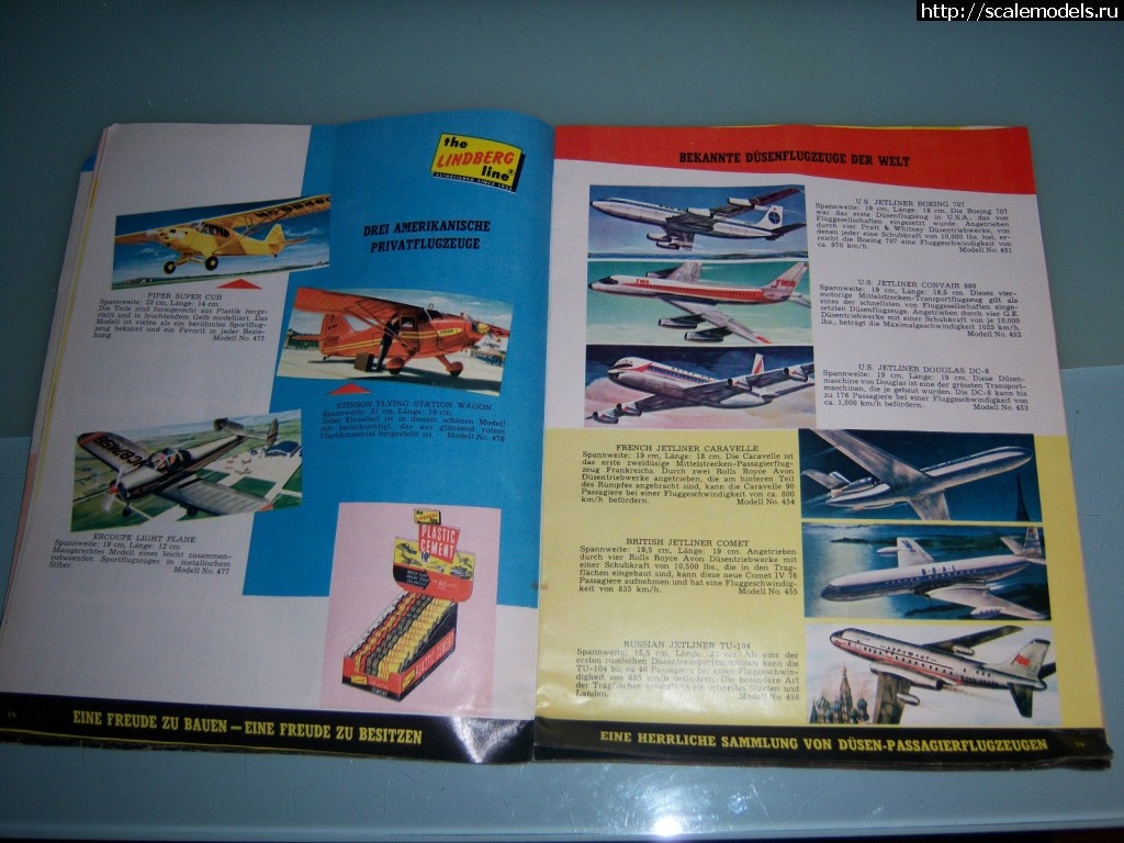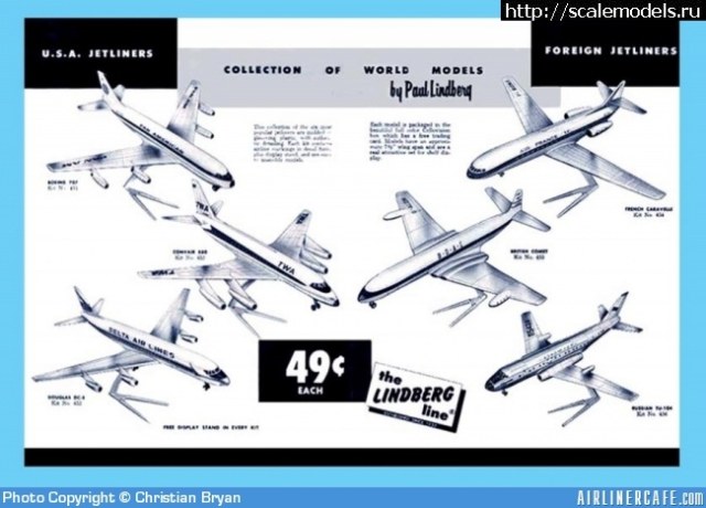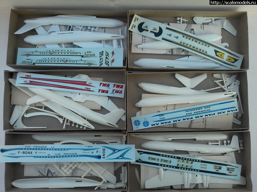 Приветствую, как-то выкладывал на Скале обзор этих моделей авиалайнеров. Может, будет интересно взглянуть... Продавец из Лондона (Великобритания) выставил на аукционе Ebay.com полную серию из шести реактивных авиалайнеров первого поколения американской фирмы Линдберг. Пол У.Линдберг (Paul W.Lindberg) выпускал самую разнообразную продукцию,в том числе и немало моделей самолётов.Эту серию разработали примерно в 1959-60м году, а в 1961м она уже была в каталоге этой фирмы... В самом начале модели были выпущены в невзрачных блёклых коробках,но позже перевыпущены в обновлённых, которые рисовал известный тогда иллюстратор Том Морган (Tom Morgan). Модели получили новые декали и инструкции. Эти коробки датируются 1964 м годом. Все шесть самолётов выполнены как простые в сборке (Easy to Assembly) сувениры,с минимумом деталей.На момент разработки моделей авиационные фирмы и КБ не выкладывали заводские чертежи в свободный доступ,и модели делали по эскизам. Как следствие они в чертежи не ложатся. Модели были дешёвыми, доступными,их мог купить моделист с небольшим достатком,или даже ребёнок. Серия продавалась как в Америке ,так и в Европе,где выходили каталоги Lindberg на других языках. -----КОРОБКИ. Коробки небольших размеров открываются вверх. Картон настолько твёрдый,что похож на фанеру.Содержимое надёжно сохраняется при пересылке.На крышках нарисованы следующие самолёты:советский Ту-104 в Аэрофлотовской окраске (модель имеет размеры 21,4х19,9см),французская Каравелла в окраске Эйр Франс(18×18,7cм),английская Комета в окраске БОАК(19,3x19,1cм),американский Боинг707в ранней окраске Люфтганза(18,2×19,2cм),aмериканский Конвэр880 в окраске ТВА(19,3×19,5cм),американский Дуглас ДиСи-8 в окраске Пан Ам(19,6×18,9cм). Все коробки имеют одинаковый размер.Модели же разномасштабные.В каталоге Линдберг не указывался"дробный"масштаб,так как самолёты сделаны не в каком-то определённом масштабе. Содержимое коробок не было упаковано,а лежало россыпью. ------ПЛАСТИК. Пластик простой,без изысков.Без мелких деталей,без ниш шасси.Расшивка комбинированная,у пары моделей есть заклёпки.Но они настолько мелкие,что увидеть их невооружённым взглядом весьма проблематично.Створок шасси у большинства моделей нет.Все модели имеют стандартную подставку в виде буквы V.Иллюминаторов нет.Лобовые стёкла даны гравировкой либо внешним кроем.Модели были вложены в чертежи,и замечены многочисленные отклонения.Однако сегодня эти модели представляют уже не копийную ценность,а лишь коллекционную,как раритеты(от слова Rare).Английская Комета на коробке дана в варианте Сomet 4,а внутри лежит пластик на Сomet 3.Этот ранний вариант имел более короткий фюзеляж. --------ДЕКАЛИ. Декали базовые,практически без технички.Три модели имеют верные регистрационные номера,а три неправильные.Однако в те годы этому мало кто уделял внимание.Как разработчики,так и моделисты.Следует помнить,что это одни из первых пластиковых моделей пассажирских самолётов. --------ИНСТРУКЦИИ. Инструкции чёрно-белые,простые.Схем окраски нет.Рекомендовано красить модели так,как показано на коробках.В инструкциях есть фото готовых моделей на подставках. Клей и краски в набор не входили,они продавались отдельно. ------- Немного истории.Появившиеся в 50е годы реактивные авиалайнеры казались чем-то фантастическим.Пассажиры привыкли летать на тихоходных винтовых самолётах, а эти стремител