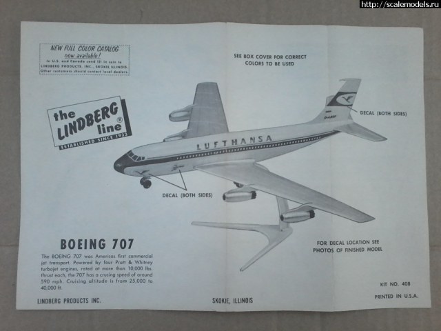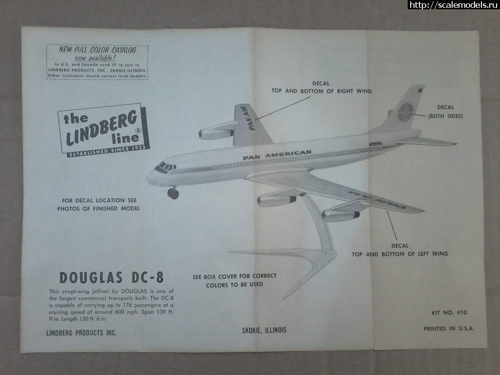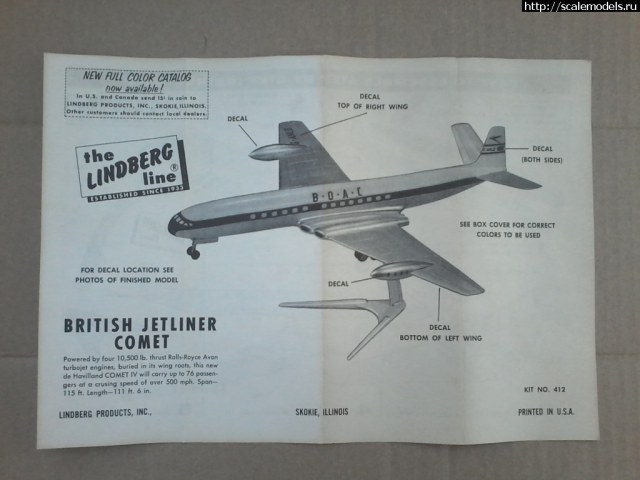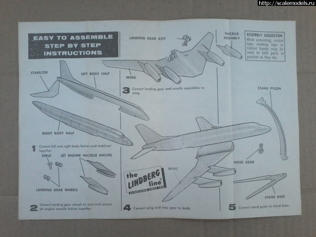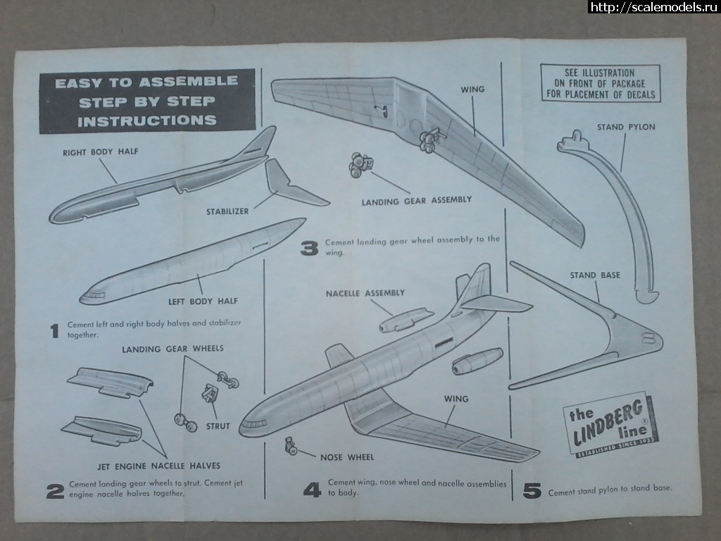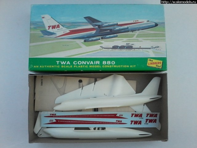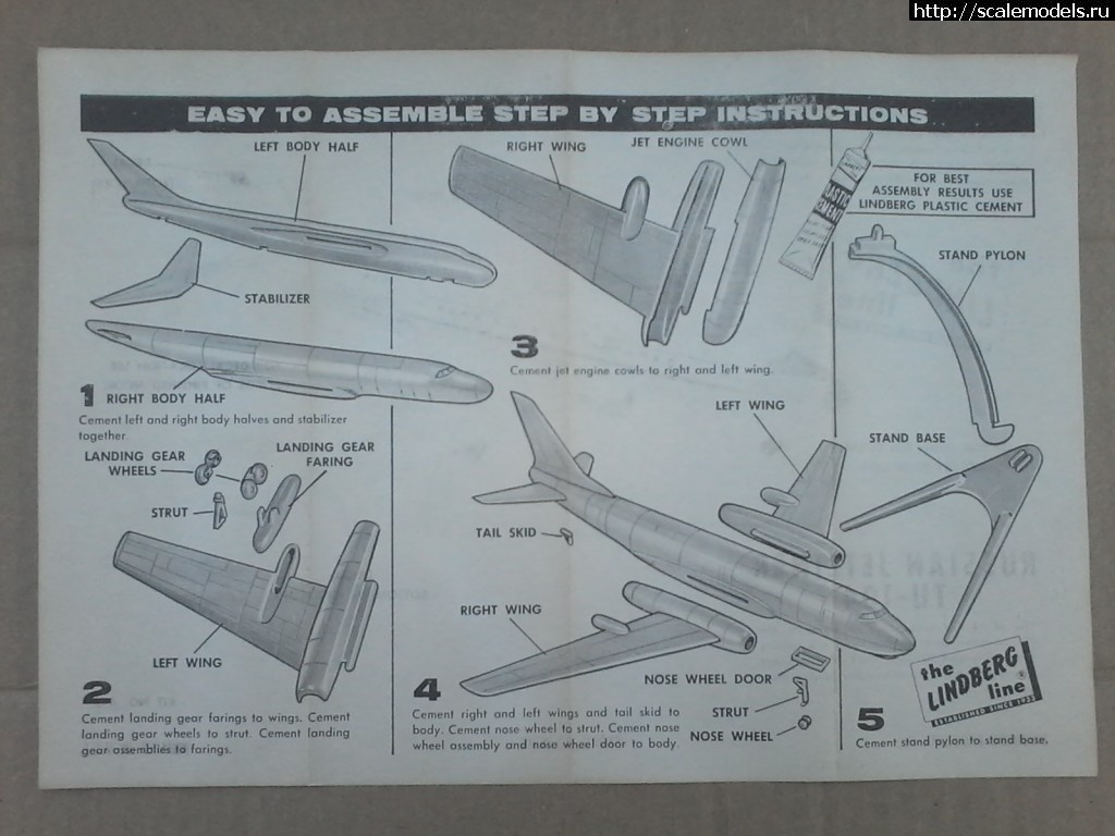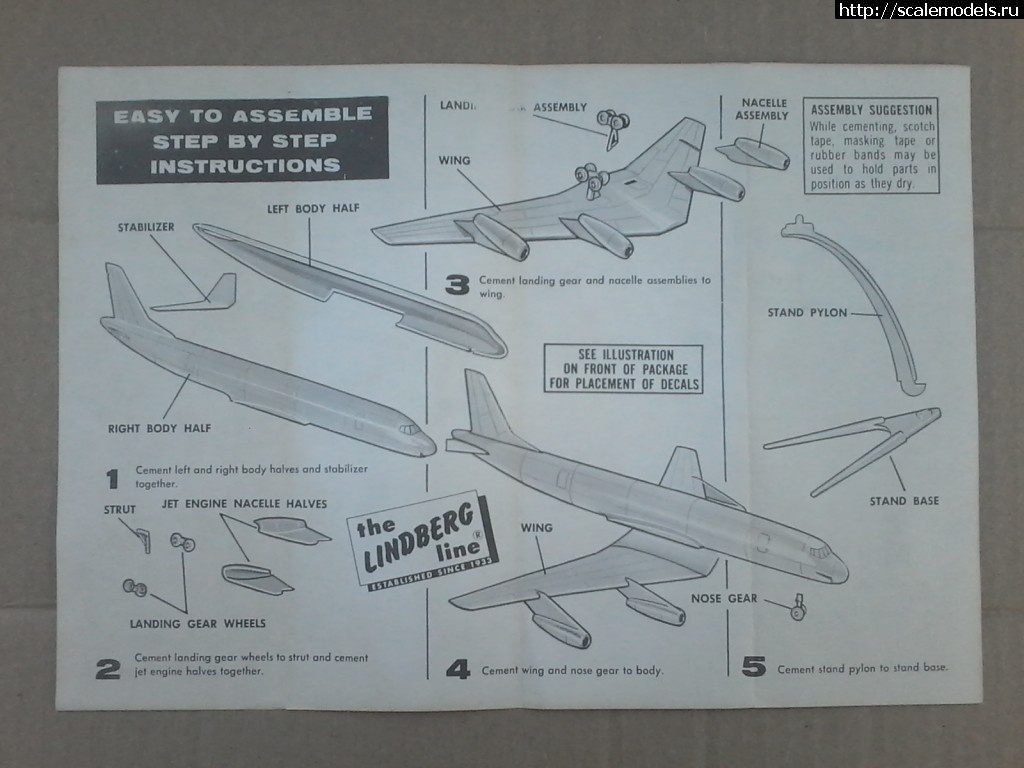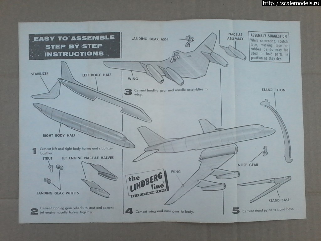 Приветствую, как-то выкладывал на Скале обзор этих моделей авиалайнеров. Может, будет интересно взглянуть... Продавец из Лондона (Великобритания) выставил на аукционе Ebay.com полную серию из шести реактивных авиалайнеров первого поколения американской фирмы Линдберг. Пол У.Линдберг (Paul W.Lindberg) выпускал самую разнообразную продукцию,в том числе и немало моделей самолётов.Эту серию разработали примерно в 1959-60м году, а в 1961м она уже была в каталоге этой фирмы... В самом начале модели были выпущены в невзрачных блёклых коробках,но позже перевыпущены в обновлённых, которые рисовал известный тогда иллюстратор Том Морган (Tom Morgan). Модели получили новые декали и инструкции. Эти коробки датируются 1964 м годом. Все шесть самолётов выполнены как простые в сборке (Easy to Assembly) сувениры,с минимумом деталей.На момент разработки моделей авиационные фирмы и КБ не выкладывали заводские чертежи в свободный доступ,и модели делали по эскизам. Как следствие они в чертежи не ложатся. Модели были дешёвыми, доступными,их мог купить моделист с небольшим достатком,или даже ребёнок. Серия продавалась как в Америке ,так и в Европе,где выходили каталоги Lindberg на других языках. -----КОРОБКИ. Коробки небольших размеров открываются вверх. Картон настолько твёрдый,что похож на фанеру.Содержимое надёжно сохраняется при пересылке.На крышках нарисованы следующие самолёты:советский Ту-104 в Аэрофлотовской окраске (модель имеет размеры 21,4х19,9см),французская Каравелла в окраске Эйр Франс(18×18,7cм),английская Комета в окраске БОАК(19,3x19,1cм),американский Боинг707в ранней окраске Люфтганза(18,2×19,2cм),aмериканский Конвэр880 в окраске ТВА(19,3×19,5cм),американский Дуглас ДиСи-8 в окраске Пан Ам(19,6×18,9cм). Все коробки имеют одинаковый размер.Модели же разномасштабные.В каталоге Линдберг не указывался"дробный"масштаб,так как самолёты сделаны не в каком-то определённом масштабе. Содержимое коробок не было упаковано,а лежало россыпью. ------ПЛАСТИК. Пластик простой,без изысков.Без мелких деталей,без ниш шасси.Расшивка комбинированная,у пары моделей есть заклёпки.Но они настолько мелкие,что увидеть их невооружённым взглядом весьма проблематично.Створок шасси у большинства моделей нет.Все модели имеют стандартную подставку в виде буквы V.Иллюминаторов нет.Лобовые стёкла даны гравировкой либо внешним кроем.Модели были вложены в чертежи,и замечены многочисленные отклонения.Однако сегодня эти модели представляют уже не копийную ценность,а лишь коллекционную,как раритеты(от слова Rare).Английская Комета на коробке дана в варианте Сomet 4,а внутри лежит пластик на Сomet 3.Этот ранний вариант имел более короткий фюзеляж. --------ДЕКАЛИ. Декали базовые,практически без технички.Три модели имеют верные регистрационные номера,а три неправильные.Однако в те годы этому мало кто уделял внимание.Как разработчики,так и моделисты.Следует помнить,что это одни из первых пластиковых моделей пассажирских самолётов. --------ИНСТРУКЦИИ. Инструкции чёрно-белые,простые.Схем окраски нет.Рекомендовано красить модели так,как показано на коробках.В инструкциях есть фото готовых моделей на подставках. Клей и краски в набор не входили,они продавались отдельно. ------- Немного истории.Появившиеся в 50е годы реактивные авиалайнеры казались чем-то фантастическим.Пассажиры привыкли летать на тихоходных винтовых самолётах, а эти стремител