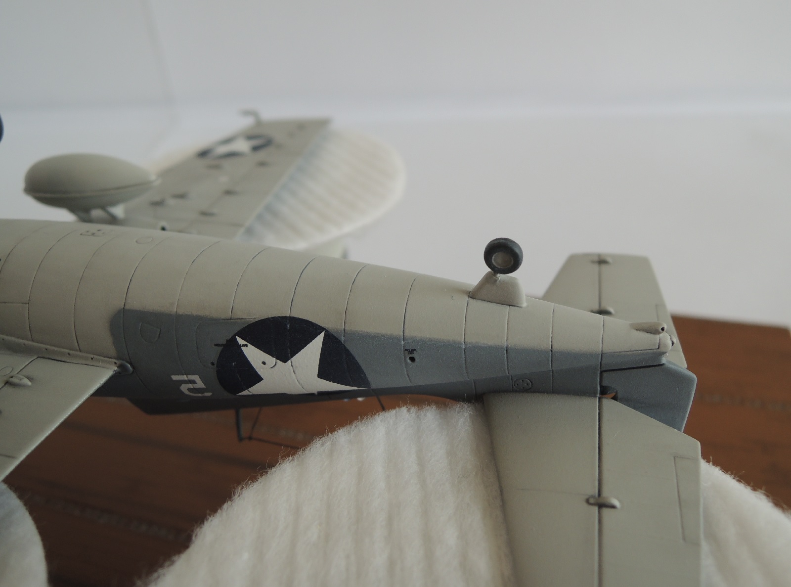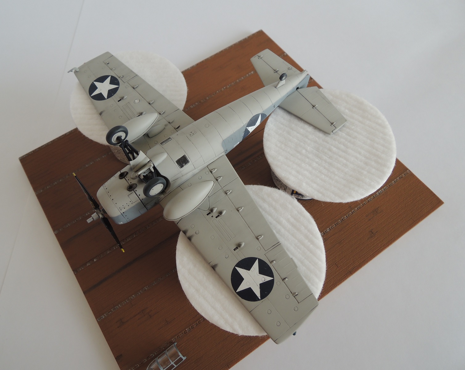 Критику относительно цвета учту в Wildcat от Airfix, хотя краску долго выбирал по палитрам и кодам, в реале она более голубая, чем на фотографиях. Нагар от выхлопа присутствует как на брюхе фюзеляжа, так и на внешней поверхности створок шасси (фото № 38).
