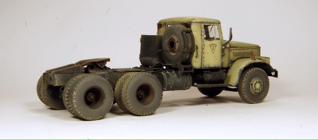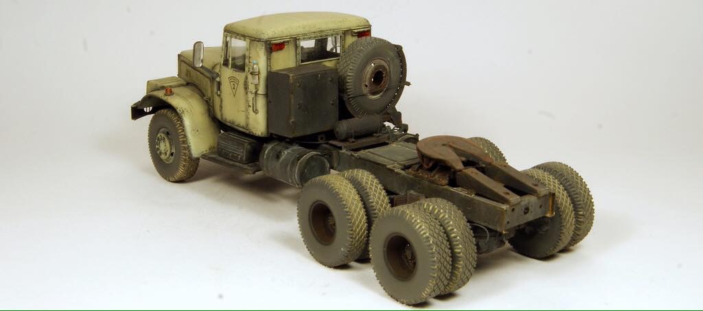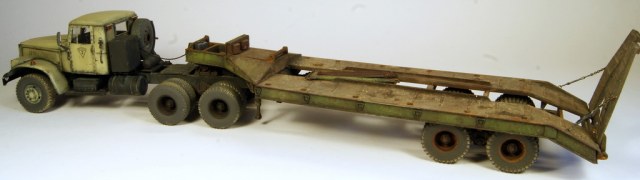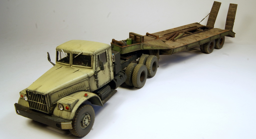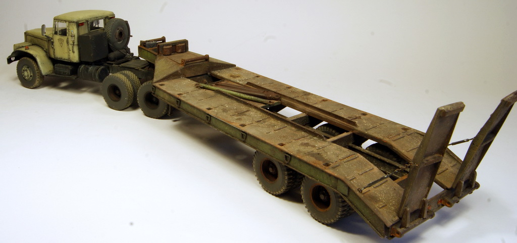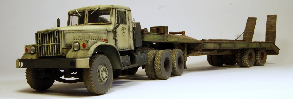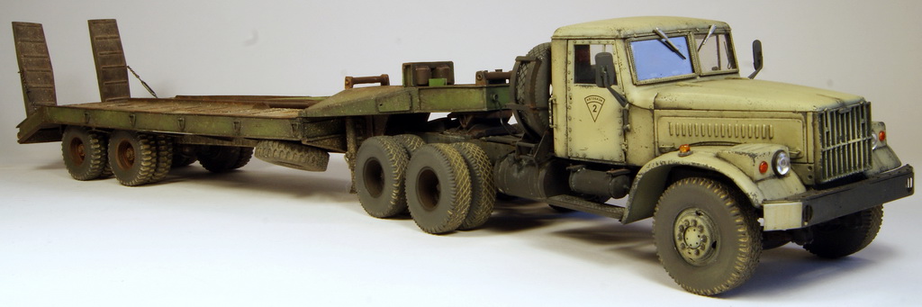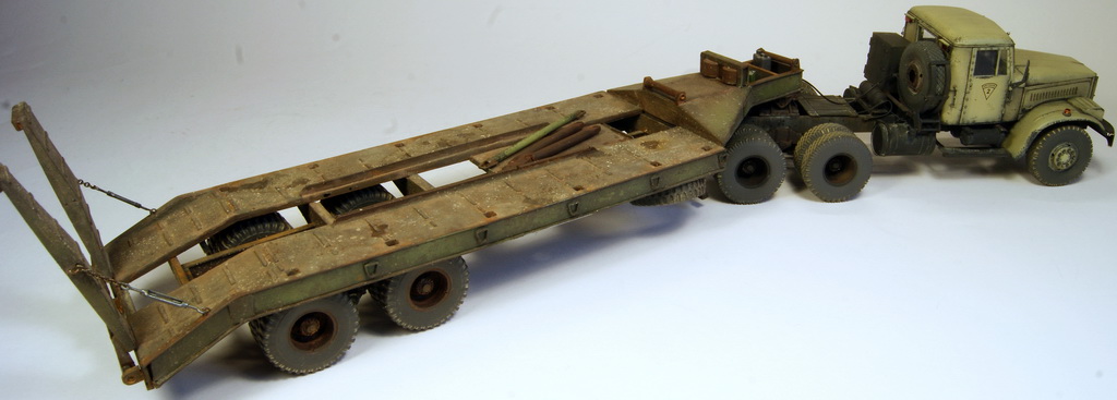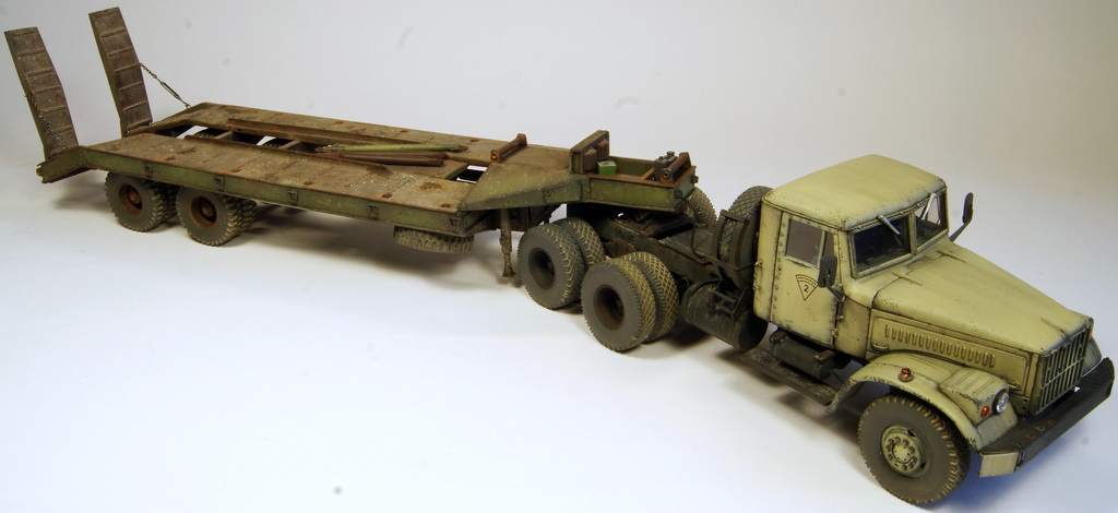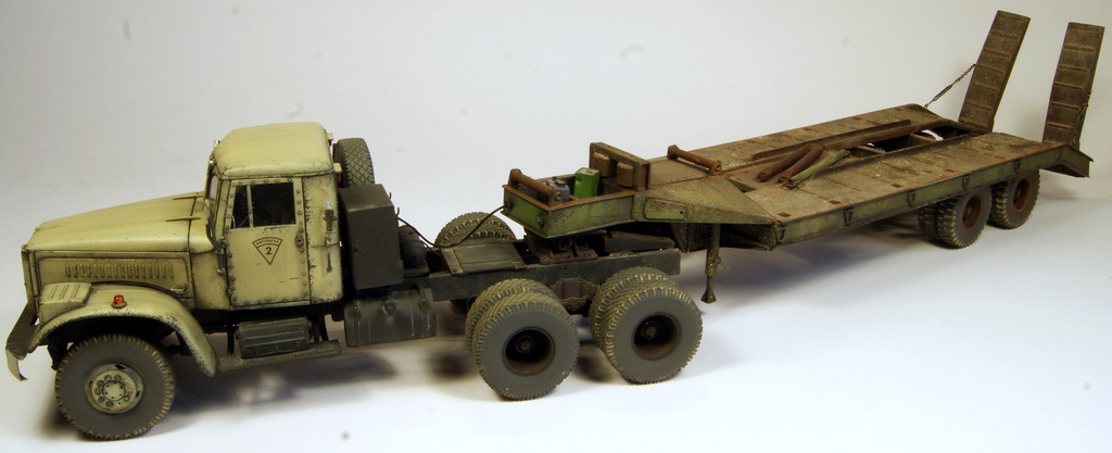 Я уже пытался пару лет назад изобразить эту машину с помощью конверсии от Panzershop и китайского прицепа, но получившийся результат казался каким то мультяшные и игрушечным. Второй заход, теперь в качестве базы для тягача были использованы травленая рама ходовая часть от Customfactory, и более "родной" трейлер МАЗ от того же производителя.