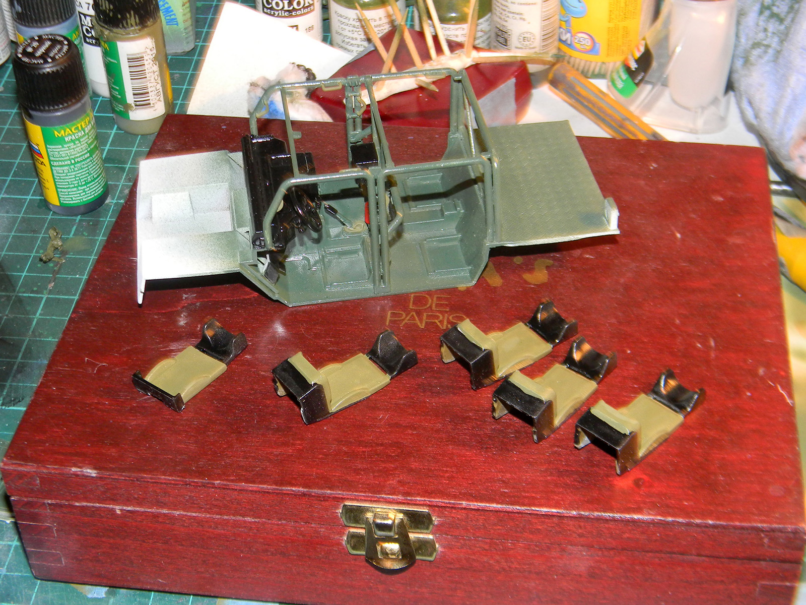 Красил модель Мастер-Акрилом от Звезды. Базовый цвет - зеленый. Немного высветлений Хакки. Черный местами (все, кроме нижней части корпуса) нанесен кистью от руки. Глянцевый лак под декали и смывку - Футура. Смывка- Миговская. Финишный матовый лак- Мастер-Акрил.