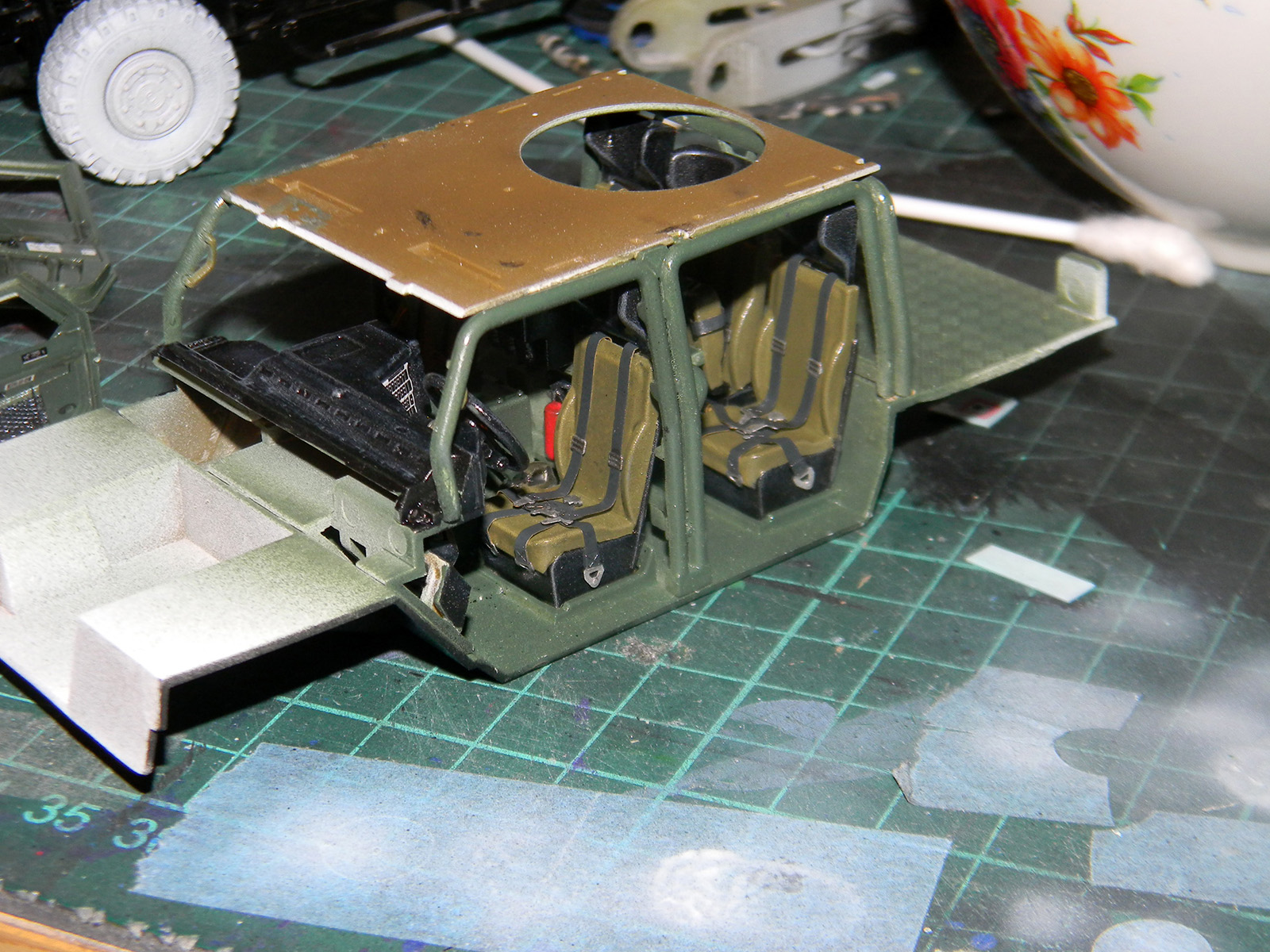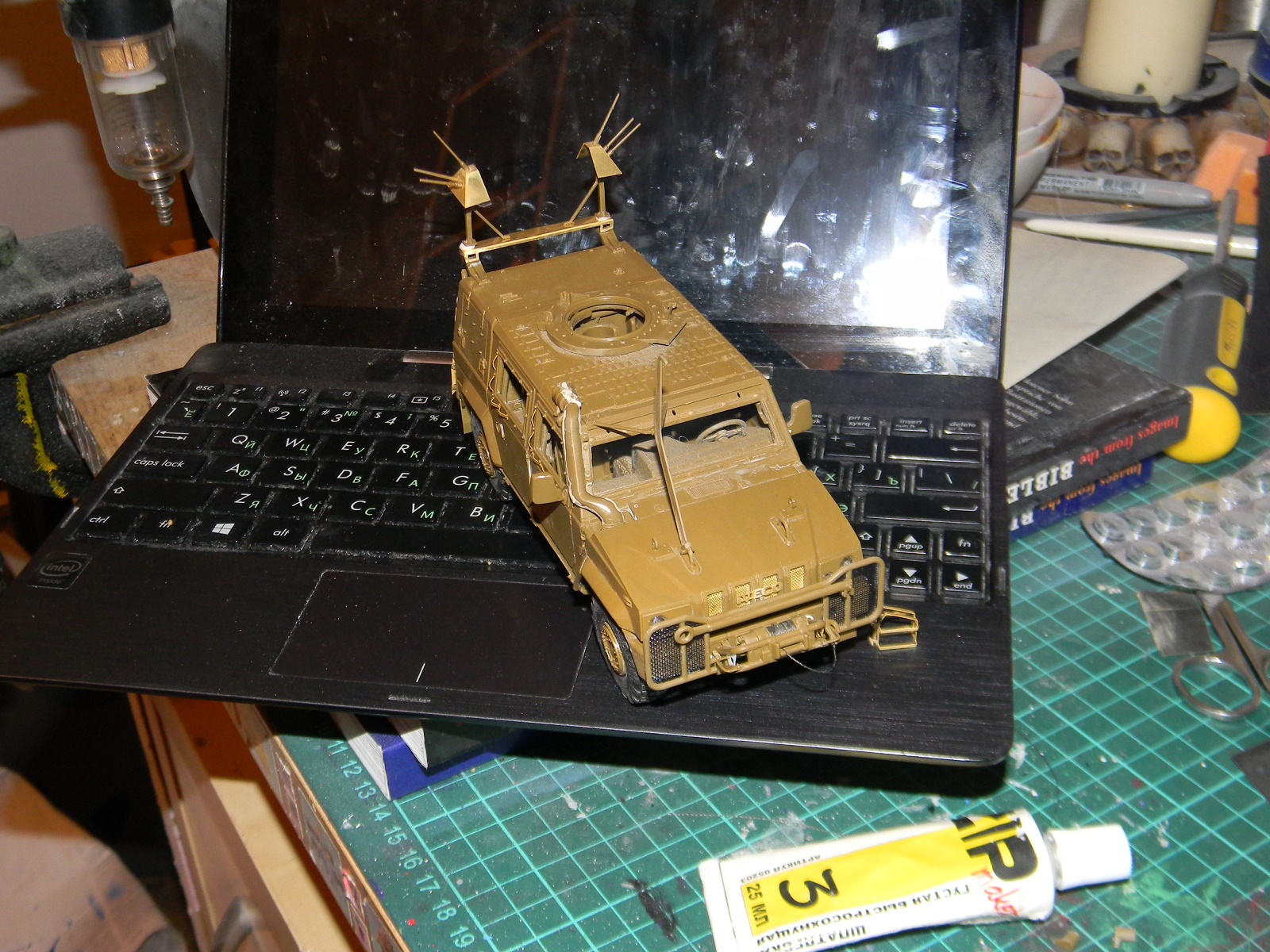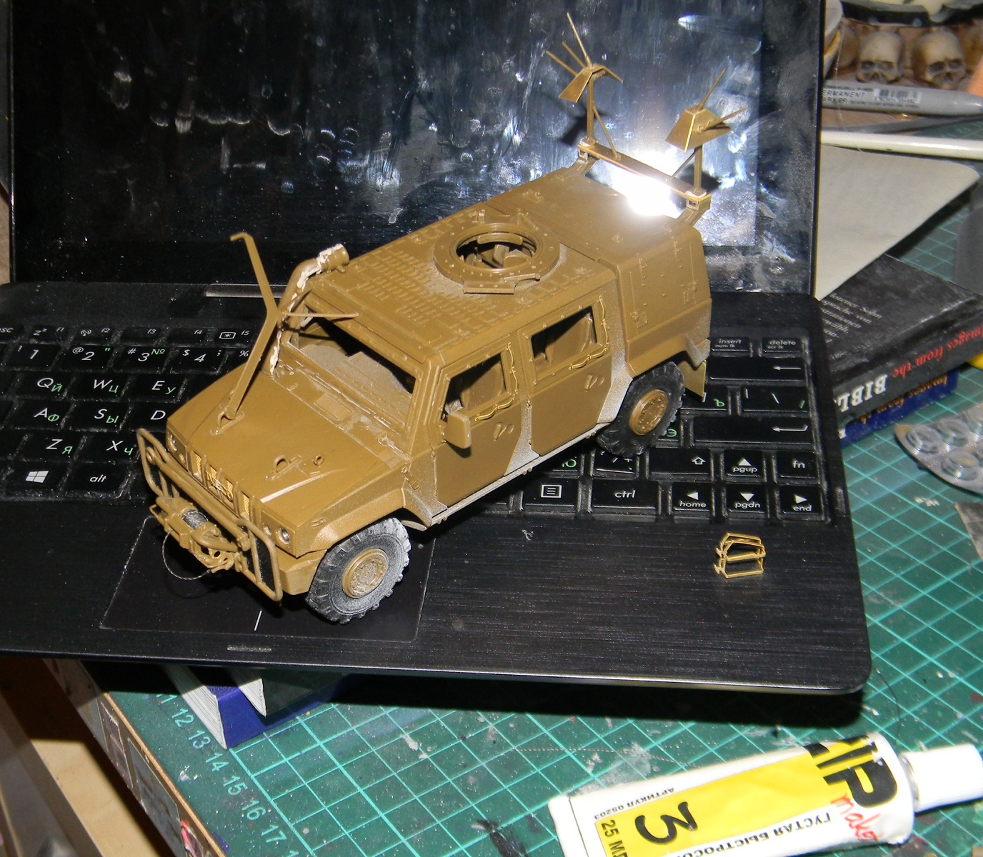 Пачкать машину не стал. В Афганистане все машины пыльные, а пыль забивает рельеф модели. Да и фиксатора пигментов под рукой не было. Так что машина у меня чистенькая, у Миши же - бывалый вариант)