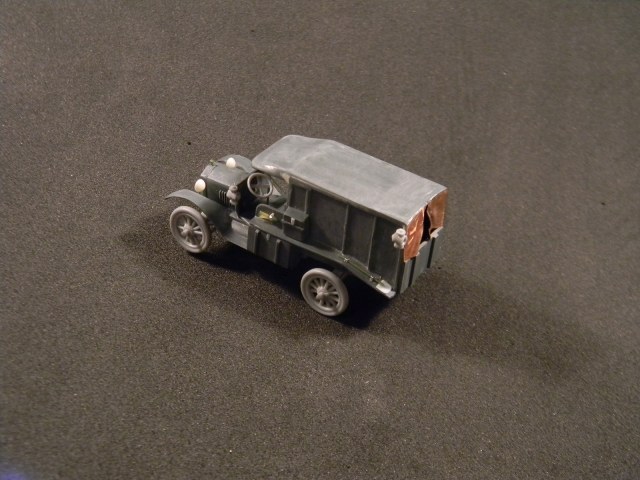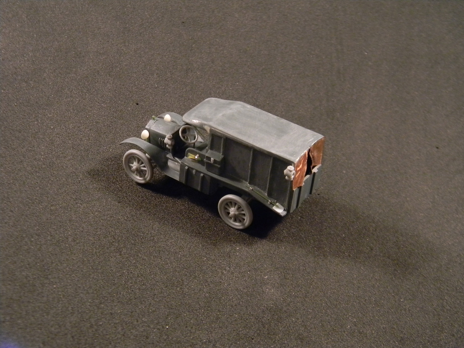 Сборка велась почти из коробки. От себя добавил только заднюю часть тента из медной фольги, рычаг переключения коробки передач, лопату, тросы тента, решетку радиатора, фары заменил на Эльф, или высверлил родные и поставил в них отражатели, из подручных деталей сделал клаксон. Сточил толщину крыльев.