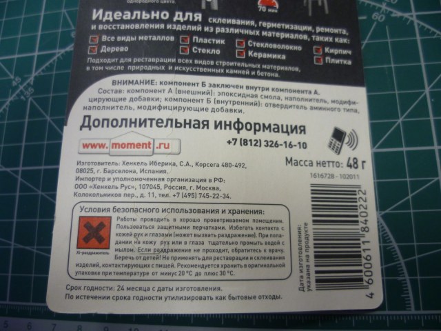 Двухкомпонентный эпоксидный состав 2 в 1 на основе эпоксидных смол. Применяется для склеивания, герметизации, ремонта и восстановления изделий из различных материалов: всех видов металла, дерева, керамики, стекла, стекловолокна, пластиков, кирпича, плитки, мрамора, цемента и других материалов. Момент Эпоксилин идеален для восстановления недостающих частей, для заполнения вмятин, сколов, трещин, подходит для реставрации всех видов строительных материалов, в том числе природных и искусственных камней и бетона. После отверждения клеевой шов можно полировать, сверлить, красить.
