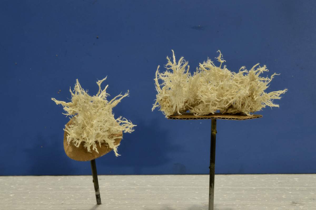Теперь переходим к изготовлению куста. Обычно я вырезаю небольшой овал из картонки, и на него приклеиваю кусочки мочалки произвольной формы, делая основание куста, при этом пинцетов немного распушаю мочалку. Далее пинцетом продёргиваю мочалку маленькими кусочками и приклеиваю к основанию на супер клей. Получается вот такая конструкция (фото № 13) .