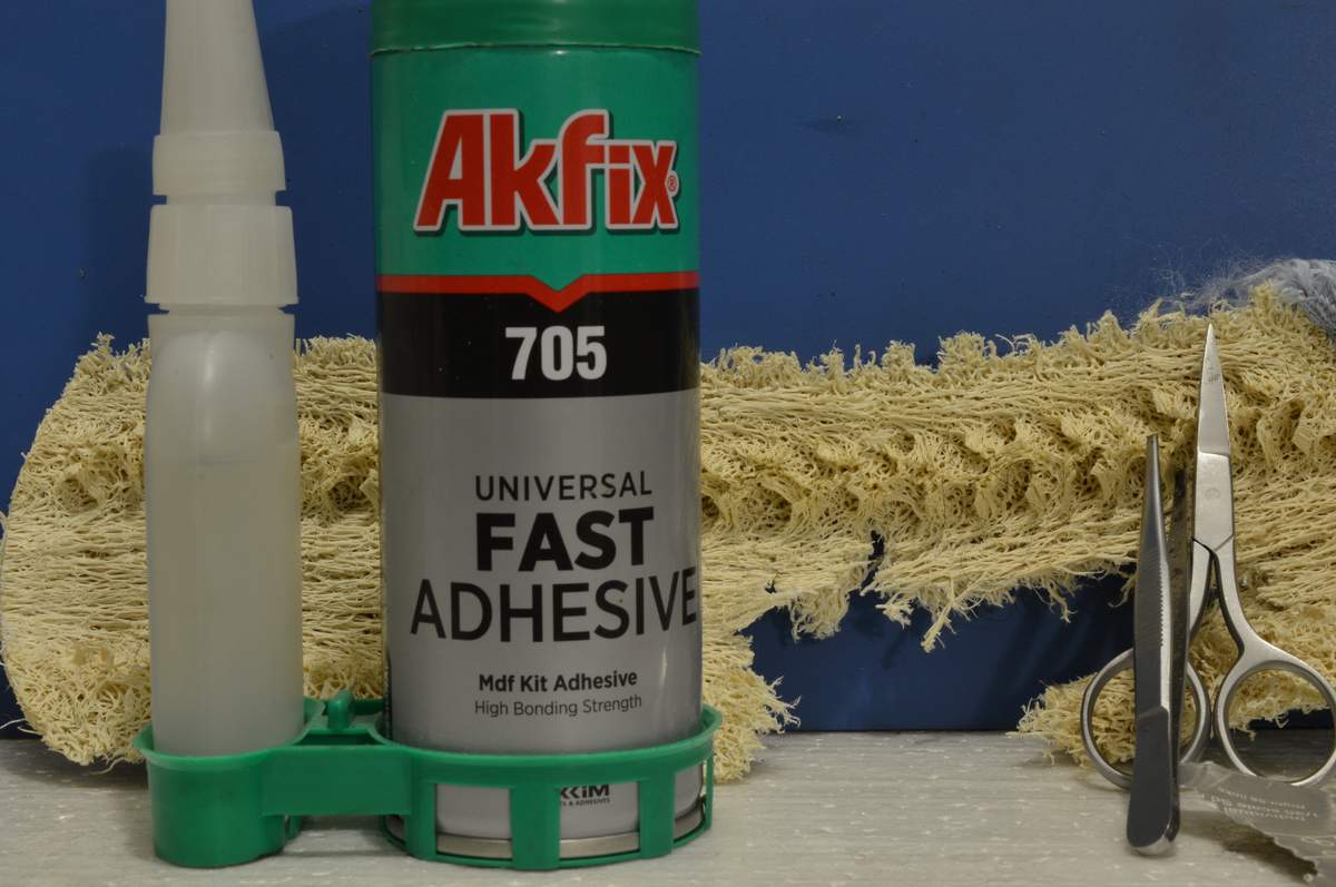 Также потребуется супер клей, ножницы, пинцет, мочалка для купания, картонка, лак для волос и посыпушка-листва, я для этого использую Noch декор Листва, декор трава двух оттенков. Этих пакетиков вам хватит очень и очень надолго, для изготовления минимум нескольких квадратных метров. Ещё потребуется поролон, мелки пастели и ещё я использую высушенный перемолотый мох. Сушёный мох очень хорошо перемалывается пальцами рук, т.к. его требуется очень немного. А также подкрашенный разными оттенками зелёного сантех лён для более высокой травы или цветов. Кто-то спросит: почему супер клей, а не ПВА? Быстро сохнет. Это большое преимущество (фото №2,3,4).