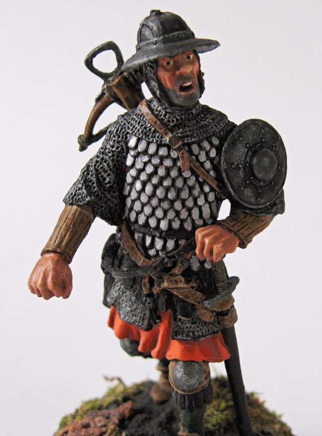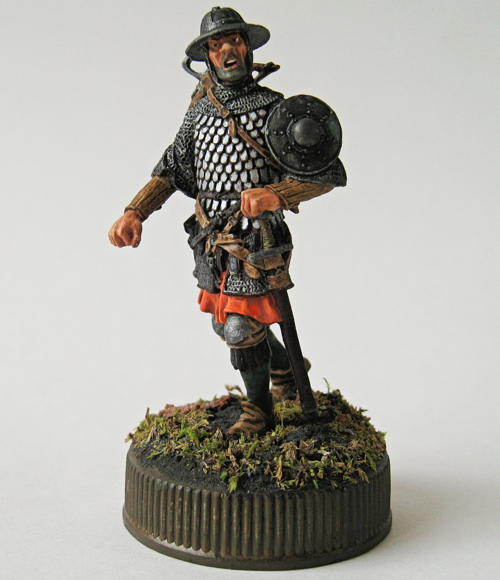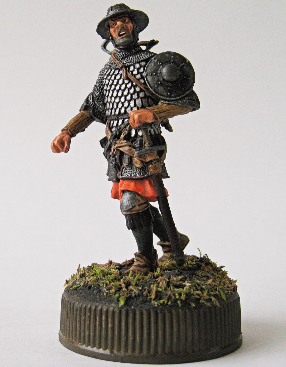 Кольчуга была высветлена, однако пришло решение изобразить натертые чешуйки брони и чтобы с контрастировать залил кольчугу. Тетива, что да, то да. Есть у меня еще один арбалетчик, там исправлю. Честно-честно) С кулаками, возможно Вы и правы, но понимаете, пока закончишь, глаз замылится( Как уже писал - хотелось изобразить полированные чешуйки, но не каждую полированную отдельно (арбалетчик, не рыцарь), а послушав приятелей реконструкторов - полированную в бочке с песком)