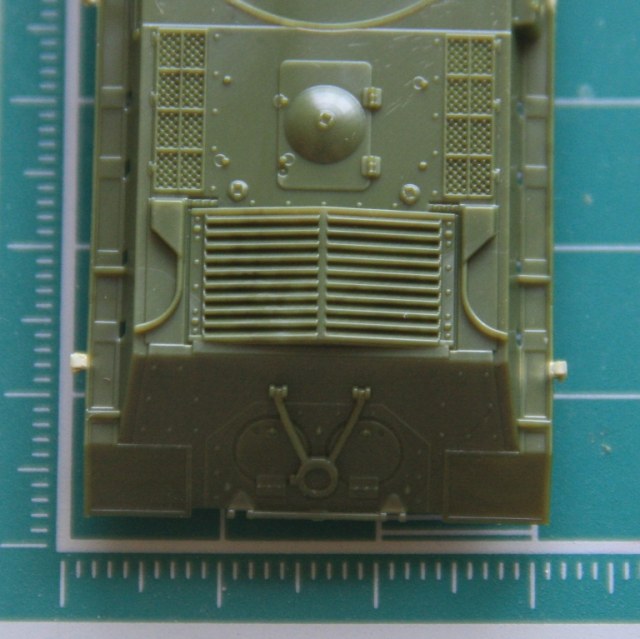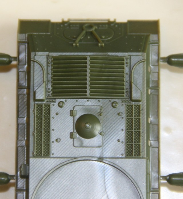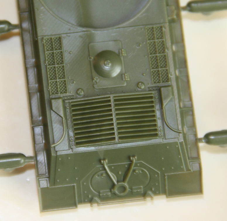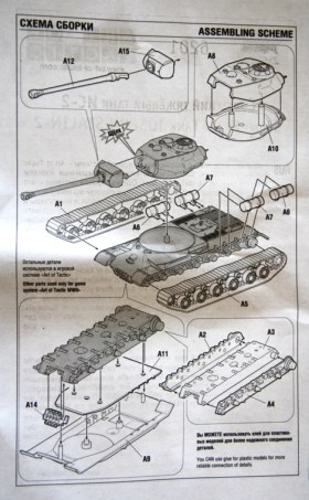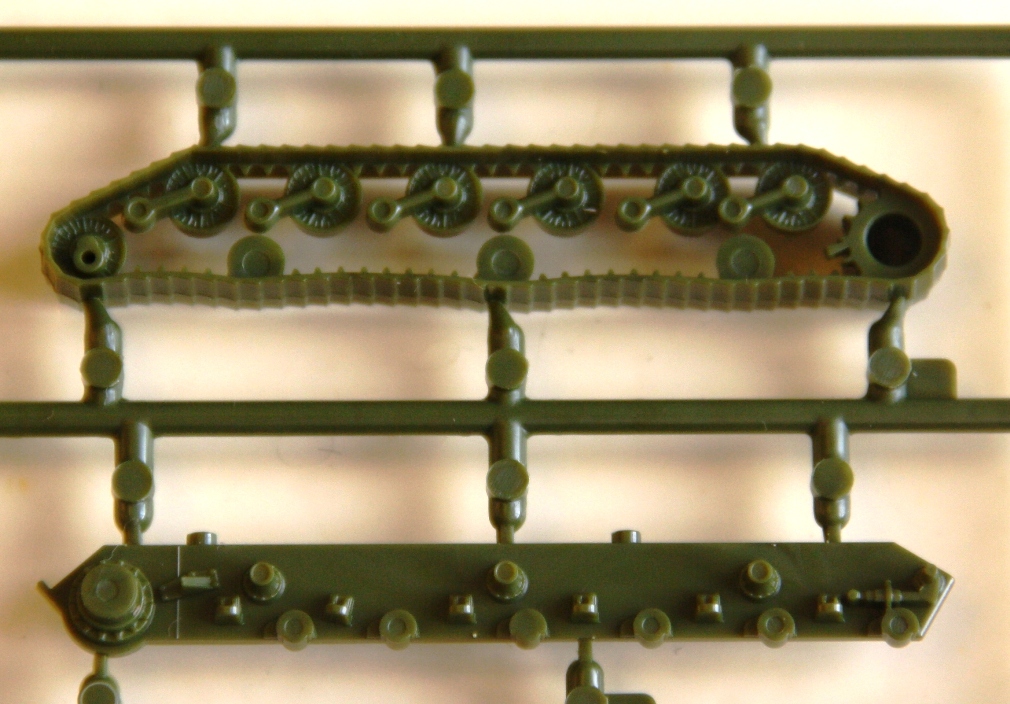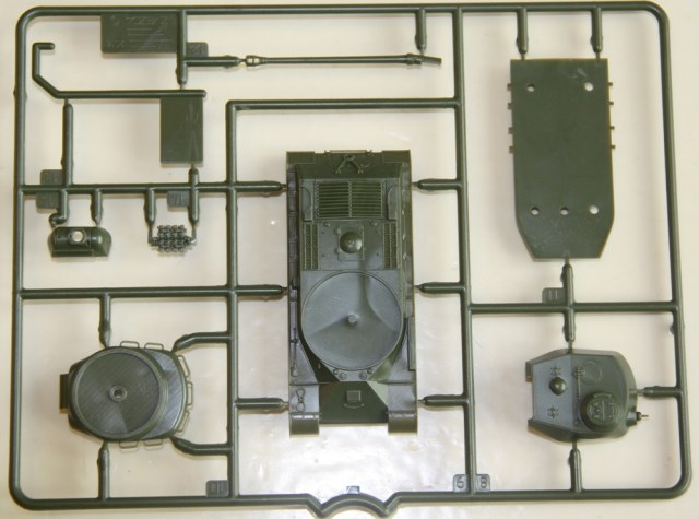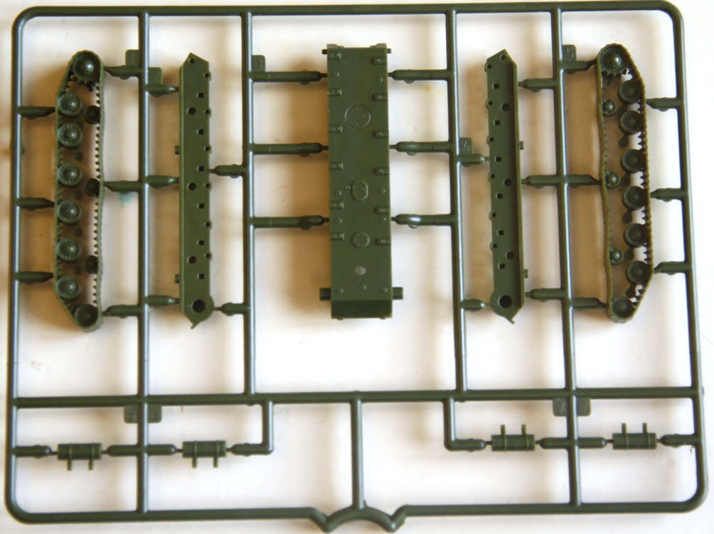 Литники из традиционного для советской техники этой серии пластика защитного цвета, литье очень качественное, облоя и утяжин нет. Очень порадовало исполнение ходовой, гораздо ближе к реальности, чем на КВ из этой же серии. Ствол отлит очень аккуратно, дульный тормоз без облоя, осталось только просверлить отверстие канала ствола. Решетка МТО отлита «сквозной» и смотрится весьма реалистично. Из недостатков – упрощенно деталированые траки,которые стали уже какой – то традицией для звездовских «клопов» и, судя по инструкции, неподвижный ствол.
