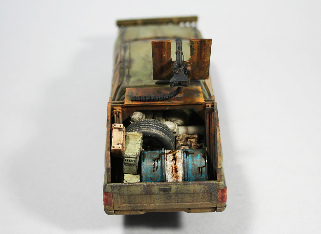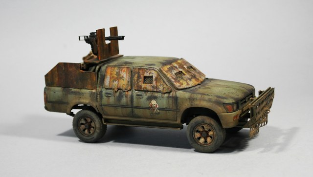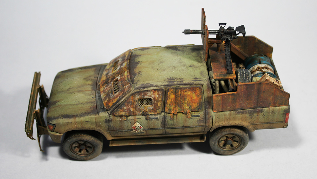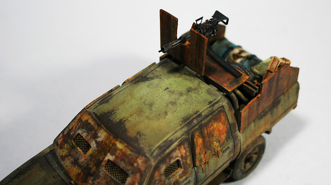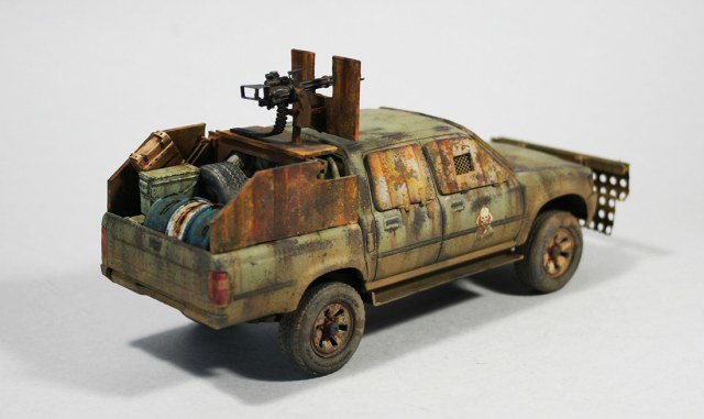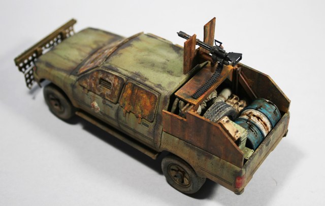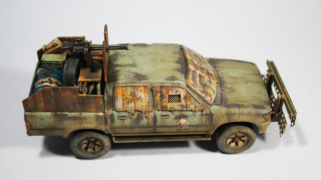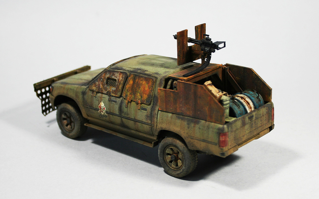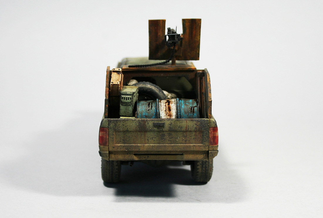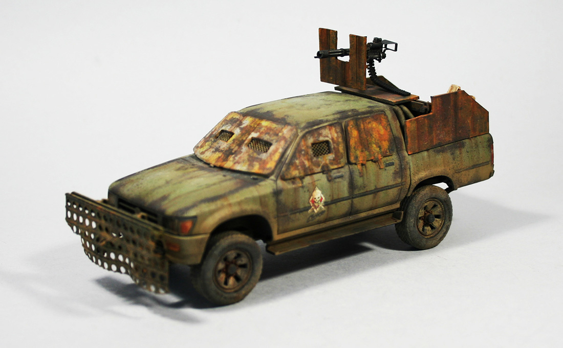 Сама модель - пикапчик от Meng. В кузов накидано ноунейм смолы и бочка от Tamiya. Кстати весь профиль и доп.листы от нее же. Миниган, я так полагаю, от Legend. Местами использовано фототравление из личных запасов)