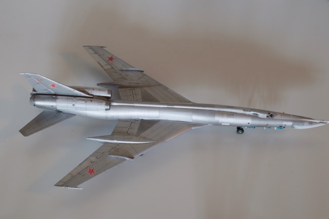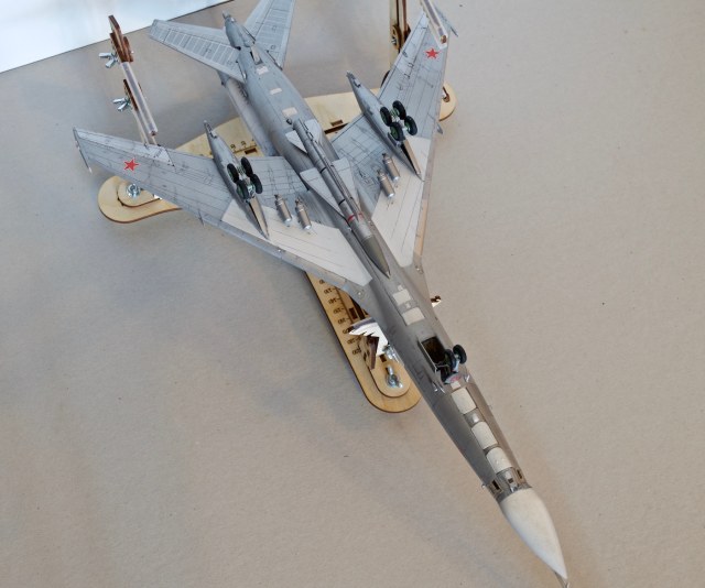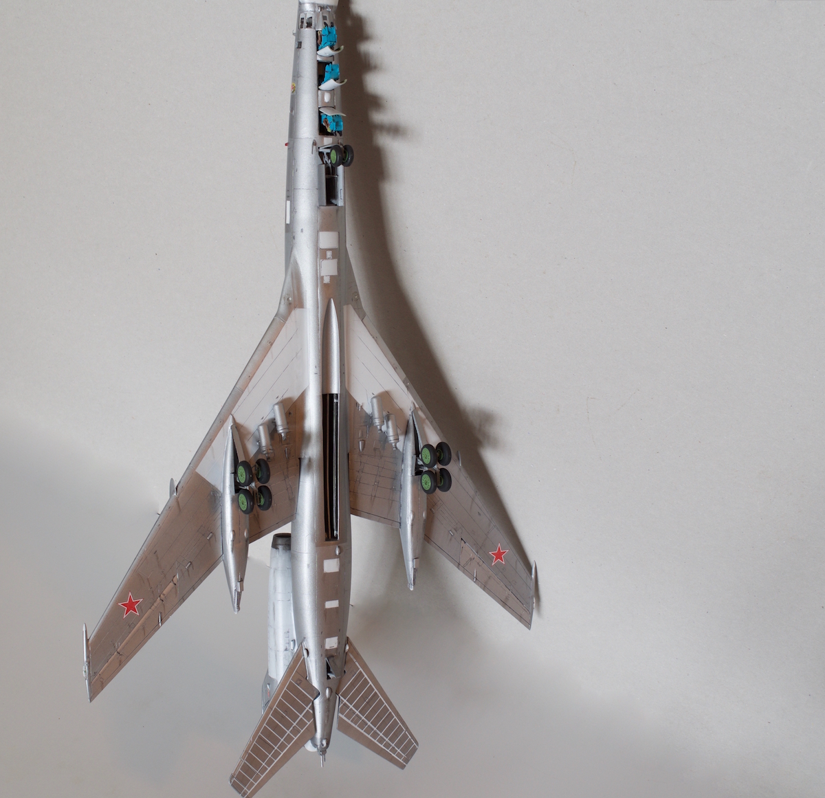 Дополнений не много, но они есть. Очень хотелось представить модель в 2х вариантах - с креслами пилотов и с закрытыми люками и с установленой учебной крылатой ракетой Х-22. Захотел прикрепить и пороховые ускорители. Они испытывались, как я понял на самолетах без дозаправочной штанги, на ранних образцах.