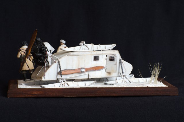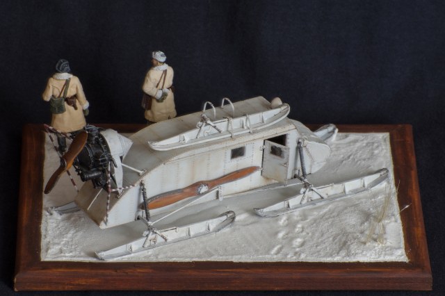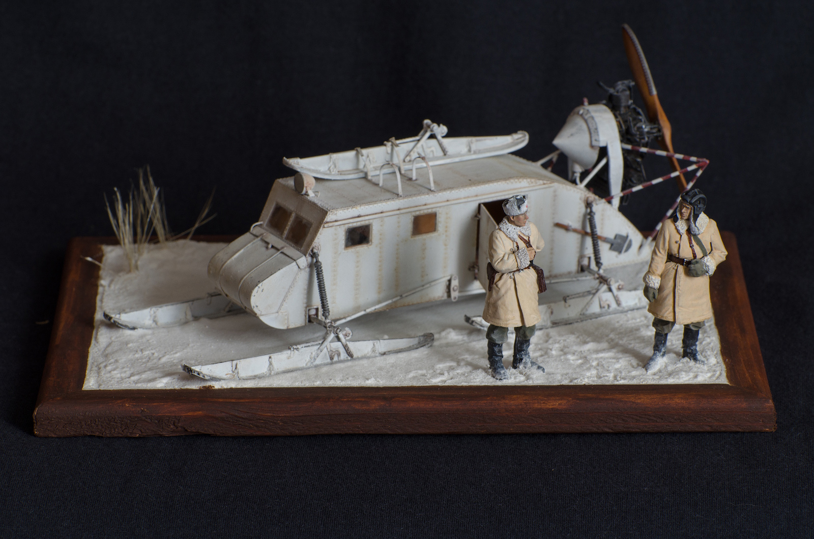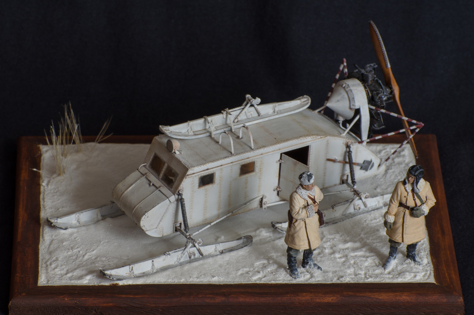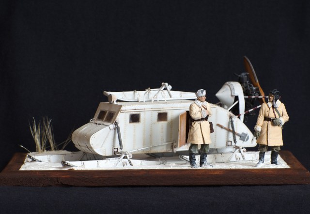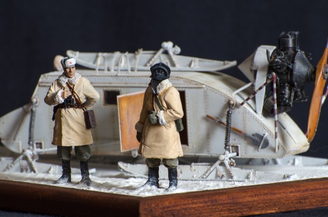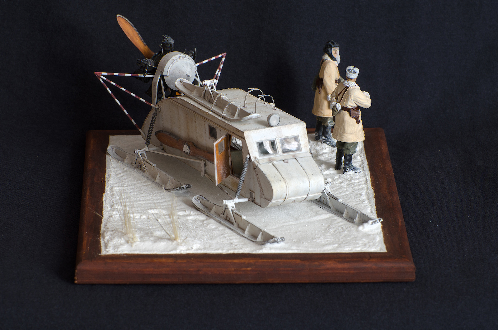 Аэросани НКЛ-16-41 от Trumpeter. В комплекте немного травления, так же переделал амортизаторы, сделал рабочими двери, фара Elf. Конечно, по-правильному, надо было срезать имитацию заклёпок, т.к. сани были фанерные, но оставил так (прошу за это сильно не ругать). Фигуры смоляные заказал с AliExpress.