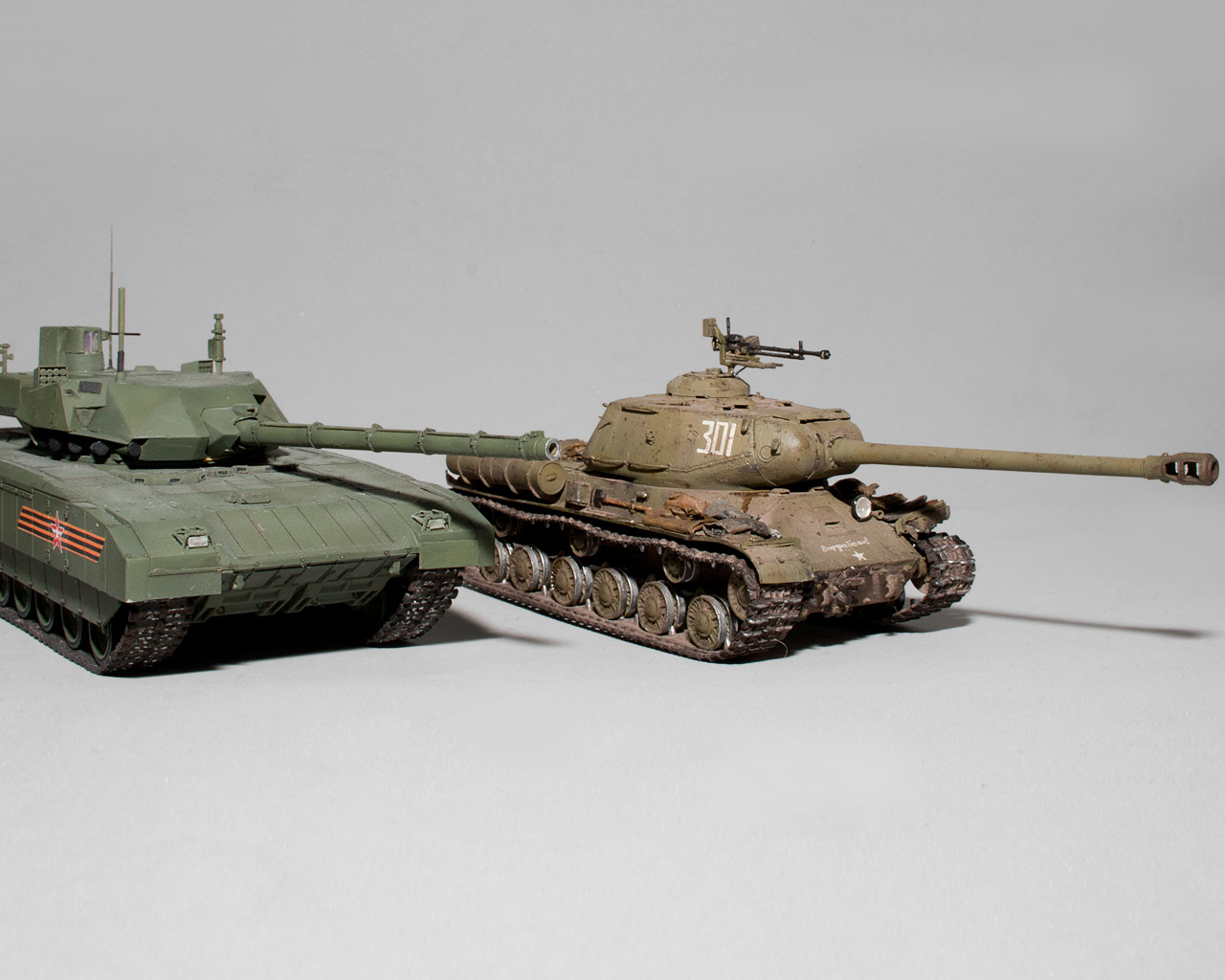 С Т-14 какая петрушка, это парадный танк, а его нехорошо доводить до такого же состояния, рвать крылья, разливать масло, наваливать хабар. Поэтому всё в точности с прототипами.