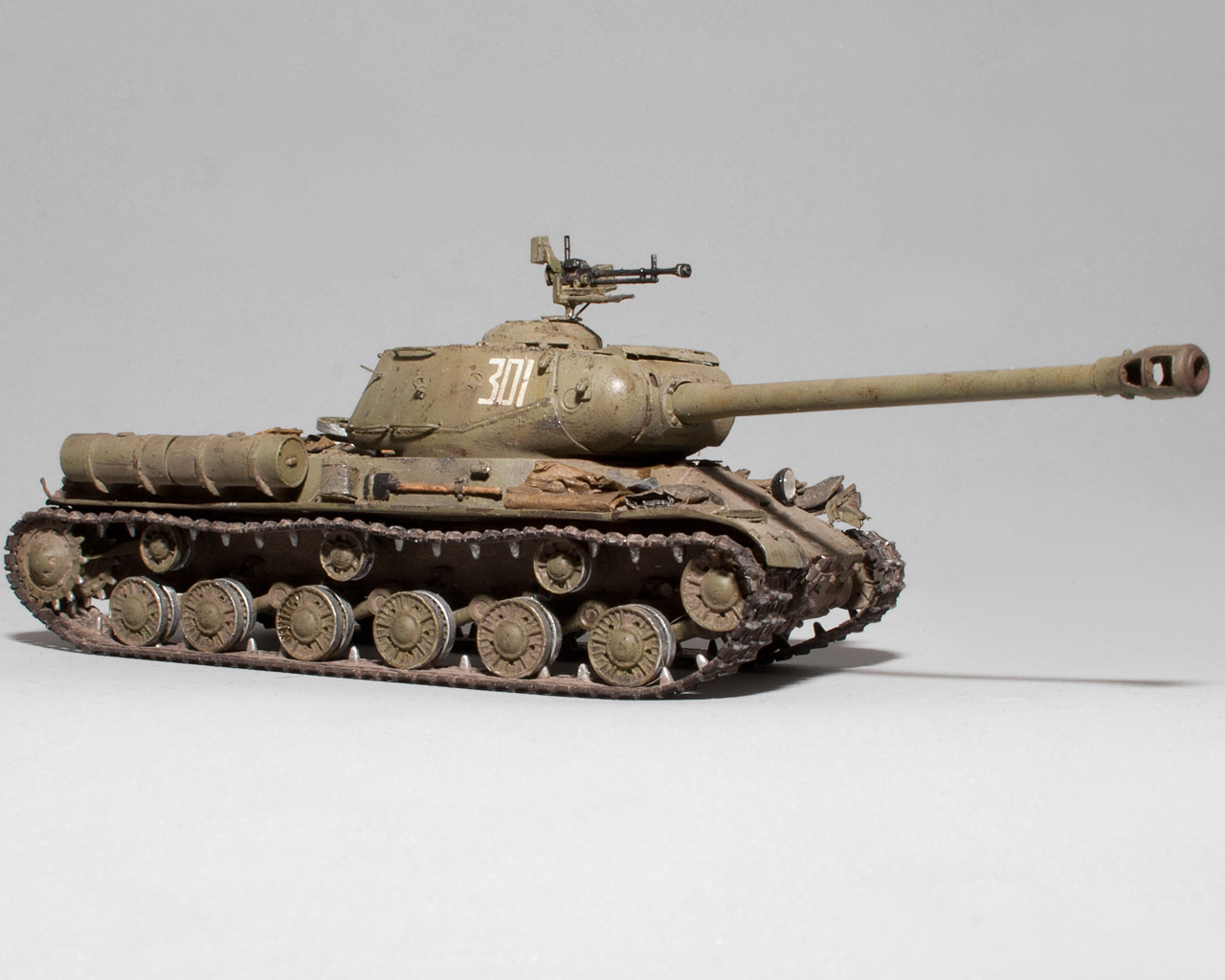 ИС-2, принятый на вооружение в конце 1943 года, представляет собой модификацию танка ИС-1 с вооружением, усиленным за счет установки мощной 122-мм пушки Д-25 с дульным тормозом. Новая боевая машина обладала всеми качествами, необходимыми для борьбы с любым танком противника: мощная пушка, повышенная броневая защита и надежная силовая установка. В 1944 году ИС-2 был модернизирован. Новый образец имел наклонную лобовую часть корпуса, вместо смотрового люка механика-водителя - щель, закрытую стеклоблоком. На кронштейне, закрепленном на подвижном погоне командирской башенки, установили крупнокалиберный зенитный пулемет. Всего было выпущено 3750 тяжелых танков ИС-2.