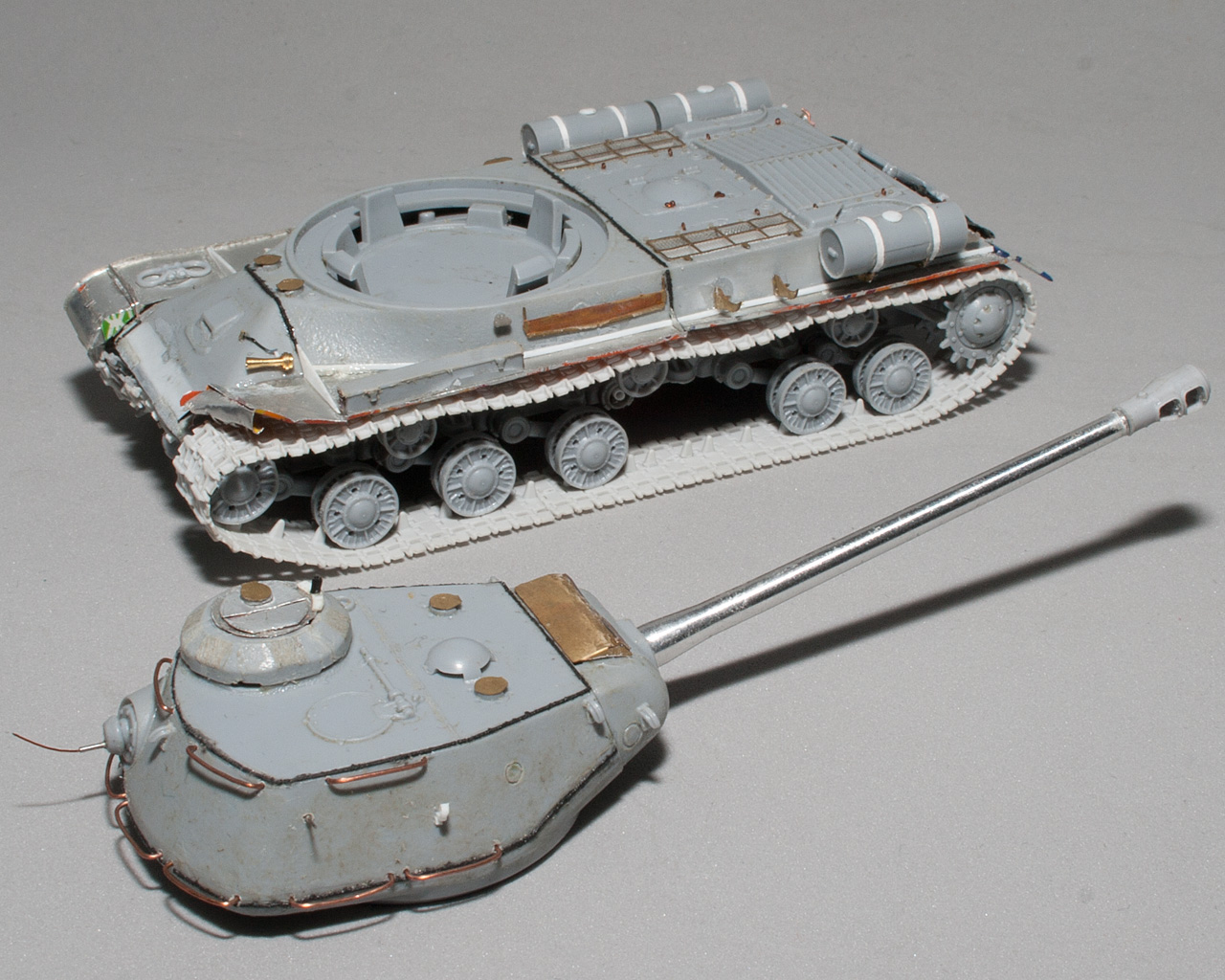 В качестве базовой была взята модель от Звезды, неплохая модель, но требующая доработки. В первую очередь переработке подвергся нос, скруглены острые грани, форма носа переделана с литого на сварной, который был характерен танкам производства УЗТМ. Оформлен раскрой бронеплит по корпусу, сымитирована фактура литой брони на корпусе и башне, сварные швы выполнены из тянутого литника. Полки у модели Звезды расположены низко, из-за чего не остаётся места между ними и гусеничной лентой. С пластиковыми полками было неудобно работать, поэтому они были заменены на самодельные из пивжести. Из дополнений использовано: