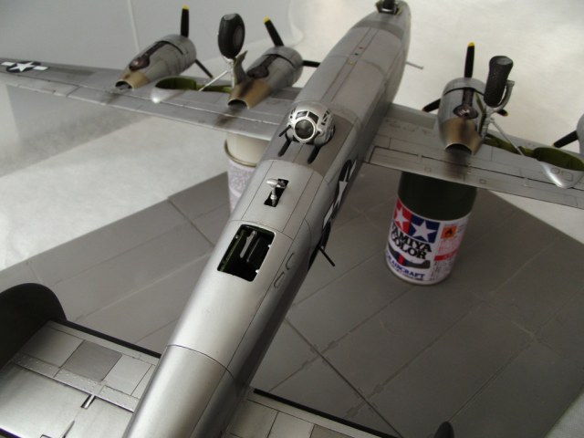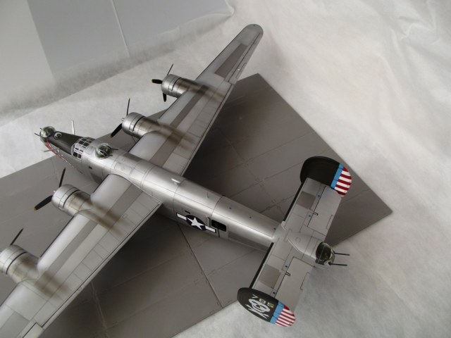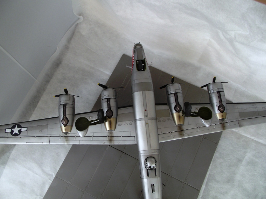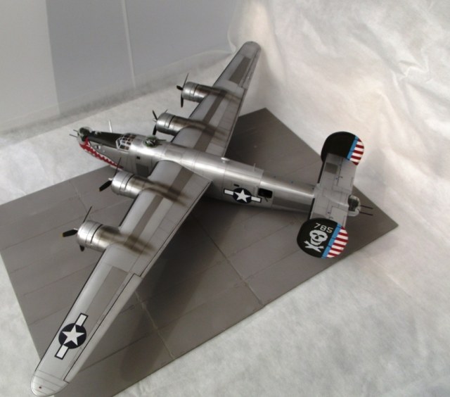 Доработка фюзеляжа, кроме нарезания расшивки, свелась к тому, что в хвостовую секцию и в месте размещения бомбовых отсеков были вклеены распорки для придания большей жесткости и выравнивания бортов. Заменена часть остекления (не заменял только кабину бомбардира и стрелковые башни). Затем модель была собрана насухо и вывешена для определения массы груза для предотвращения опрокидывания на хвост. Получилось около 150 граммов. Для его размещения пришлось занять всё подкабинное и закабинное пространство. Створки бомболюков были установлены в закрытом положении. На этом работа с фюзеляжем была завершена.