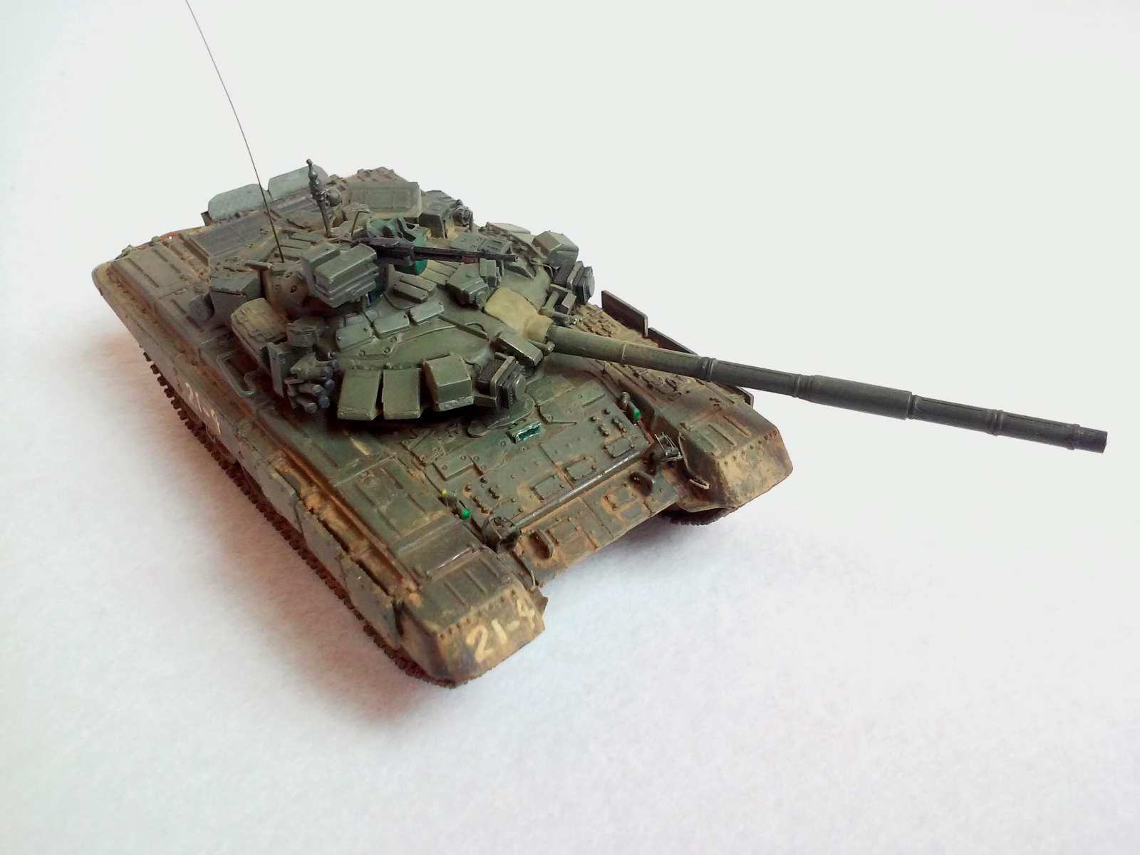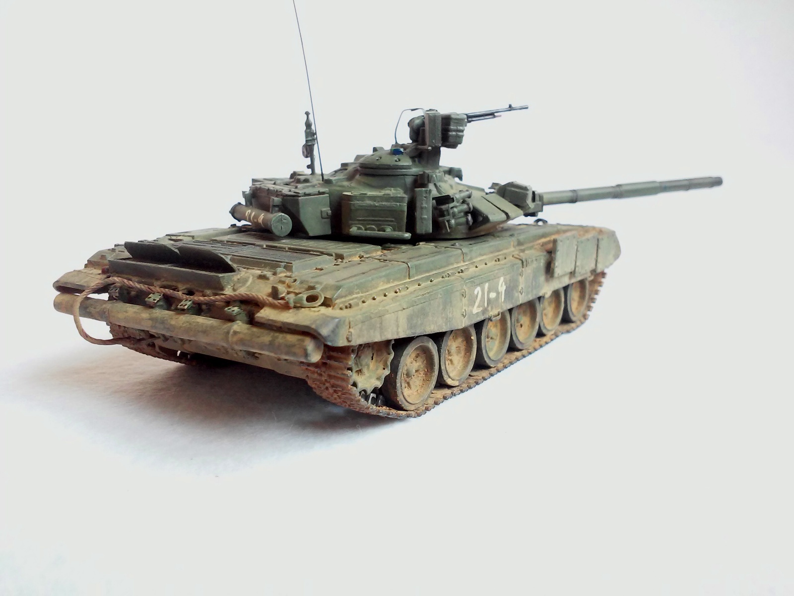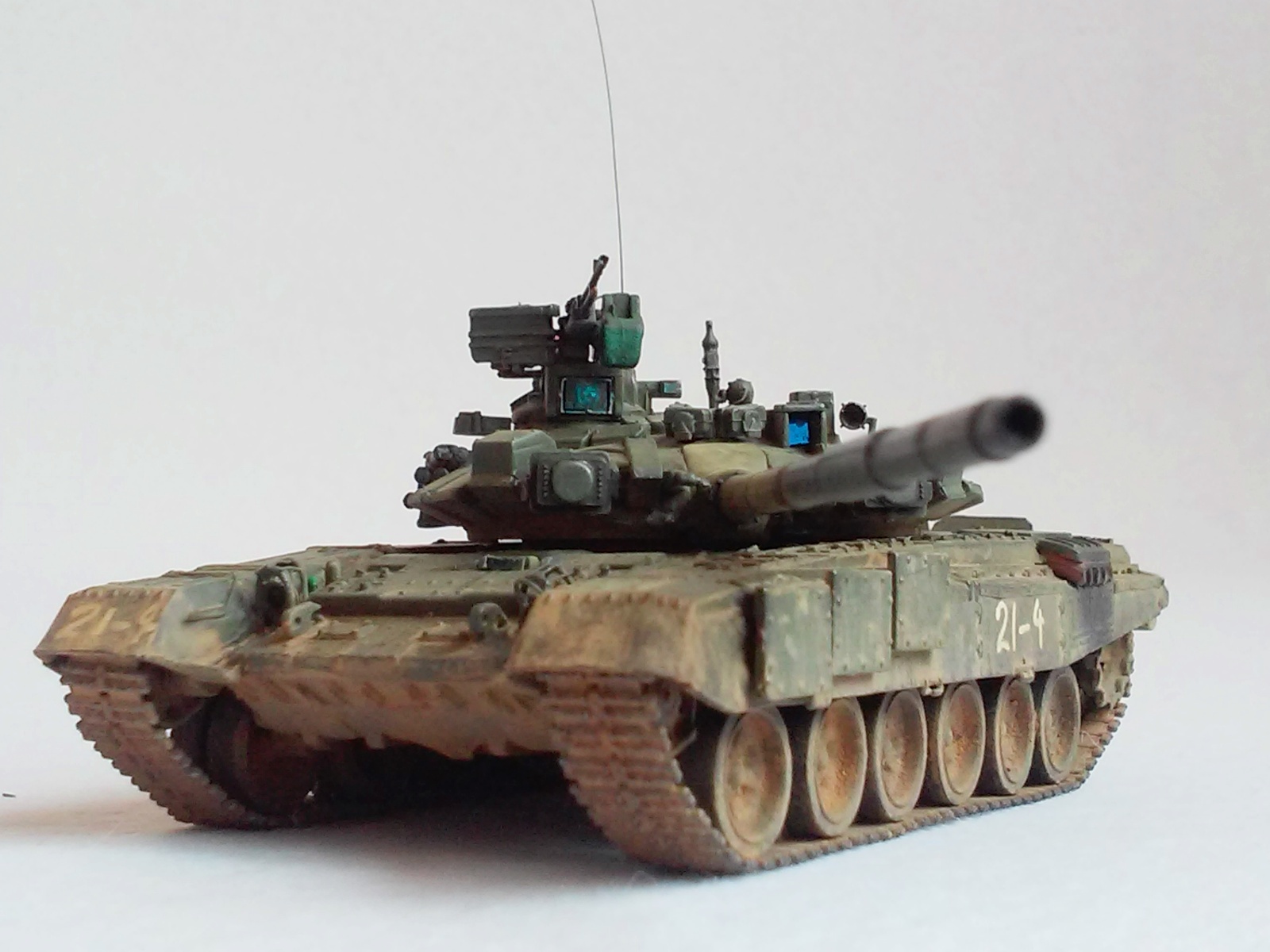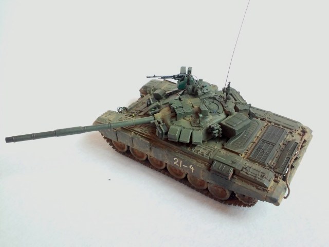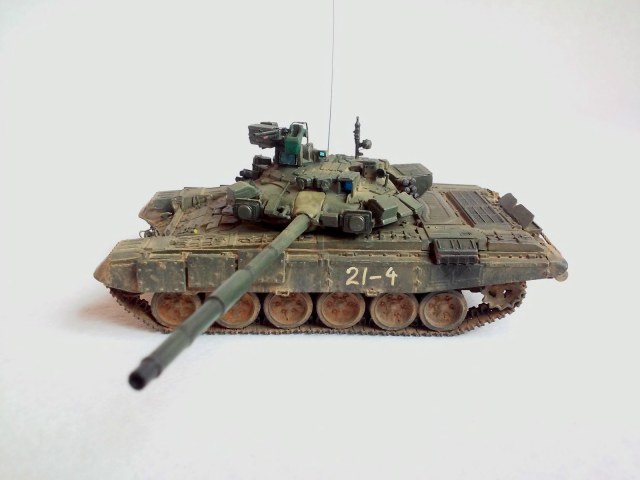 Все доброго... Ну что там у вас сейчас... ))) В общем всех приветствую!!! Перед вами еще один уральский сириец - оновной танк Т-90 от МС. Модель делал насмотревшись разных фото по боевому присенению сирийской арабской армией девяностых разных модификаций. Вот и вышло что вышло))) Модель почти изкоробка кроме левого ЗИПа ( он от Ревелла) , гусянки (остатки гусеничной ленты от Звезды) , ограды фар ( первый раз делал из проволоки... Руки тряслись (((... Вышло кривовато((( ), скоб на передних брызговиках, троса от Eurekka. Так же доработал минимальнл проводку к Шторам и к фонарю на погодоном датчике. Еще срезал кранштейны для крепления доп. баков и доработал места их крепления. Красил акрилом разных фирм, пачкал пигментами Мастер Пигмента, оптика делалась из мишуры и красилась цветным лаком , тактич. номера рисовал от руки т. к. на прототипе они нарисованы так же от руки баллончиком. Вроде все расказал . На сим разрешите откланятся, всем удачи !!!