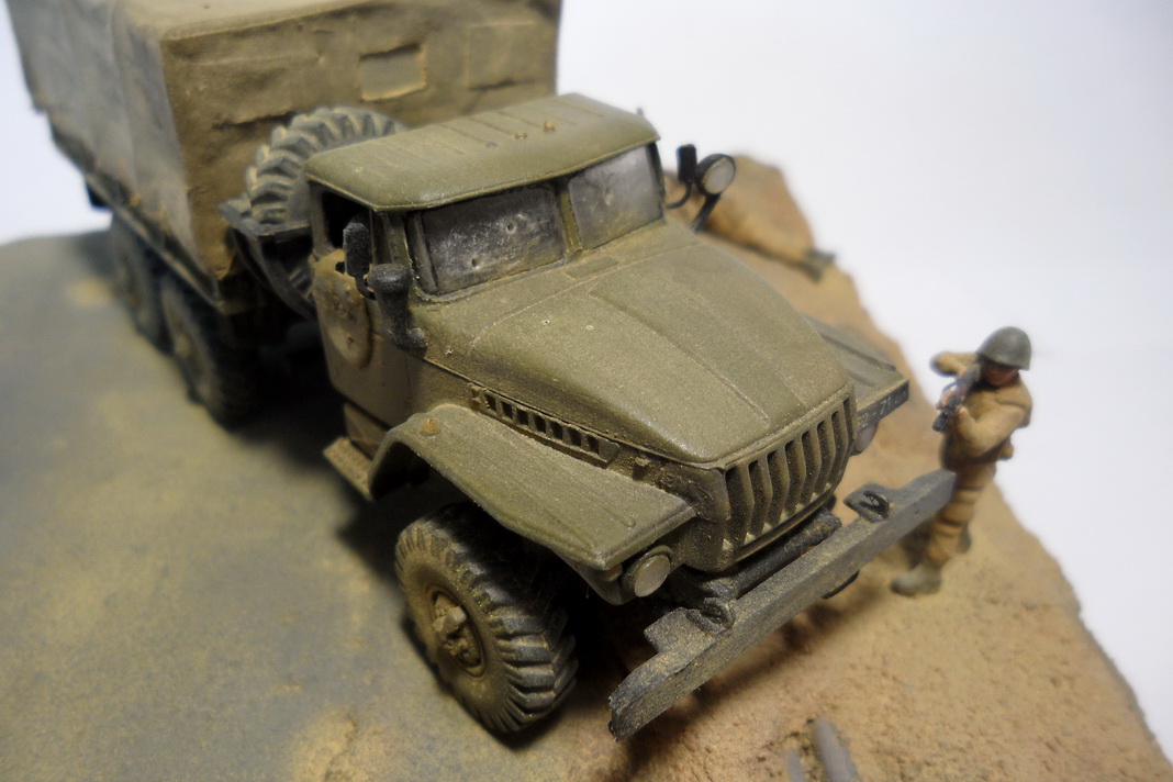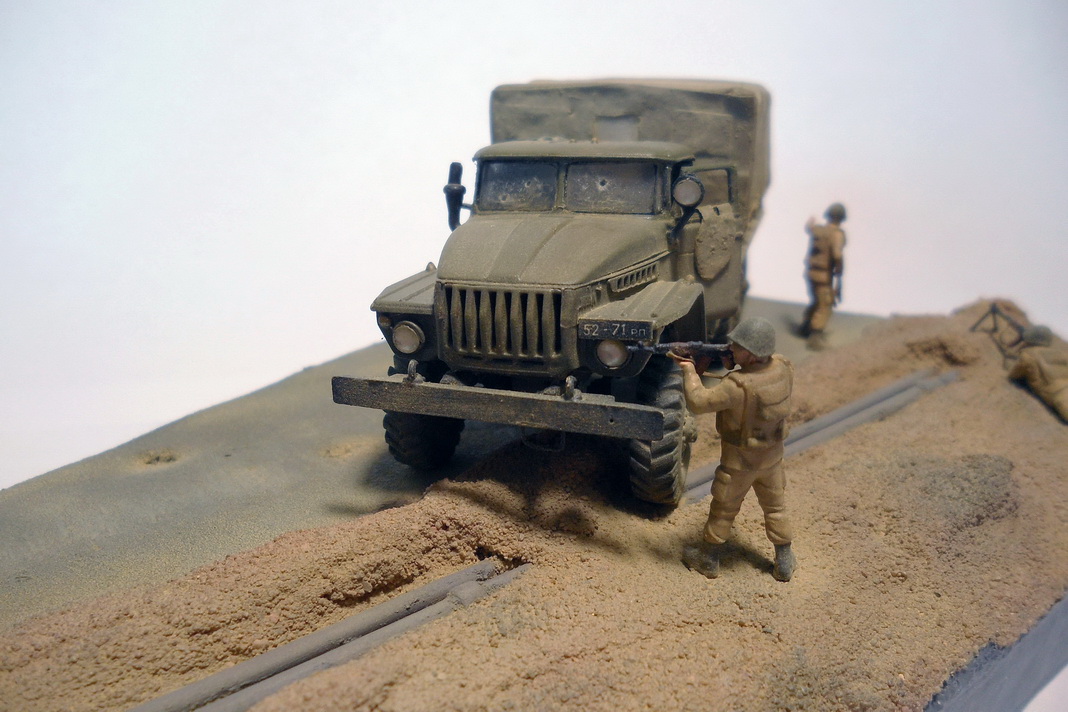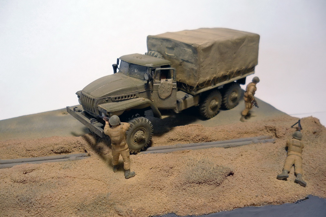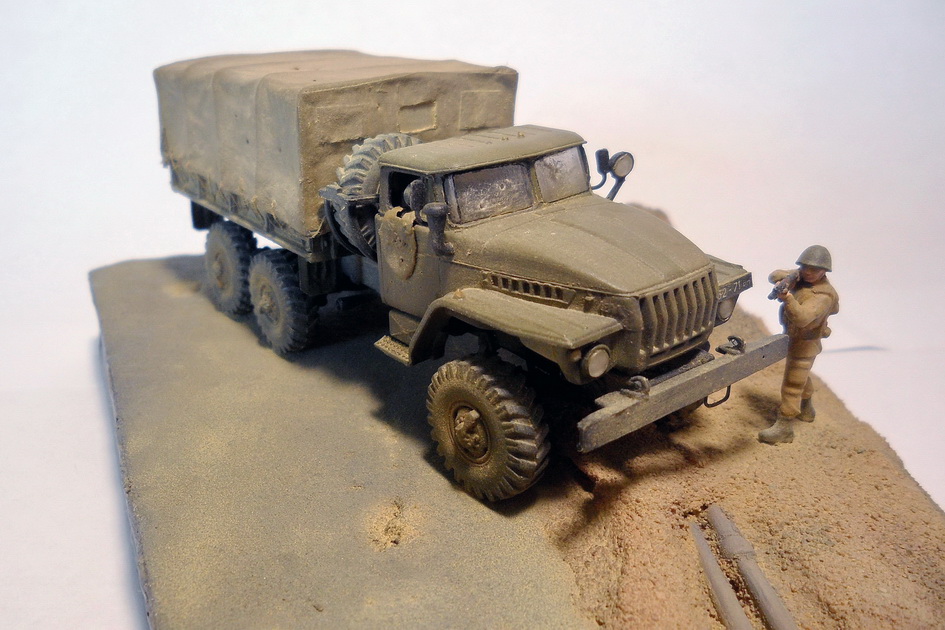 Урал-4320 от фирмы ICM. Из доработок: все поручни заменил на проволоку, сделал тент с каркасом, в кузове сделал скамейки. Фигурки - Звезда. Трубопровод ПМТП-150 из литника. Основание диорамы - пенопласт, асфальт из мелкой наждачки. Грузовик окрашивал тамиевским акрилом. Фигурки акрилом Vallejo и Мастер-акрилом Звезды. Все тонировалось пастелью.