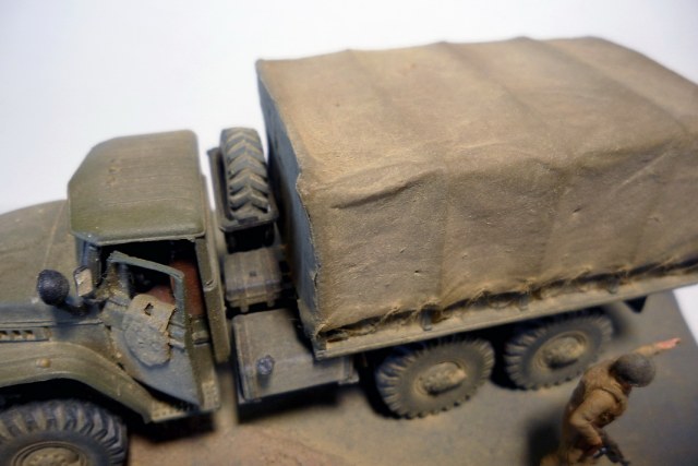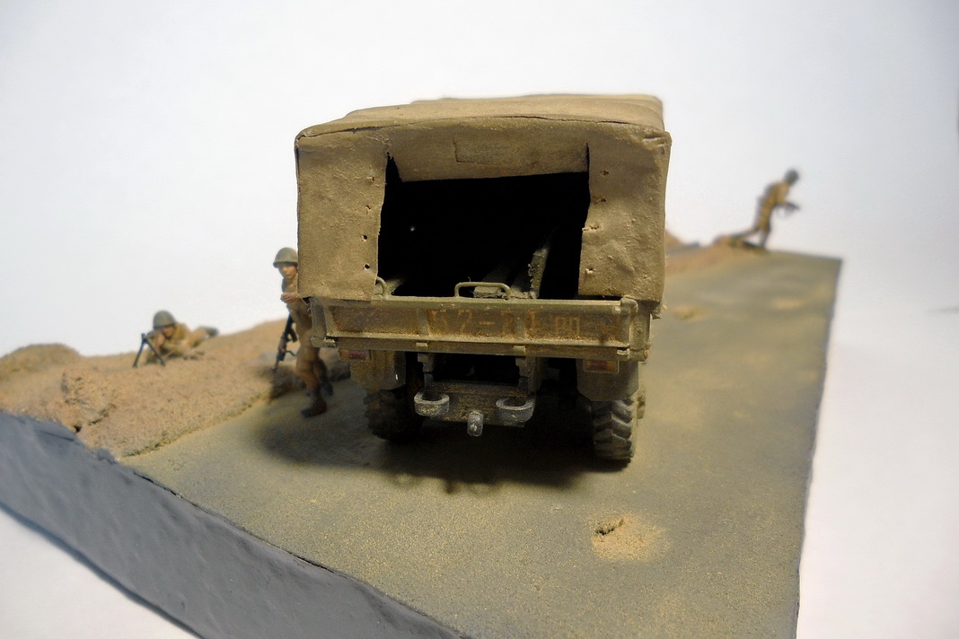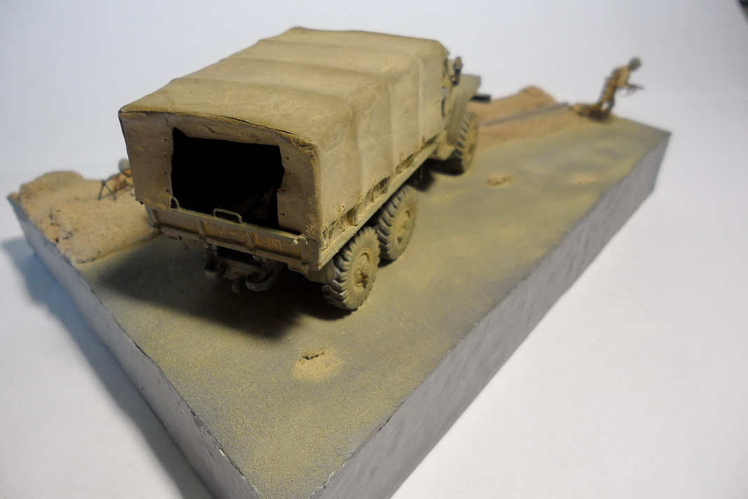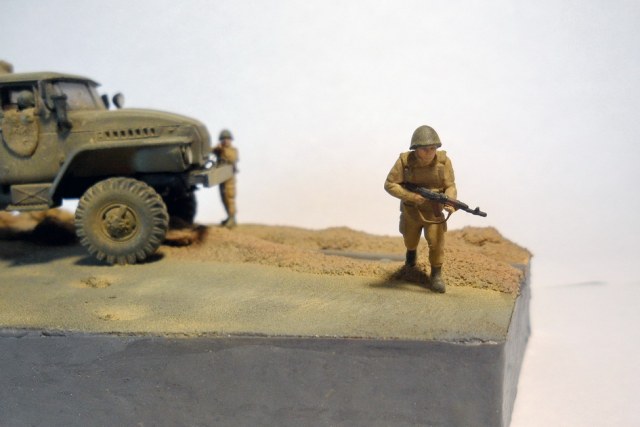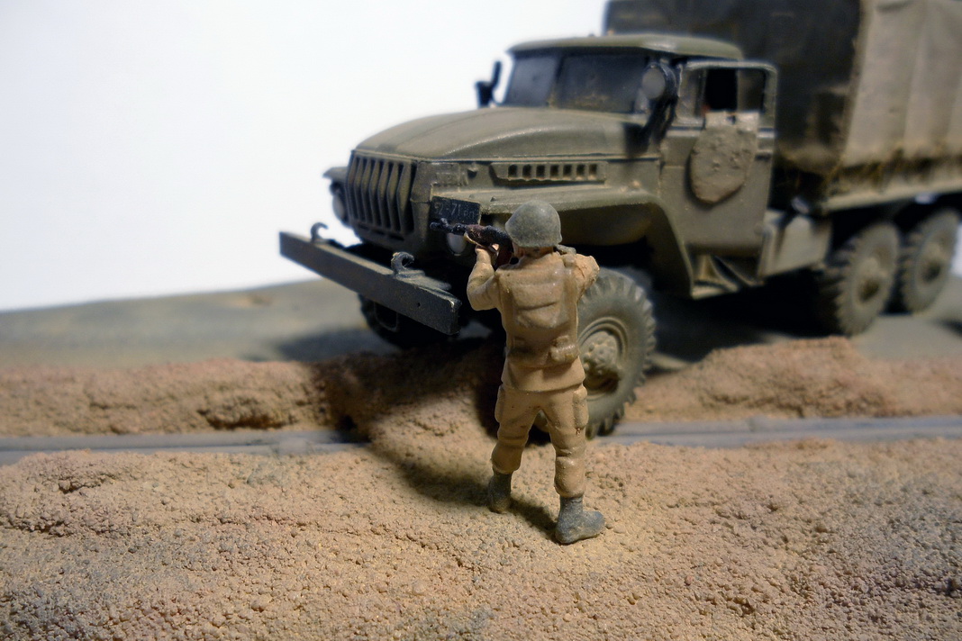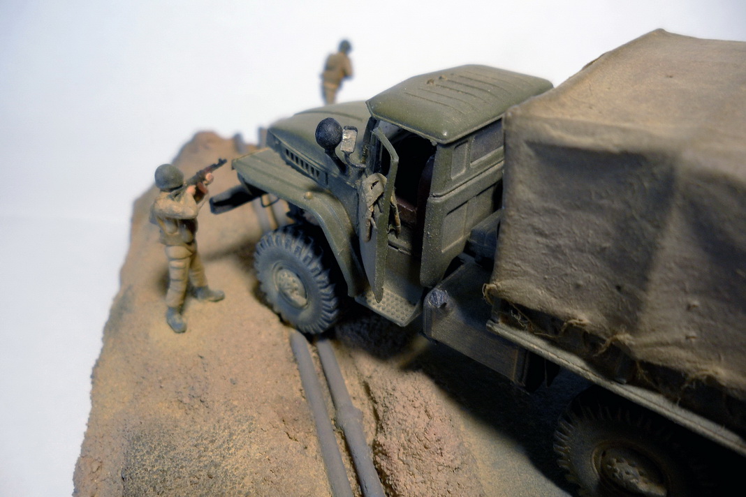 Урал-4320 от фирмы ICM. Из доработок: все поручни заменил на проволоку, сделал тент с каркасом, в кузове сделал скамейки. Фигурки - Звезда. Трубопровод ПМТП-150 из литника. Основание диорамы - пенопласт, асфальт из мелкой наждачки. Грузовик окрашивал тамиевским акрилом. Фигурки акрилом Vallejo и Мастер-акрилом Звезды. Все тонировалось пастелью.